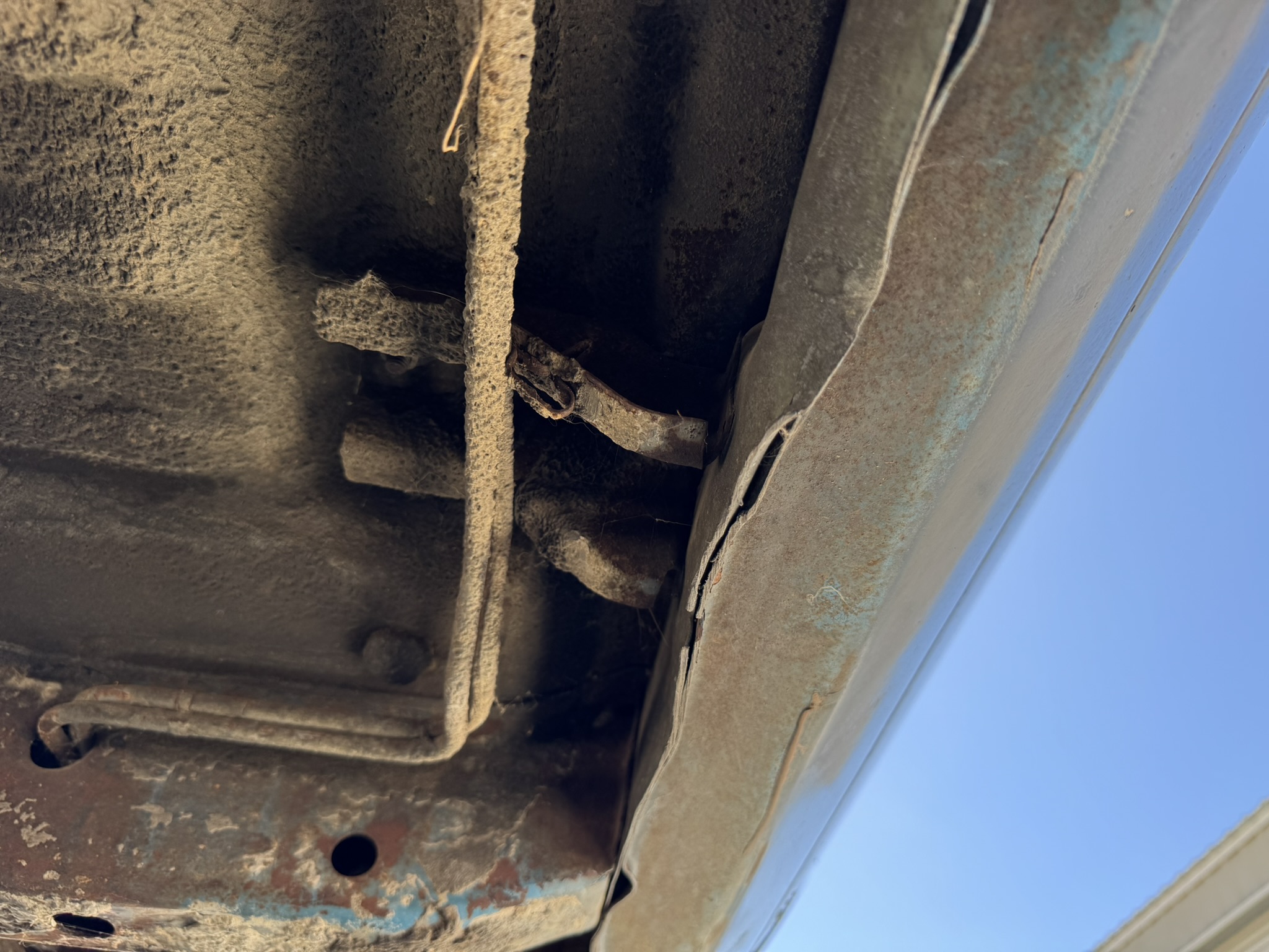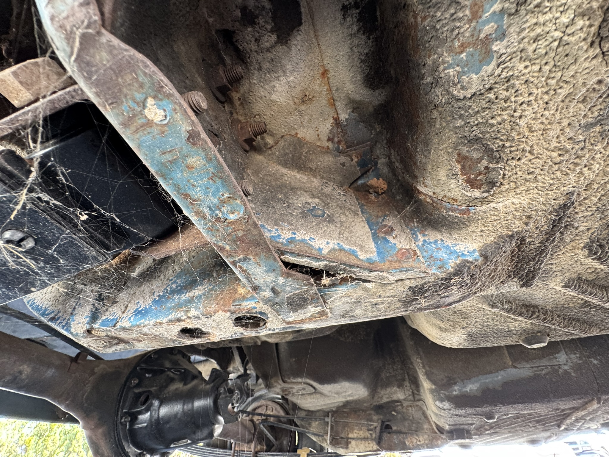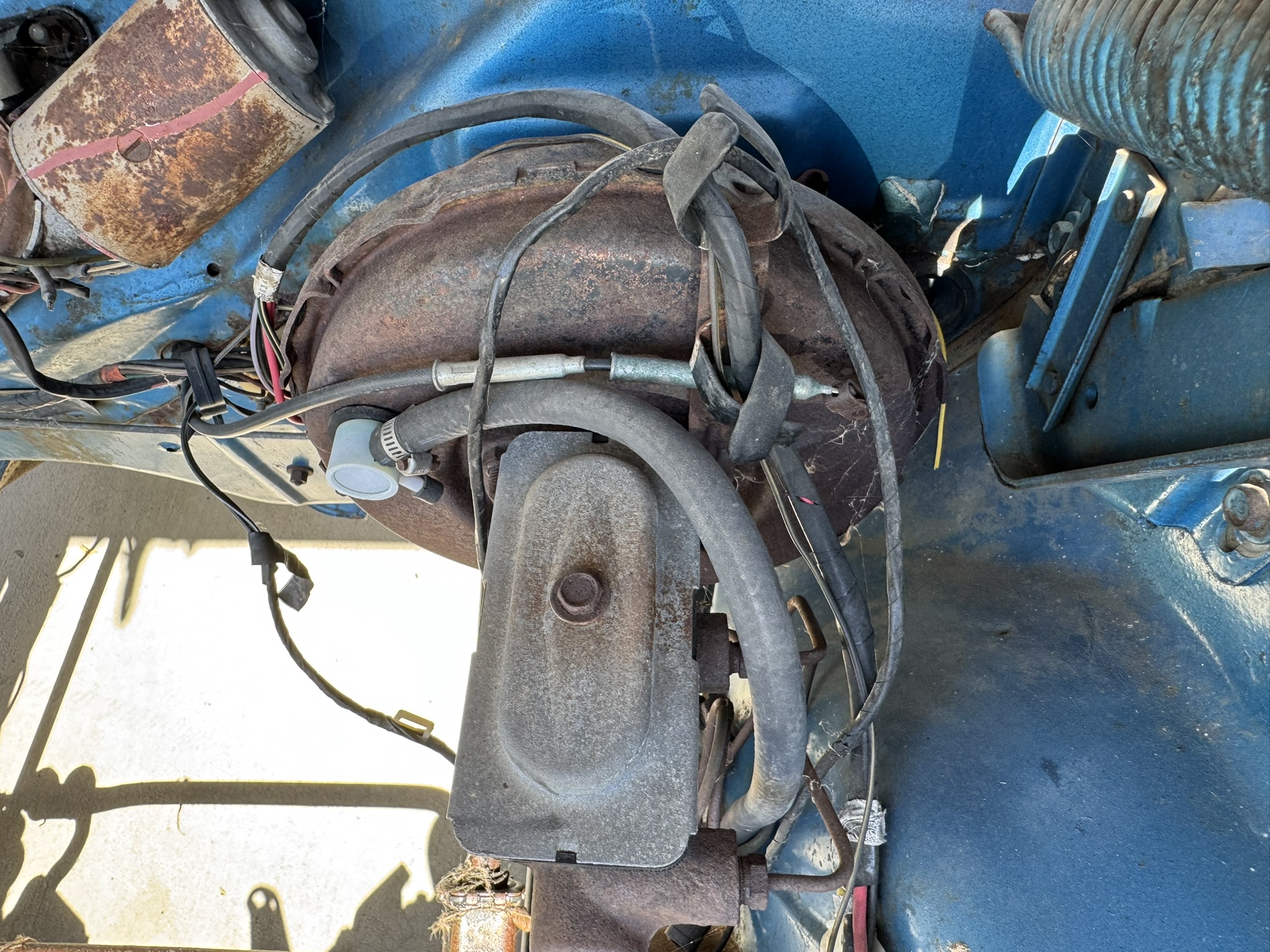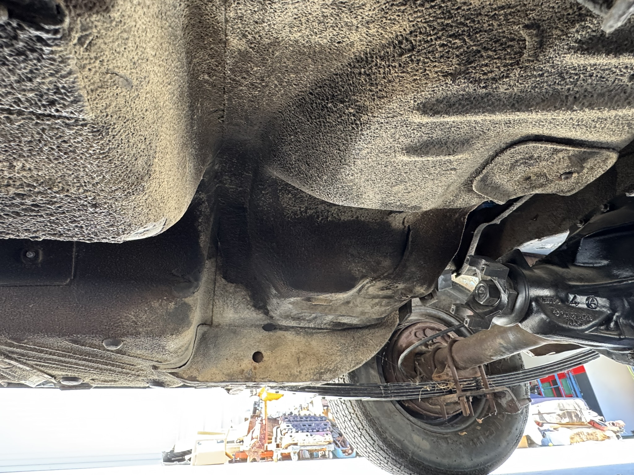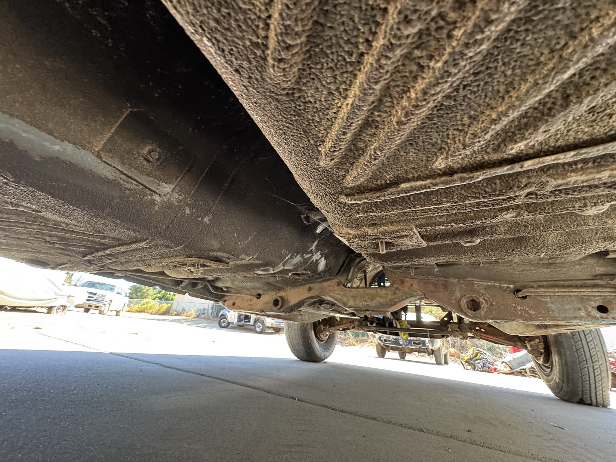 The missing Slant 6 and automatic transmission leave the drivetrain a blank slate. The 8 3/4 inch rear axle is ready for a performance makeover if desired. The drum brakes require a full inspection including shoes, lines, and hardware, or upgrade to disc brakes. Suspension bushings and shocks should be checked and replaced as necessary. The factory fuel tank and filler neck will need to be installed along with new rubber lines. A driveshaft and battery are needed. The tires are rollers enough for transport and storage, but need to be replaced.