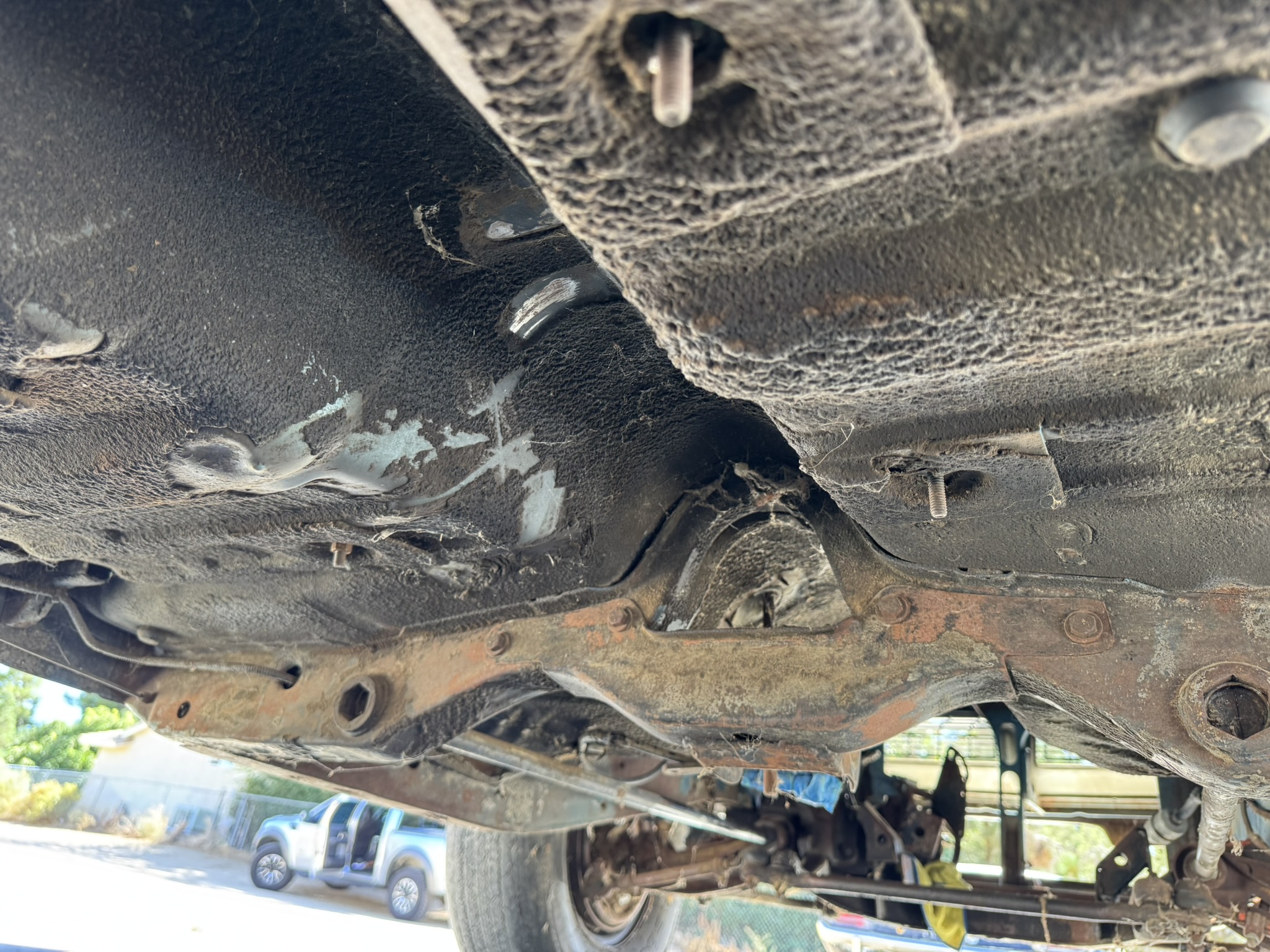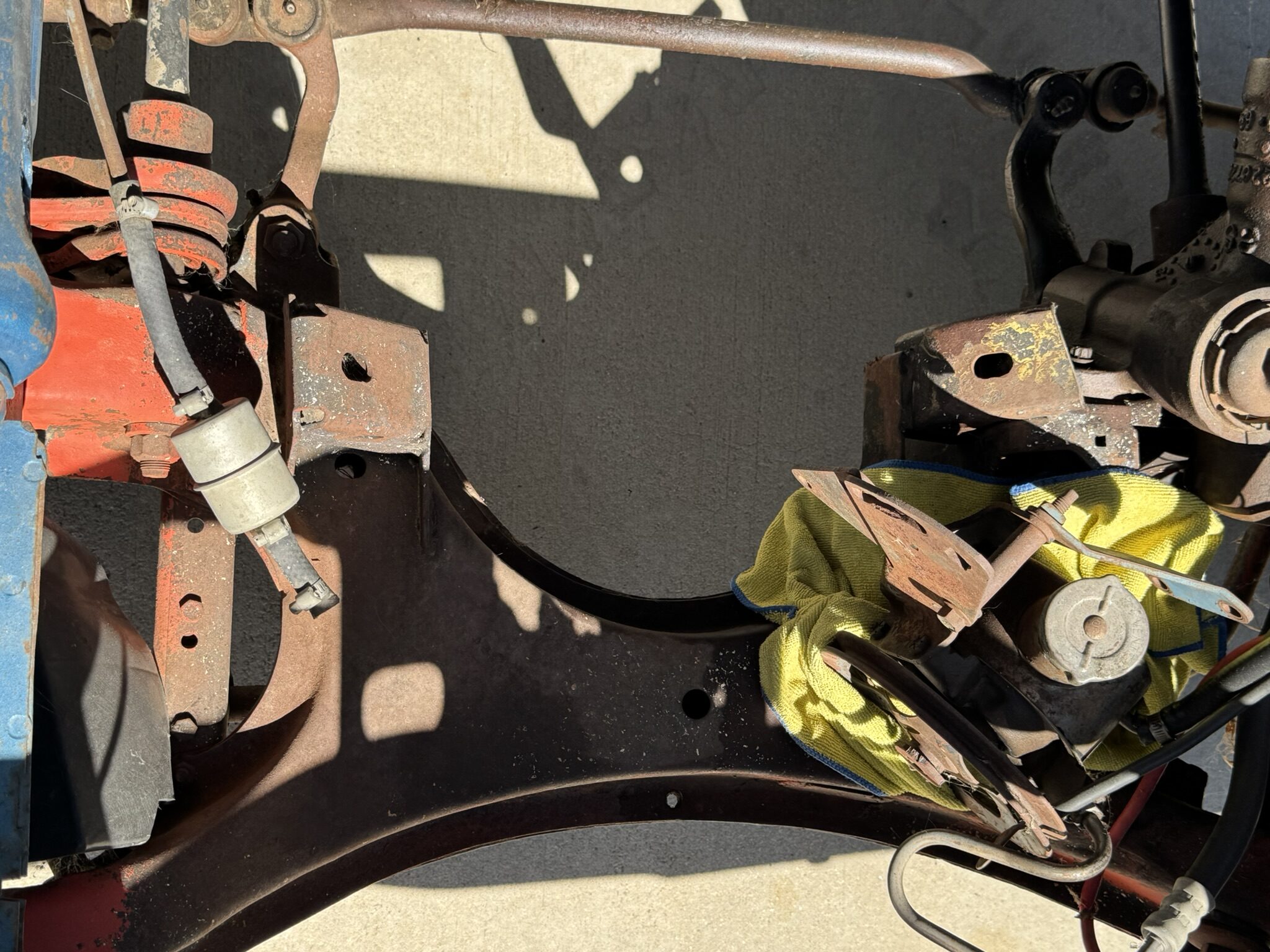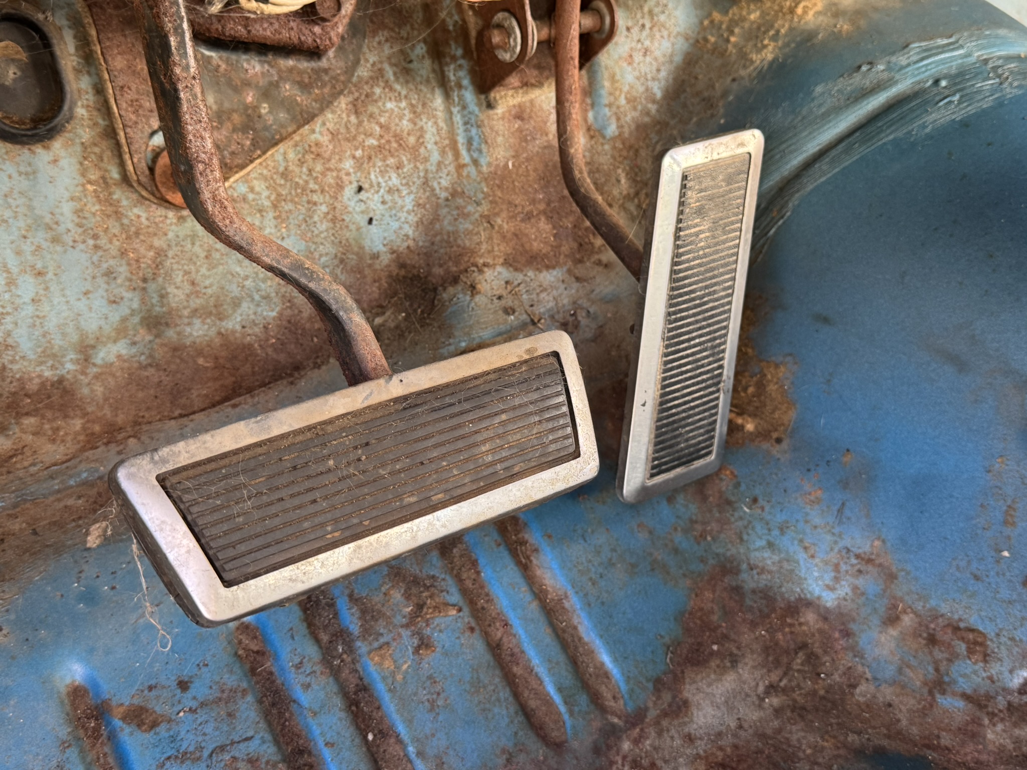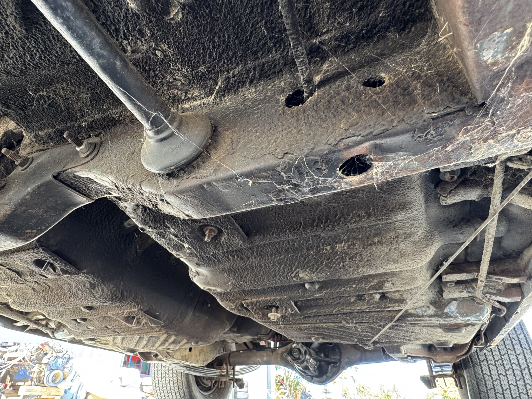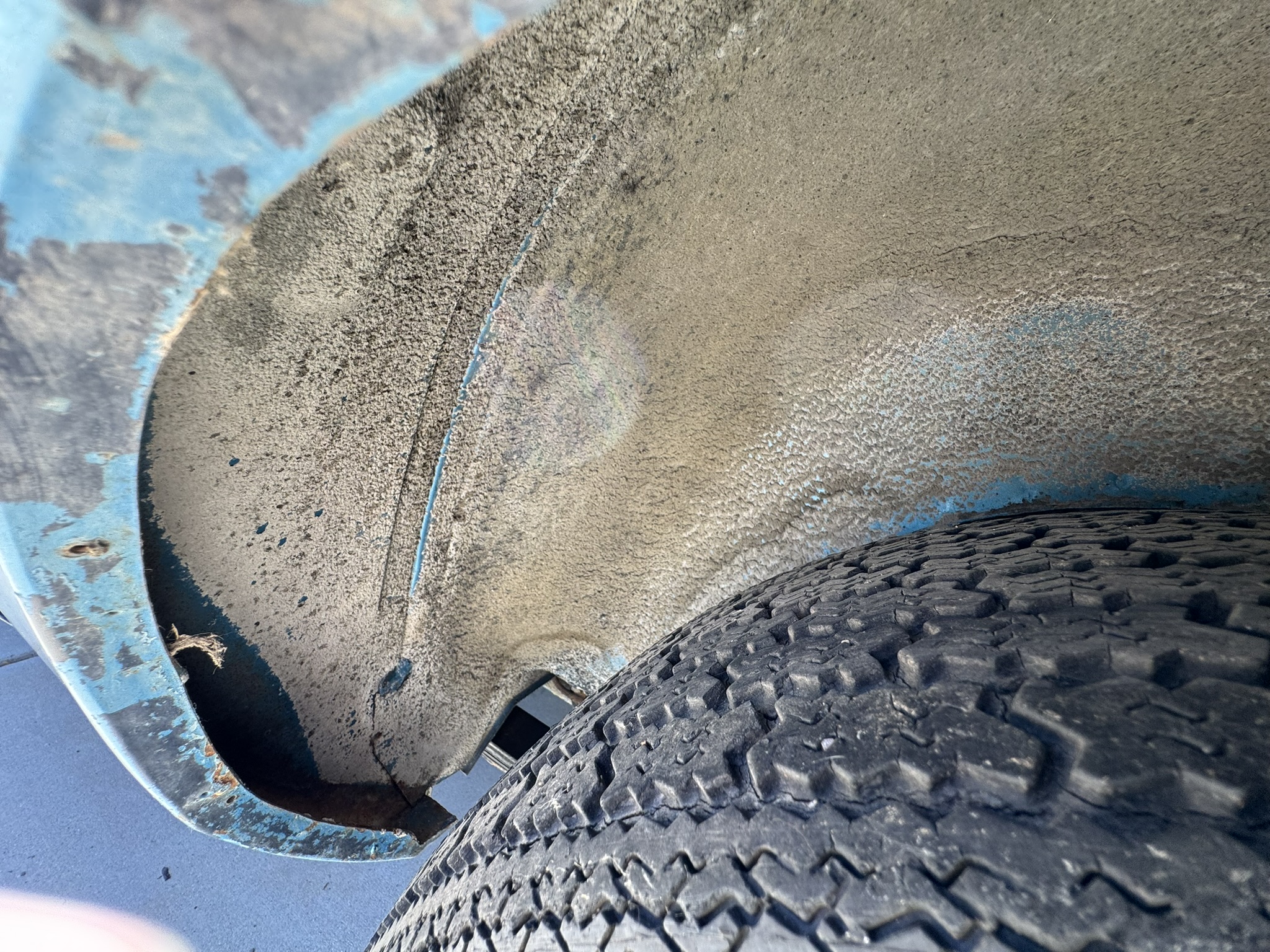The missing Slant 6 and automatic transmission leave the drivetrain a blank slate. The 8 3/4 inch rear axle is ready for a performance makeover if desired. The drum brakes require a full inspection including shoes, lines, and hardware, or upgrade to disc brakes. Suspension bushings and shocks should be checked and replaced as necessary. The factory fuel tank and filler neck will need to be installed along with new rubber lines. A driveshaft and battery are needed. The tires are rollers enough for transport and storage, but need to be replaced.