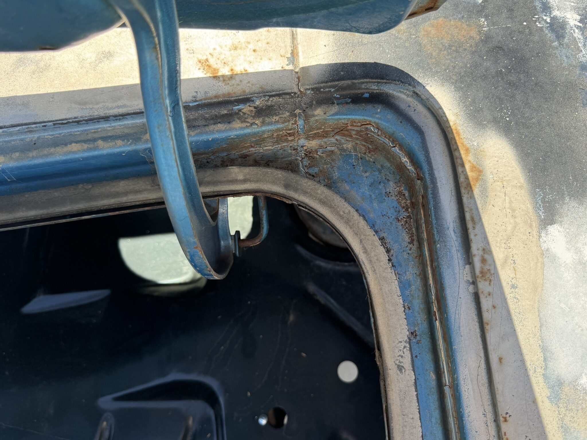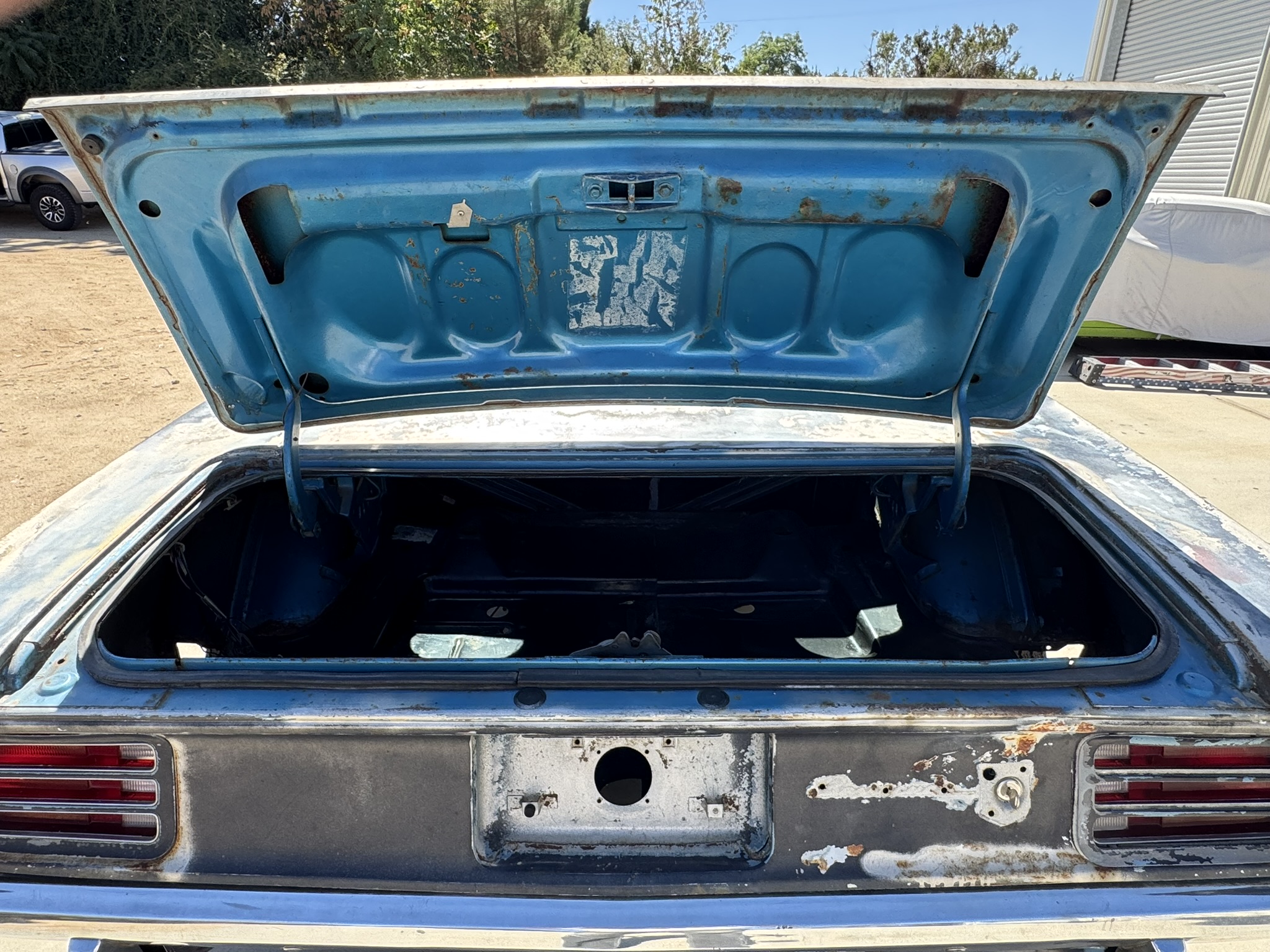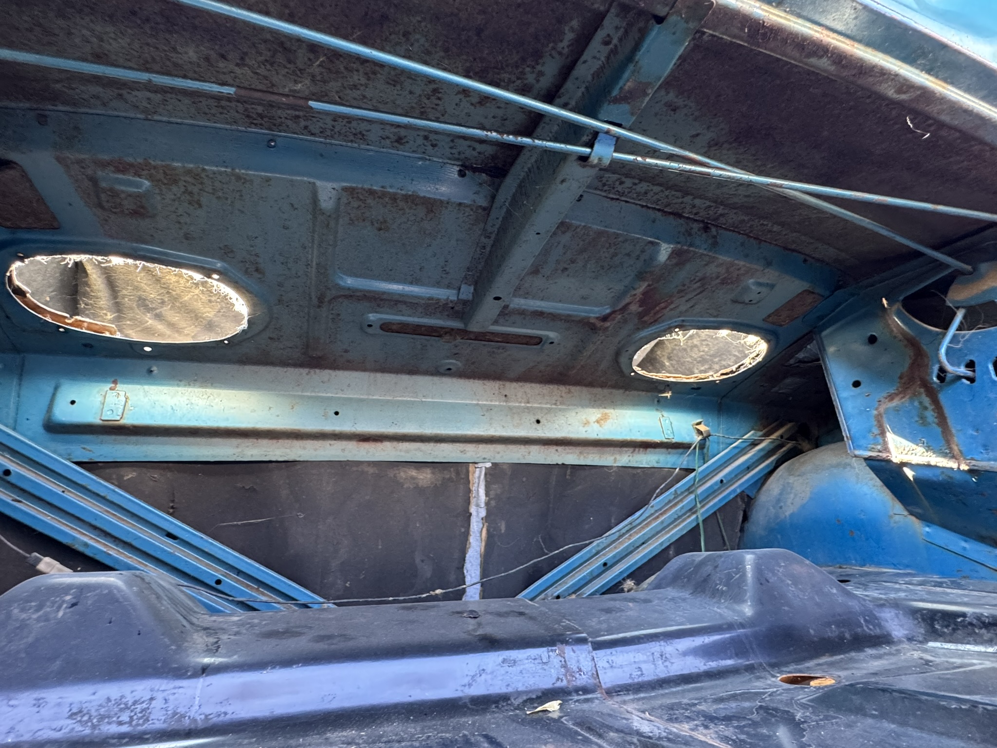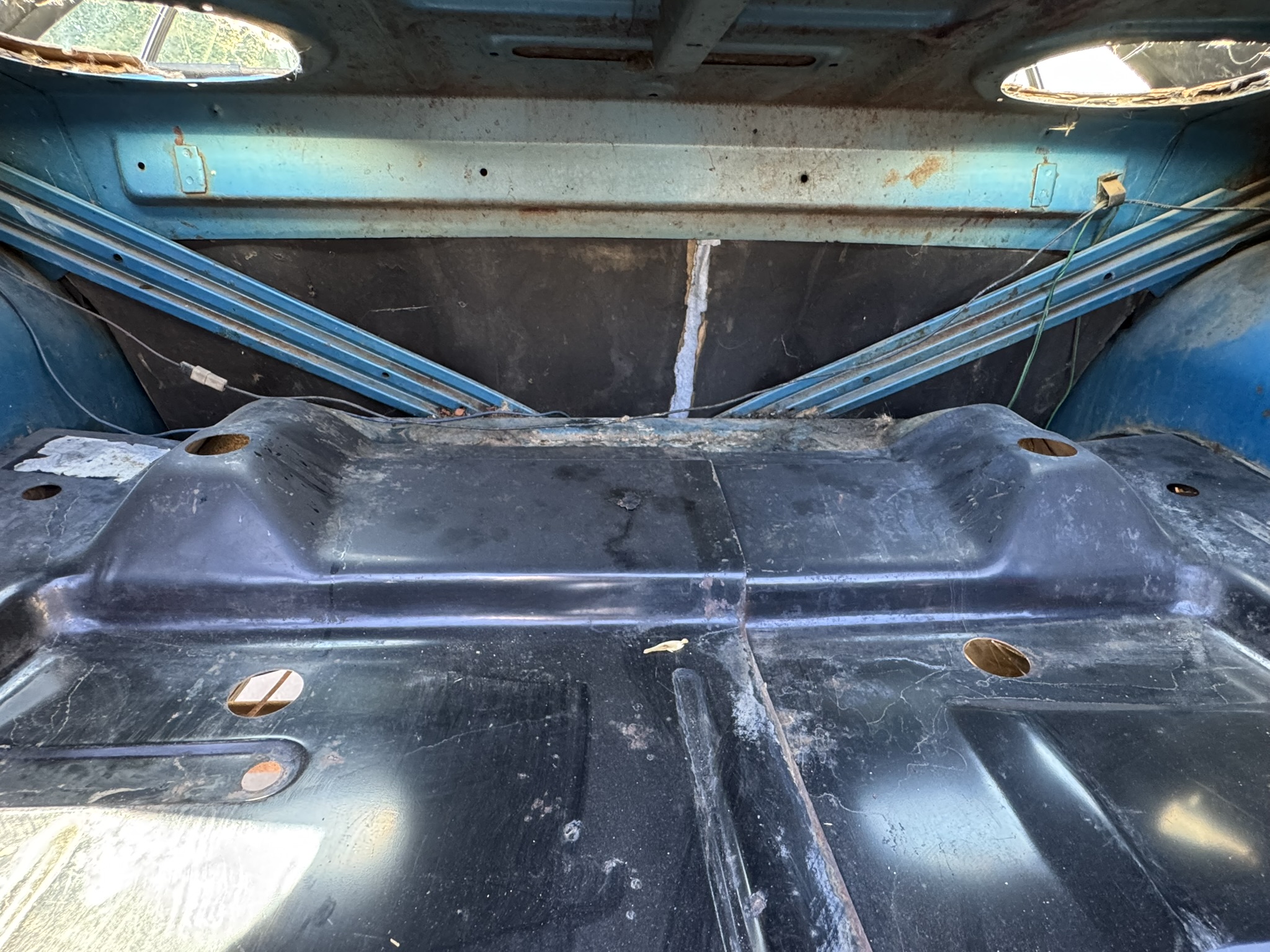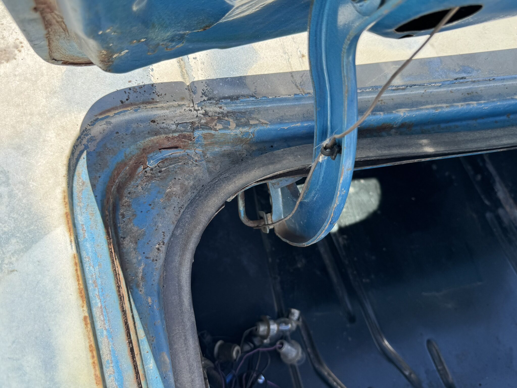 Finished originally in B5 Bright Blue Poly, the original paint can still be seen in many areas on the car. The only bondo identified on the car is a small section on the passenger side quarter panel towards the tail. Both factory bumpers are in place and in very good condition. The hood is from a donor car, which opens, closes, and latches easily. The rest of the body is original sheet metal. The factory fender turn signals are in place. This car has the correct options to allow for a shaker hood, such as the 3 speed wiper motor. The doors and trunk close nicely, only requiring minor adjustment. The rust is minimal and limited to the passenger side lower quarter panel. There was a patch panel started on the same quarter panel that will need finishing. The trunk floor has been cut out even though it wasn't very rusty and a new trunk floor has been set in place. New trunk floor extensions are included as well. The grill and headlight buckets are original, all in great condition. All of the factory tinted glass is in place with the windshield showing scratches from windshield wipers without blades.