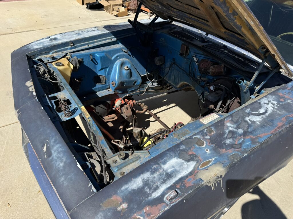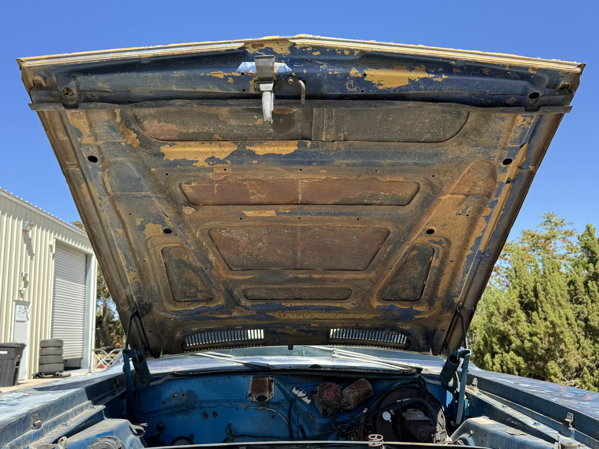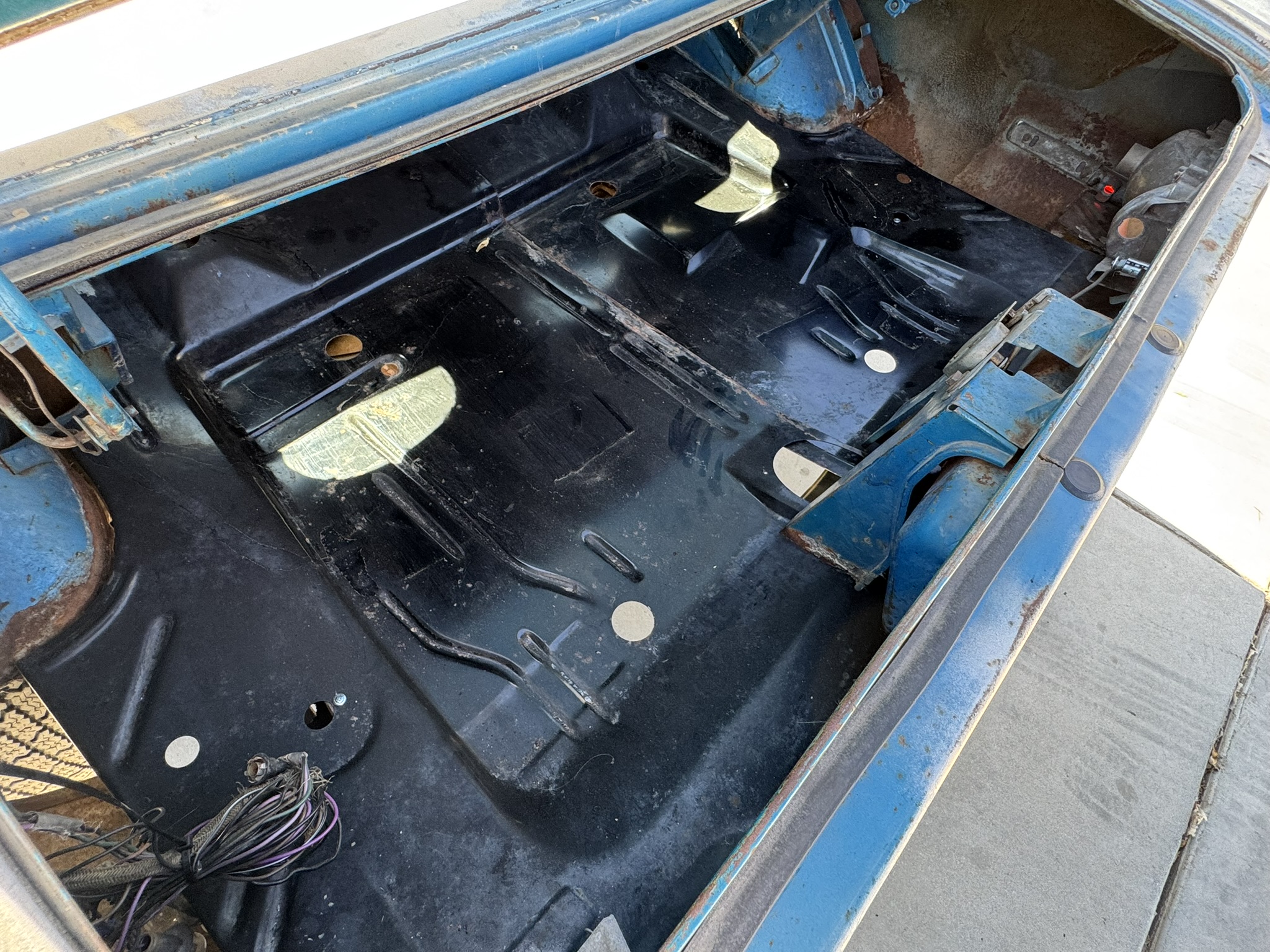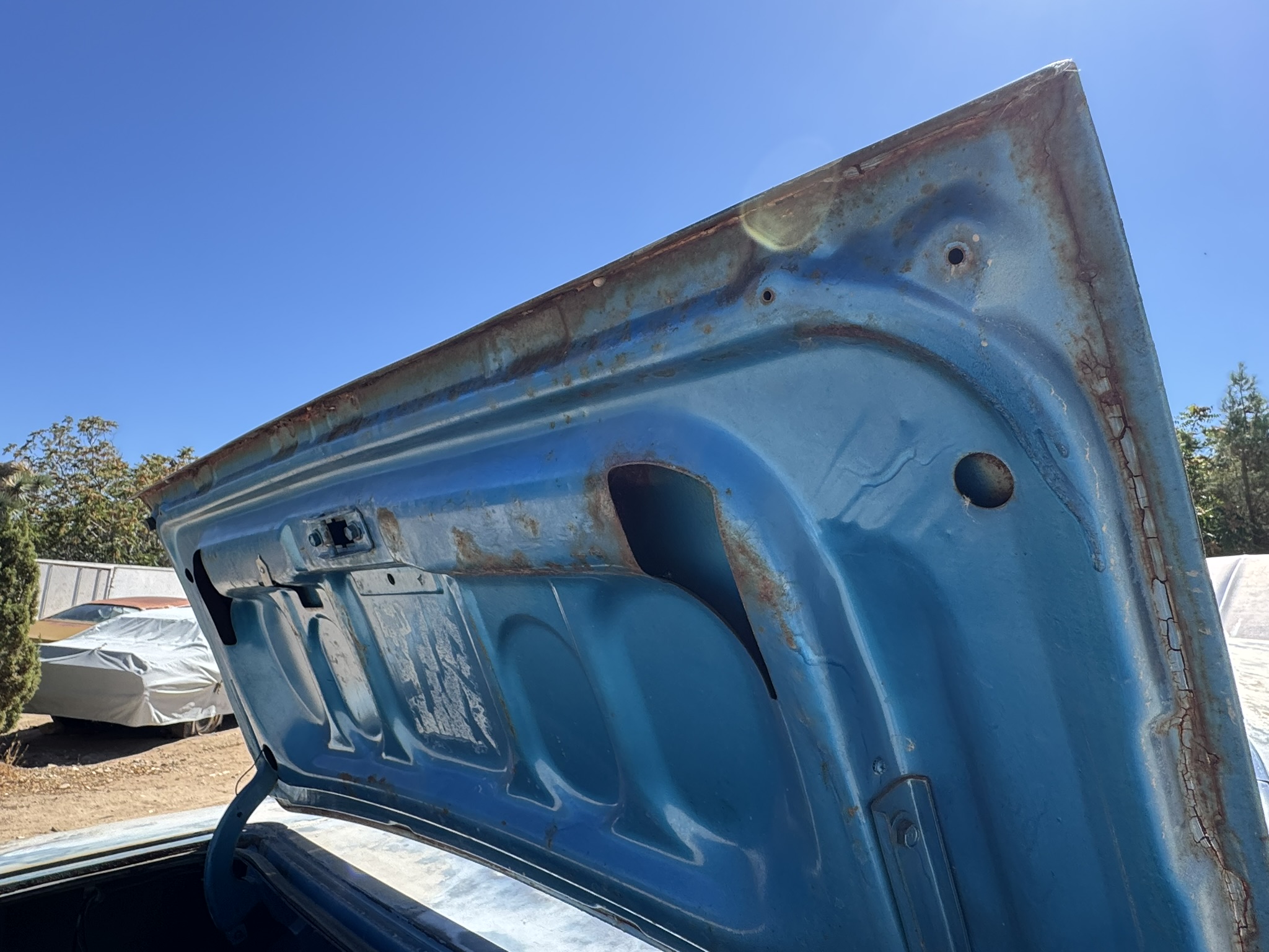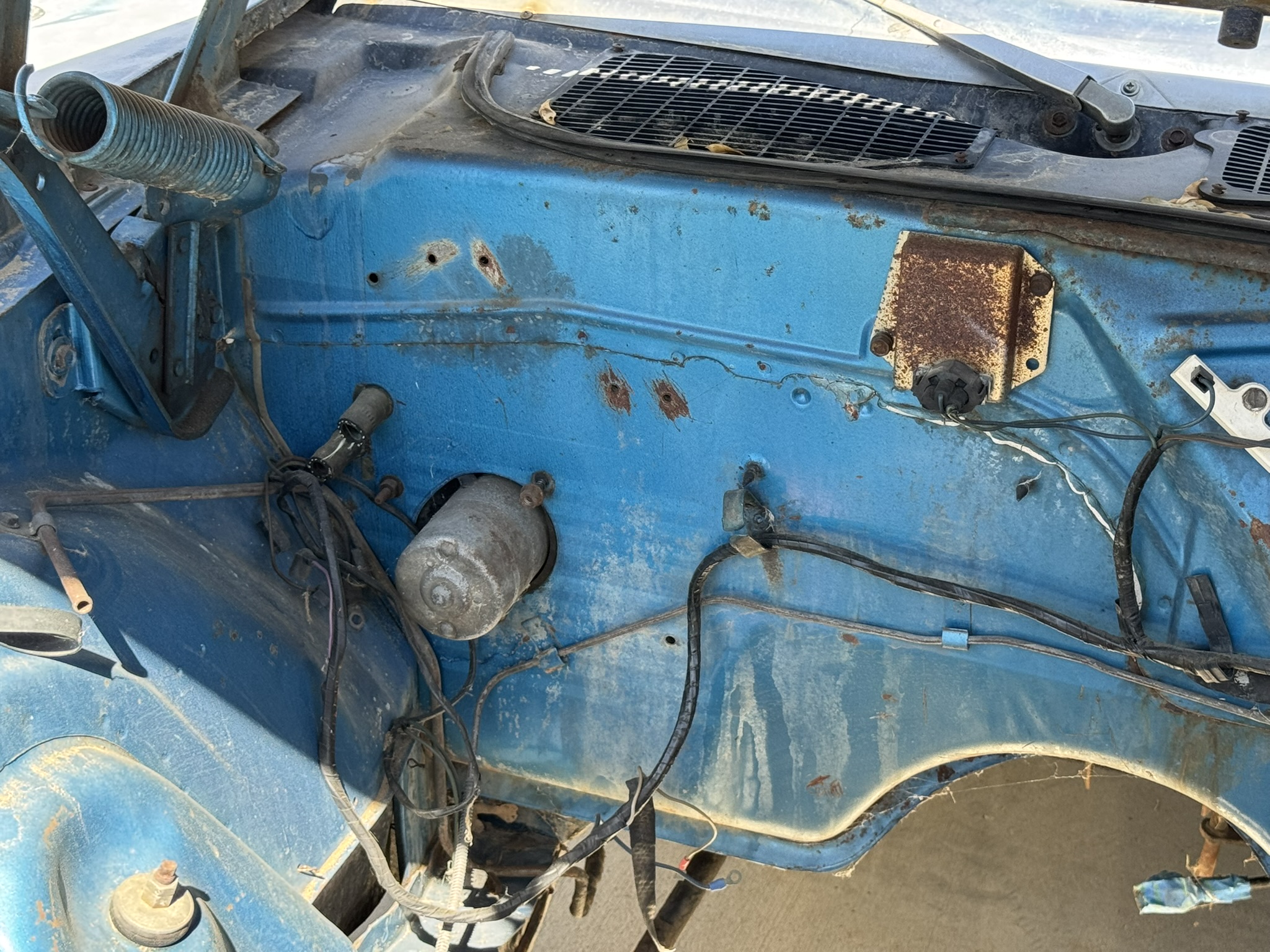 Finished originally in B5 Bright Blue Poly, the original paint can still be seen in many areas on the car. The only bondo identified on the car is a small section on the passenger side quarter panel towards the tail. Both factory bumpers are in place and in very good condition. The hood is from a donor car, which opens, closes, and latches easily. The rest of the body is original sheet metal. The factory fender turn signals are in place. This car has the correct options to allow for a shaker hood, such as the 3 speed wiper motor. The doors and trunk close nicely, only requiring minor adjustment. The rust is minimal and limited to the passenger side lower quarter panel. There was a patch panel started on the same quarter panel that will need finishing. The trunk floor has been cut out even though it wasn't very rusty and a new trunk floor has been set in place. New trunk floor extensions are included as well. The grill and headlight buckets are original, all in great condition. All of the factory tinted glass is in place with the windshield showing scratches from windshield wipers without blades.