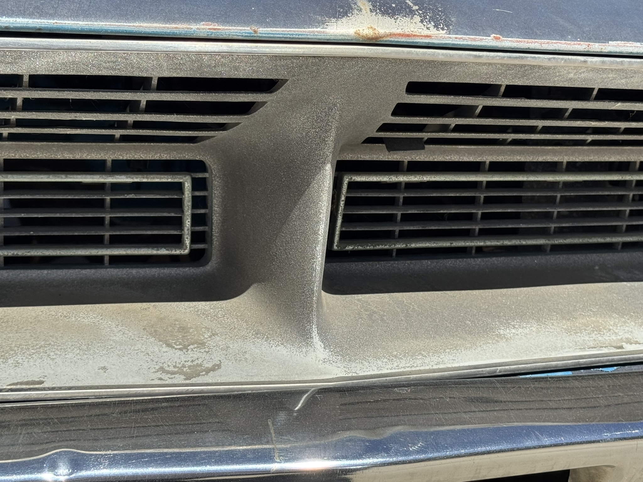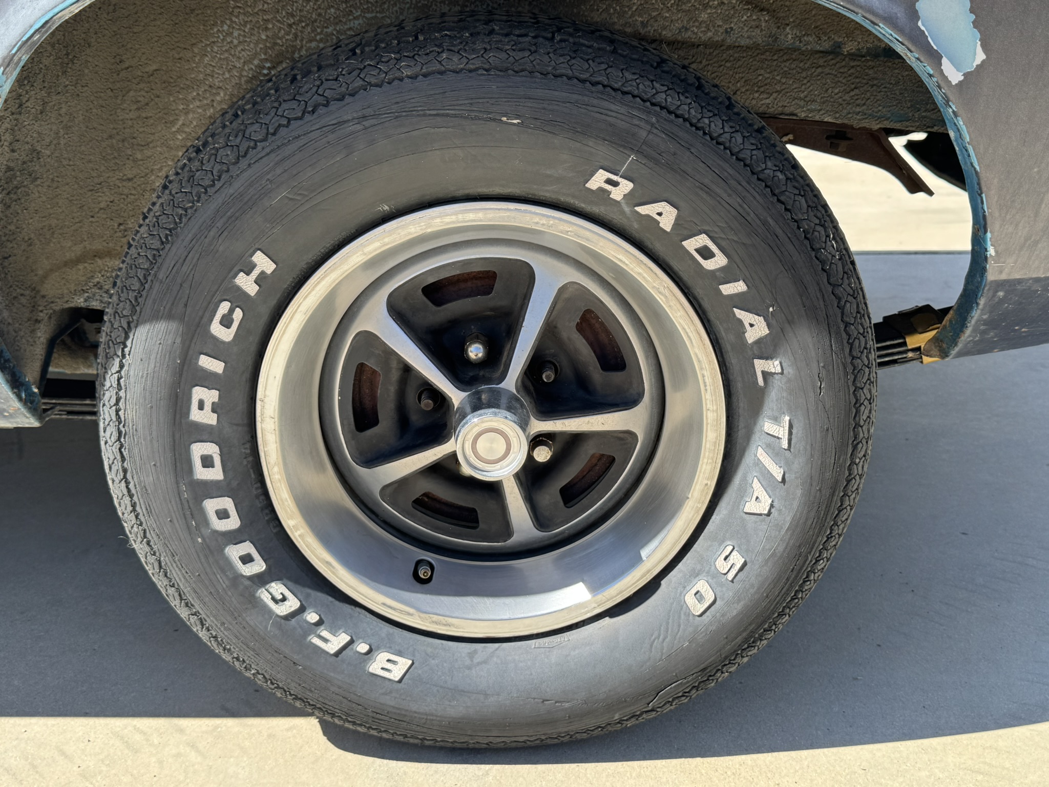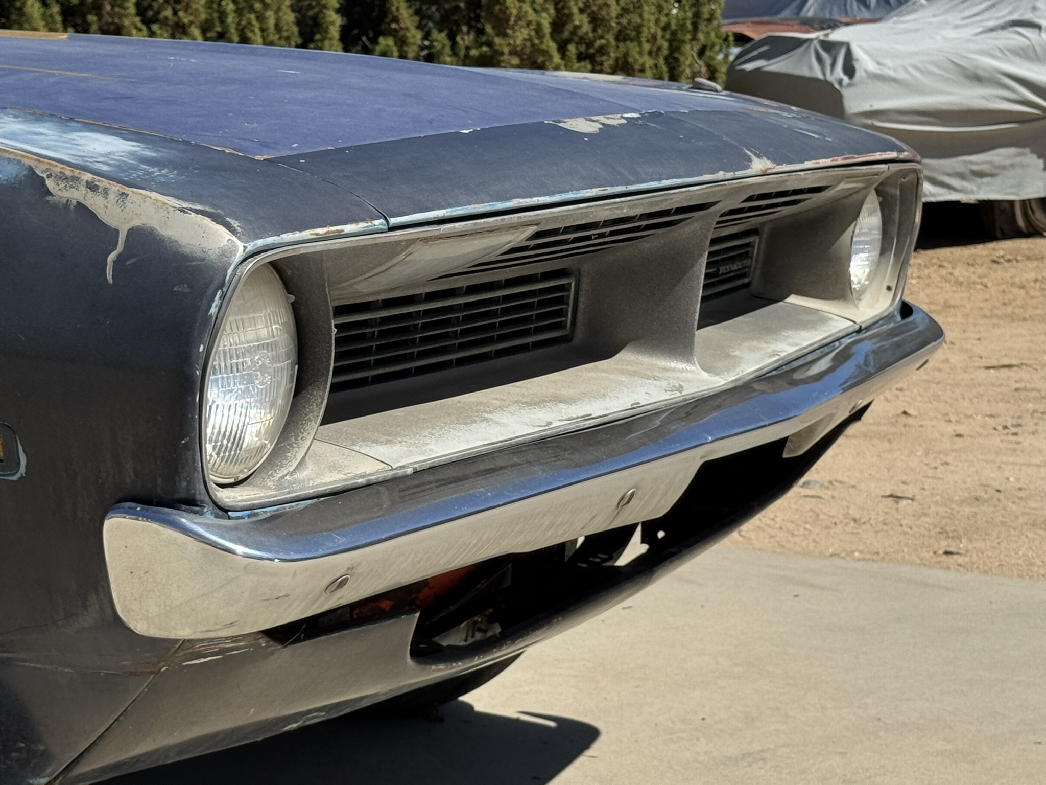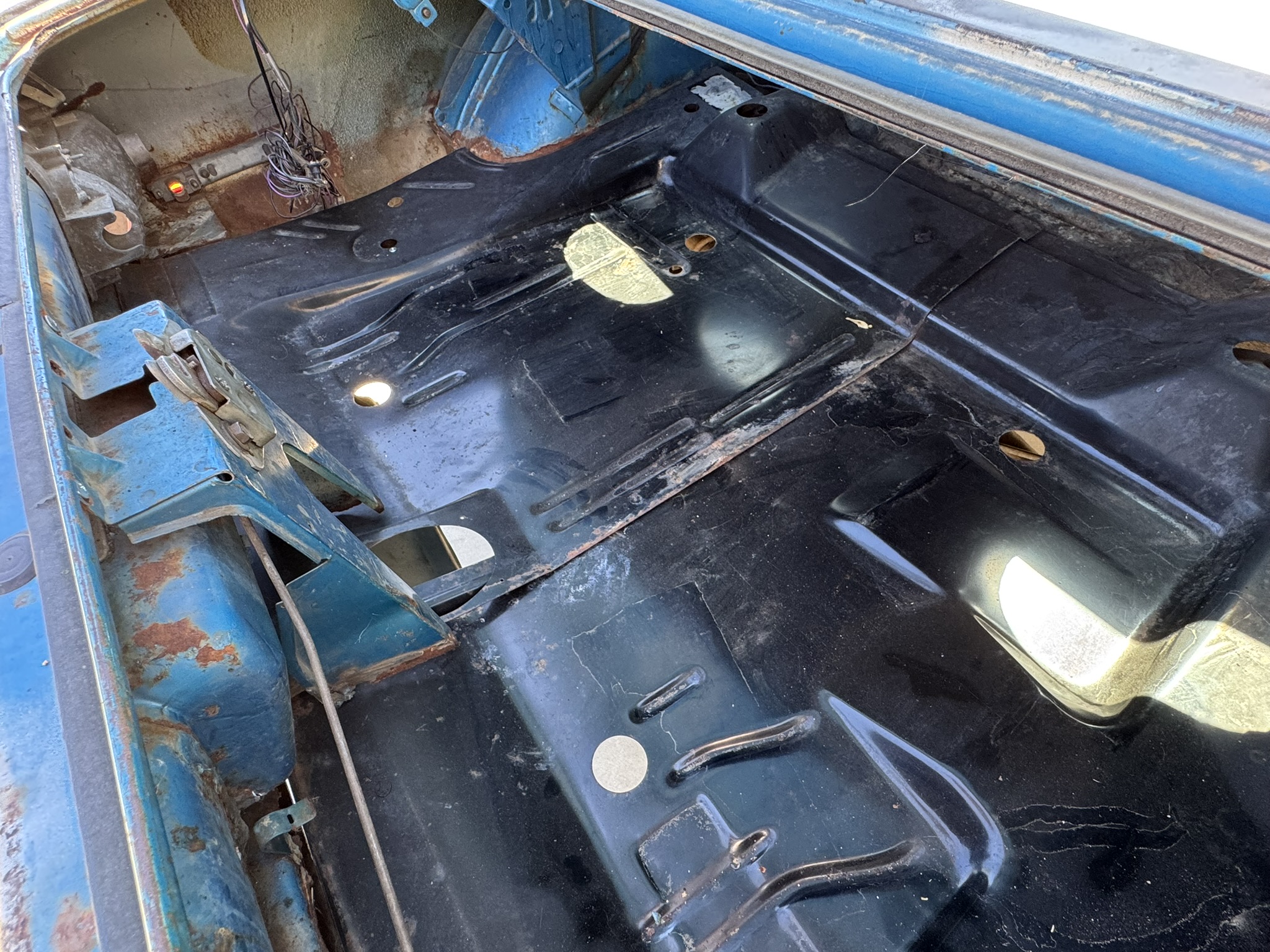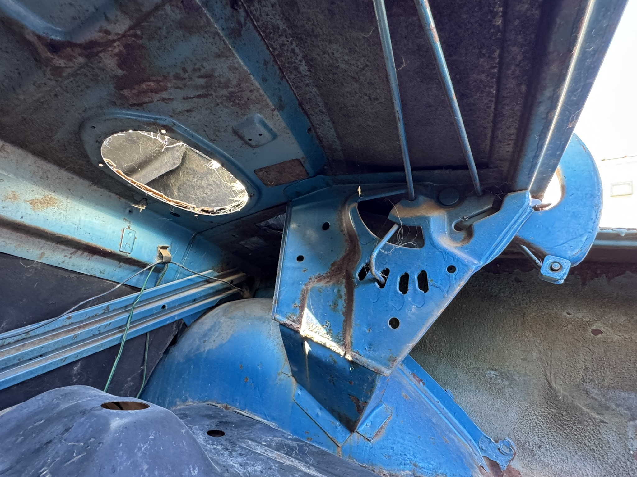 Finished originally in B5 Bright Blue Poly, the original paint can still be seen in many areas on the car. The only bondo identified on the car is a small section on the passenger side quarter panel towards the tail. Both factory bumpers are in place and in very good condition. The hood is from a donor car, which opens, closes, and latches easily. The rest of the body is original sheet metal. The factory fender turn signals are in place. This car has the correct options to allow for a shaker hood, such as the 3 speed wiper motor. The doors and trunk close nicely, only requiring minor adjustment. The rust is minimal and limited to the passenger side lower quarter panel. There was a patch panel started on the same quarter panel that will need finishing. The trunk floor has been cut out even though it wasn't very rusty and a new trunk floor has been set in place. New trunk floor extensions are included as well. The grill and headlight buckets are original, all in great condition. All of the factory tinted glass is in place with the windshield showing scratches from windshield wipers without blades.