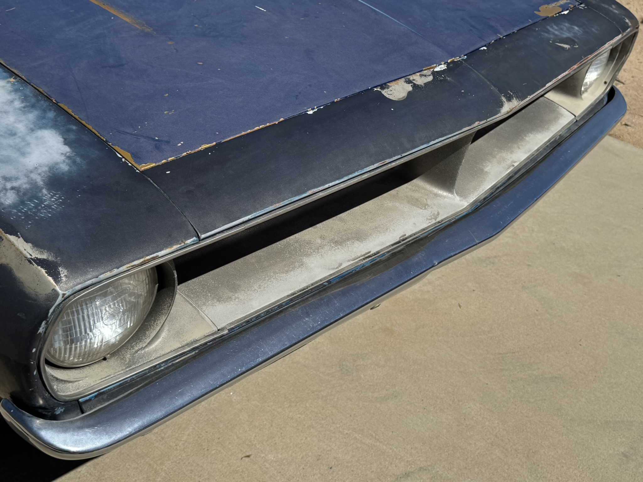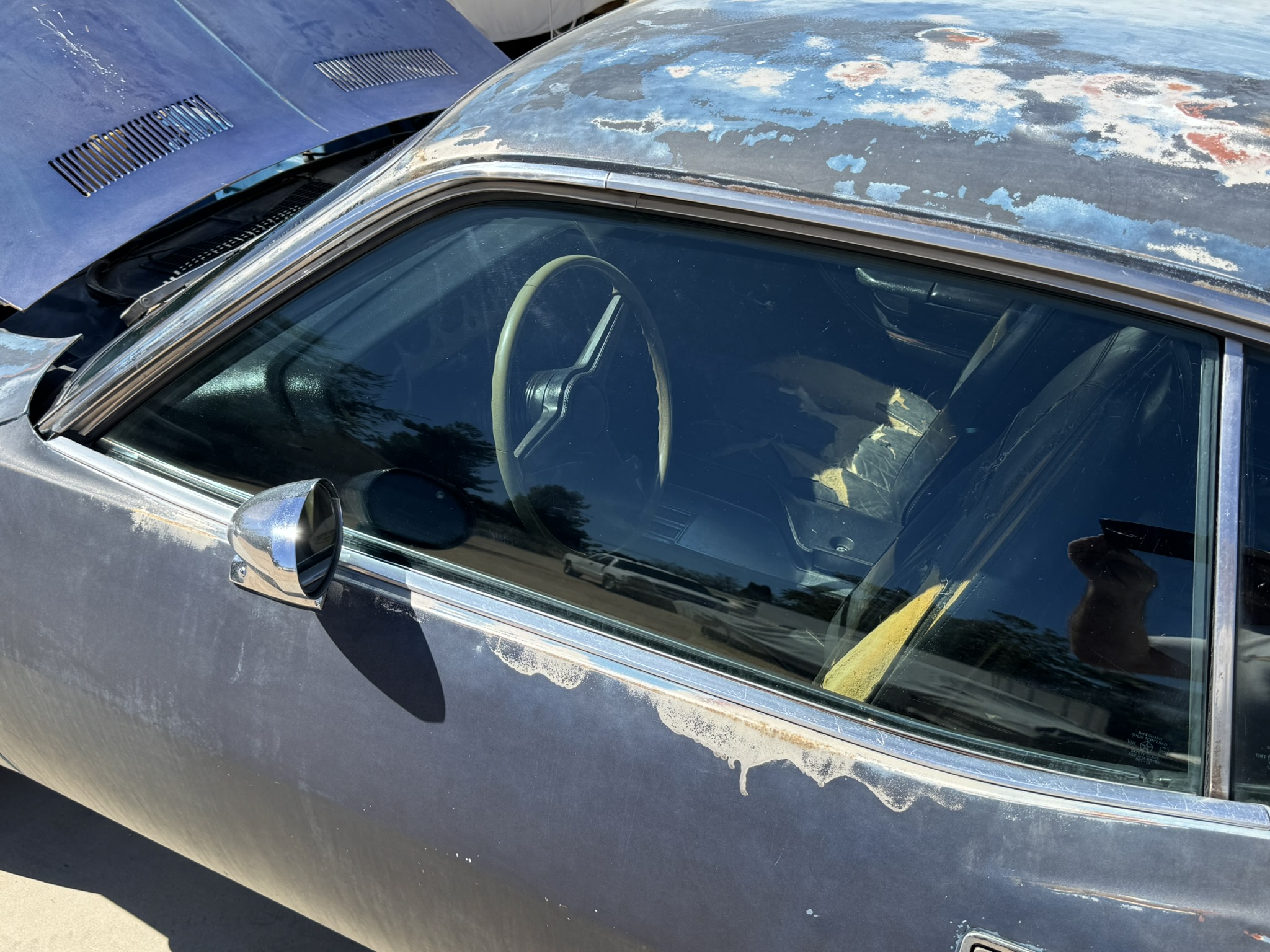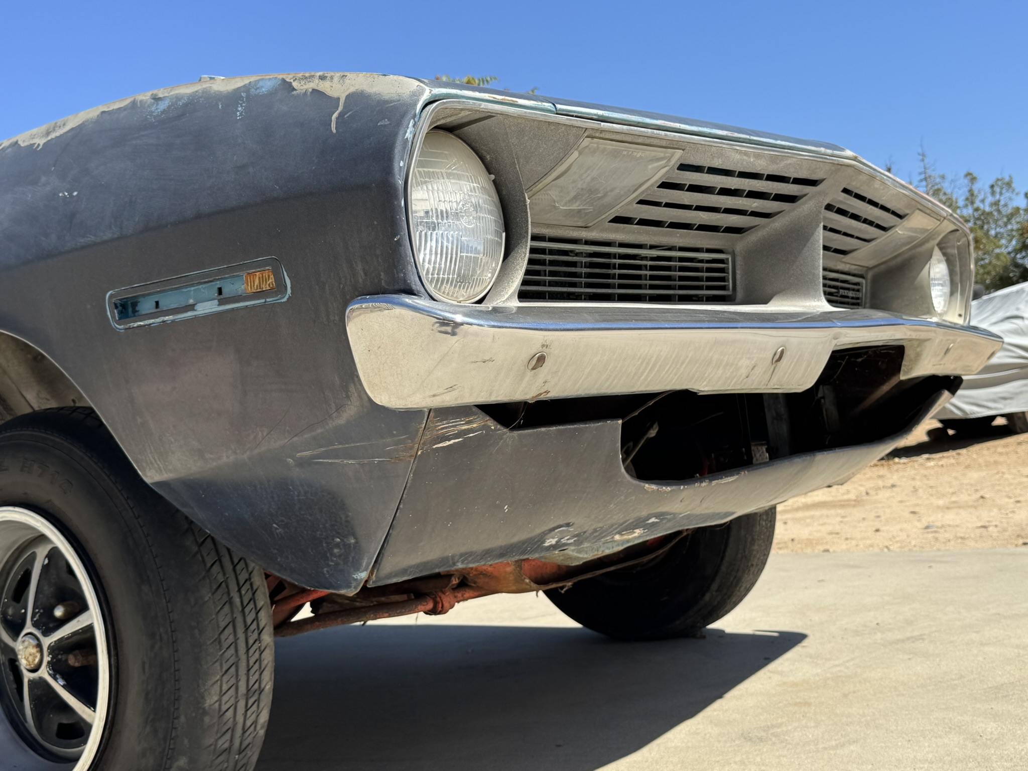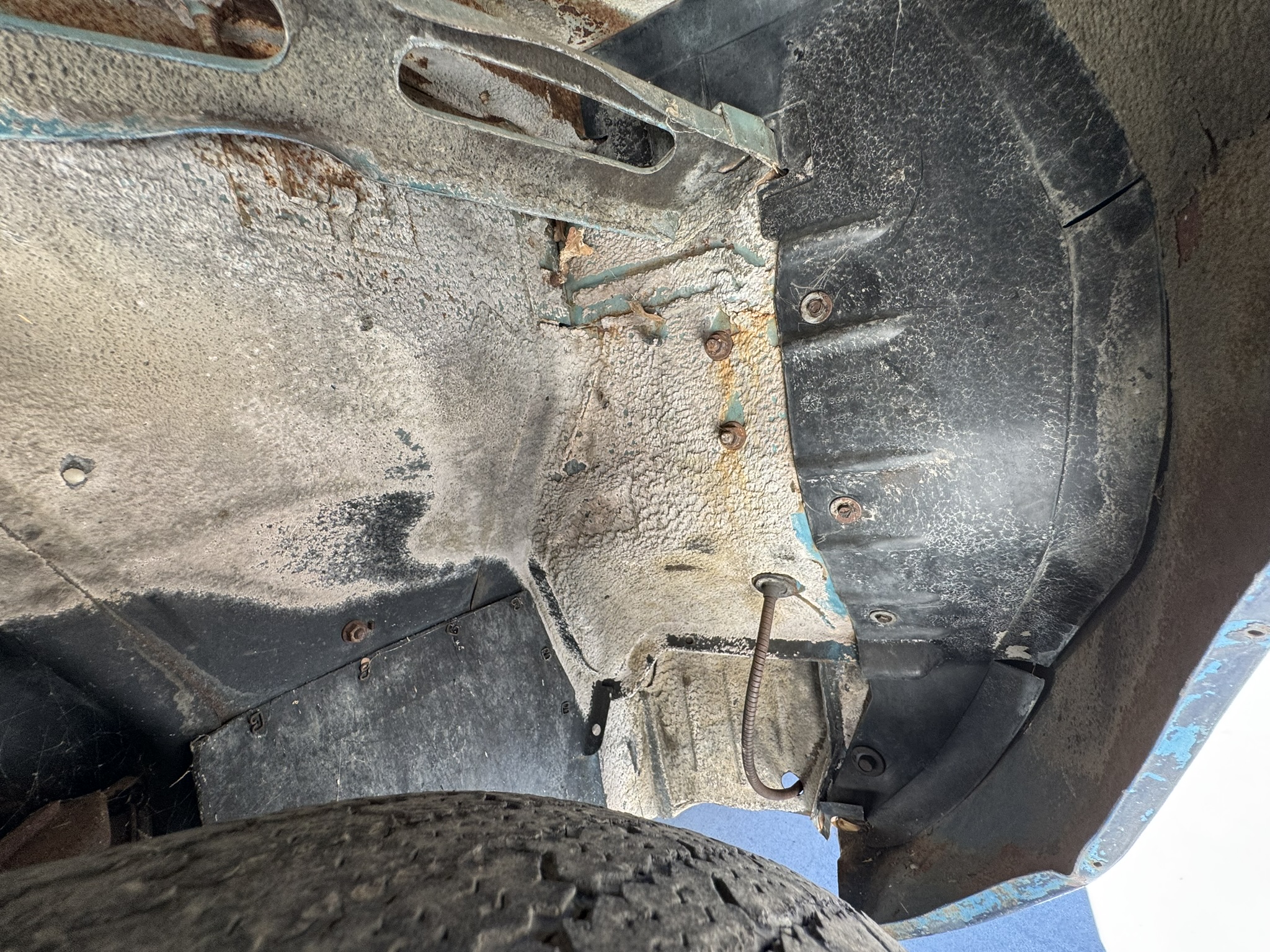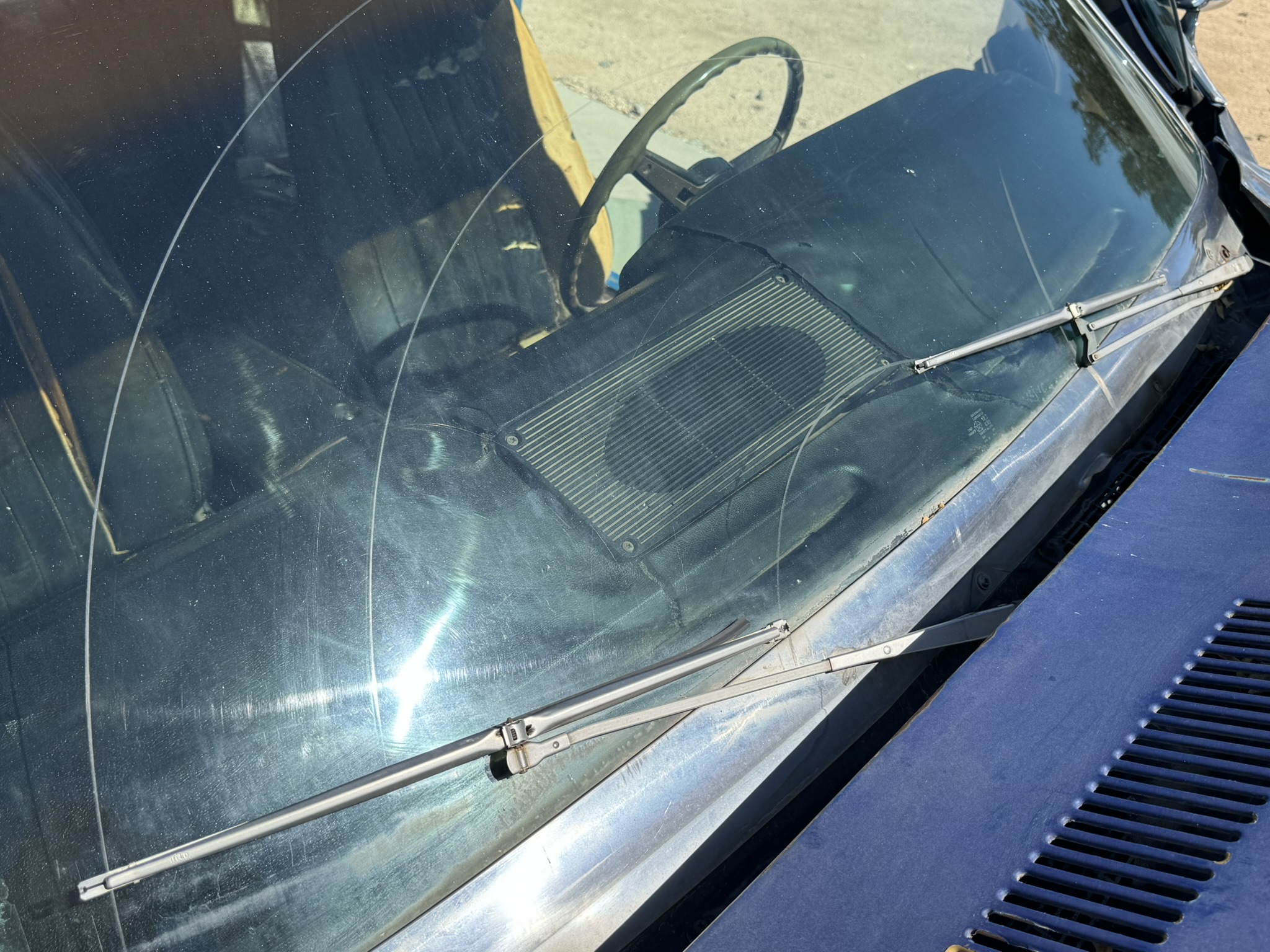 Finished originally in B5 Bright Blue Poly, the original paint can still be seen in many areas on the car. The only bondo identified on the car is a small section on the passenger side quarter panel towards the tail. Both factory bumpers are in place and in very good condition. The hood is from a donor car, which opens, closes, and latches easily. The rest of the body is original sheet metal. The factory fender turn signals are in place. This car has the correct options to allow for a shaker hood, such as the 3 speed wiper motor. The doors and trunk close nicely, only requiring minor adjustment. The rust is minimal and limited to the passenger side lower quarter panel. There was a patch panel started on the same quarter panel that will need finishing. The trunk floor has been cut out even though it wasn't very rusty and a new trunk floor has been set in place. New trunk floor extensions are included as well. The grill and headlight buckets are original, all in great condition. All of the factory tinted glass is in place with the windshield showing scratches from windshield wipers without blades.