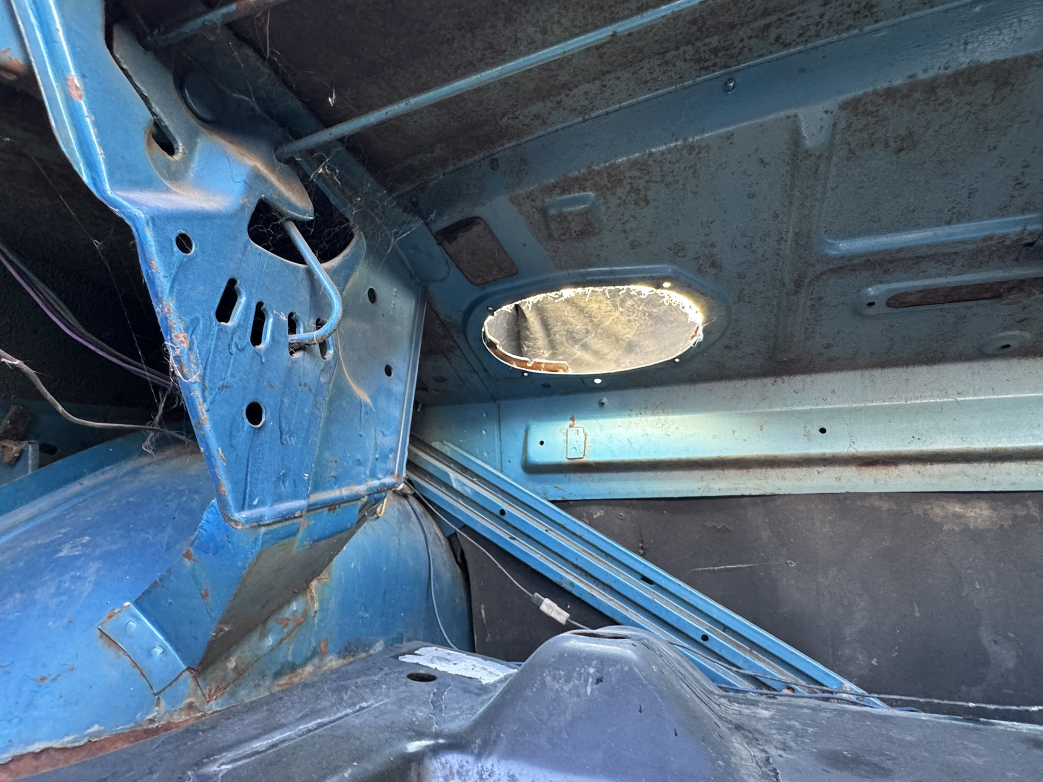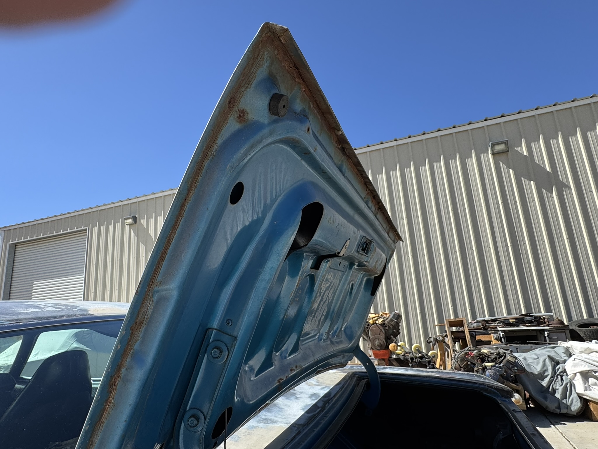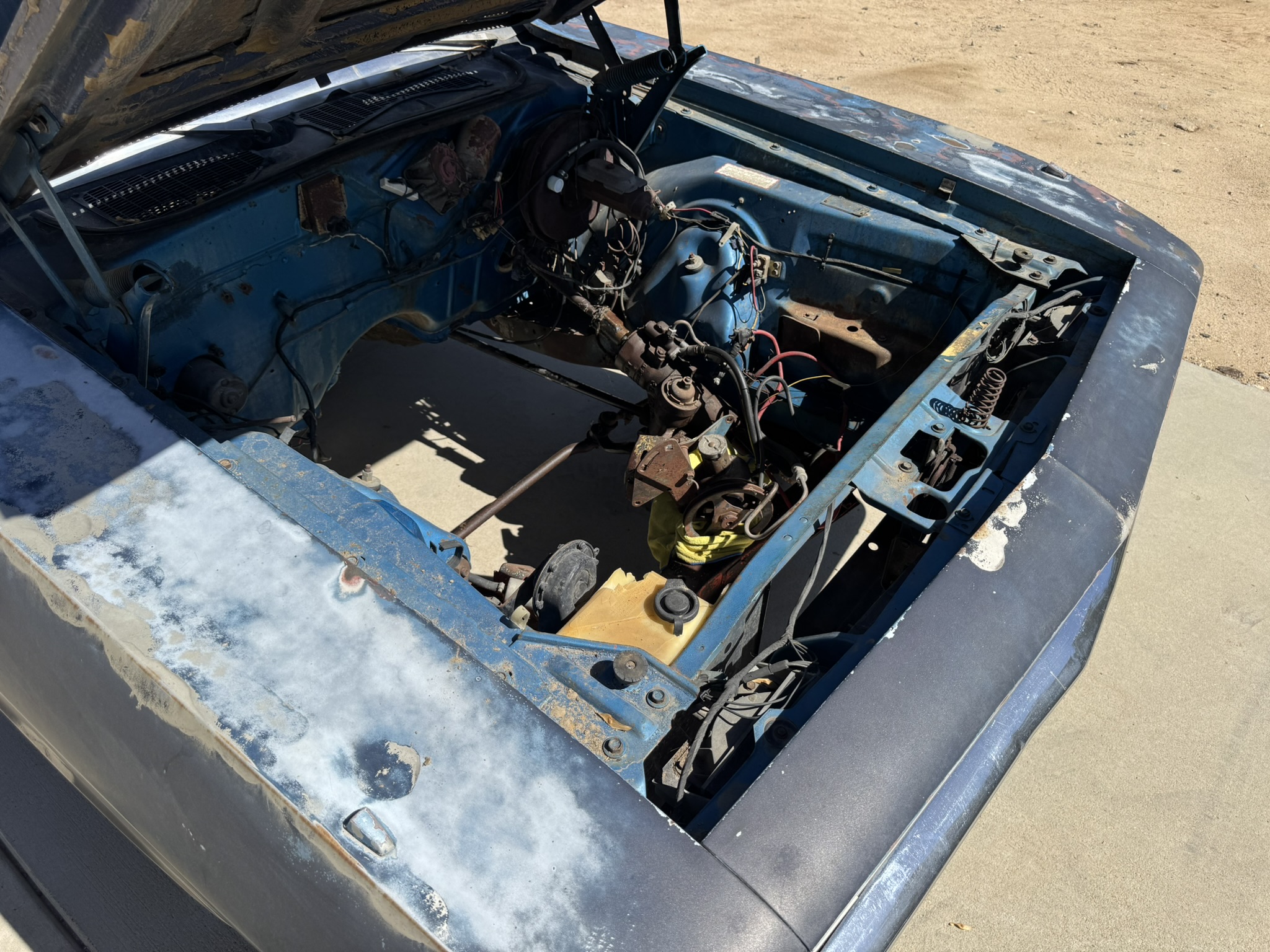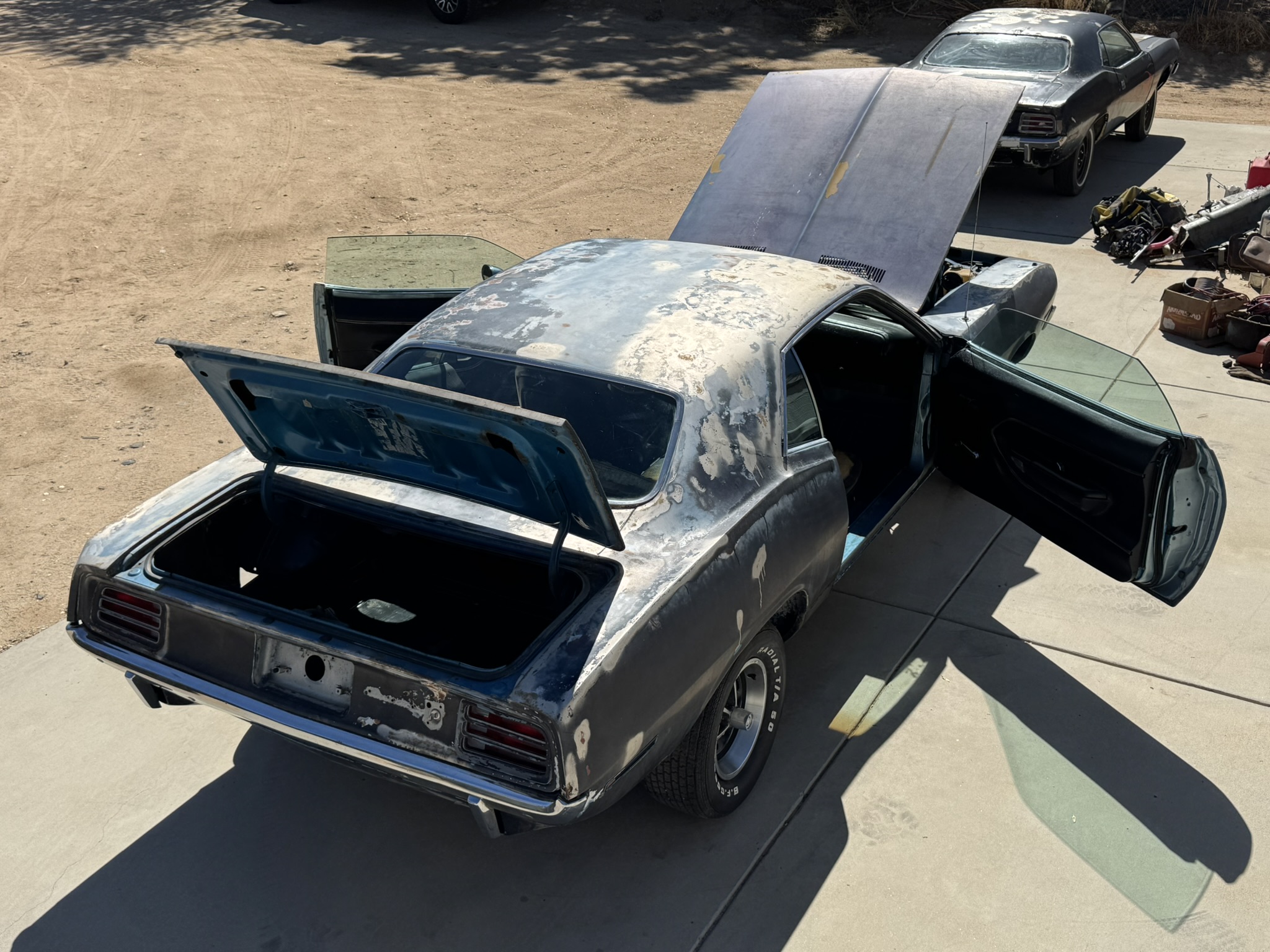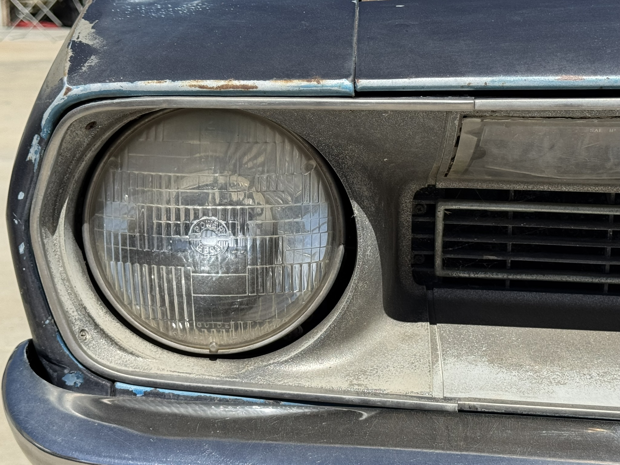 Finished originally in B5 Bright Blue Poly, the original paint can still be seen in many areas on the car. The only bondo identified on the car is a small section on the passenger side quarter panel towards the tail. Both factory bumpers are in place and in very good condition. The hood is from a donor car, which opens, closes, and latches easily. The rest of the body is original sheet metal. The factory fender turn signals are in place. This car has the correct options to allow for a shaker hood, such as the 3 speed wiper motor. The doors and trunk close nicely, only requiring minor adjustment. The rust is minimal and limited to the passenger side lower quarter panel. There was a patch panel started on the same quarter panel that will need finishing. The trunk floor has been cut out even though it wasn't very rusty and a new trunk floor has been set in place. New trunk floor extensions are included as well. The grill and headlight buckets are original, all in great condition. All of the factory tinted glass is in place with the windshield showing scratches from windshield wipers without blades.