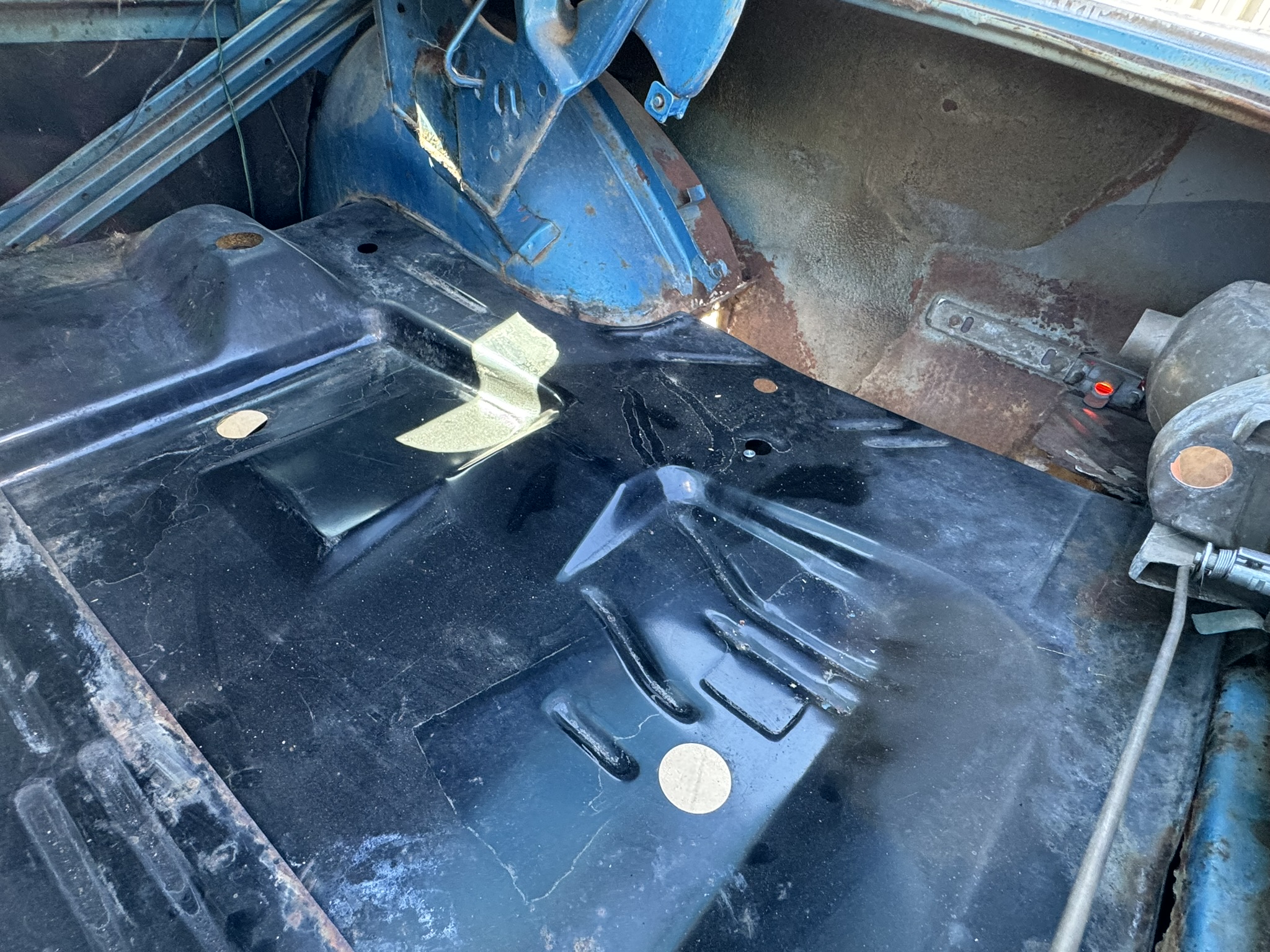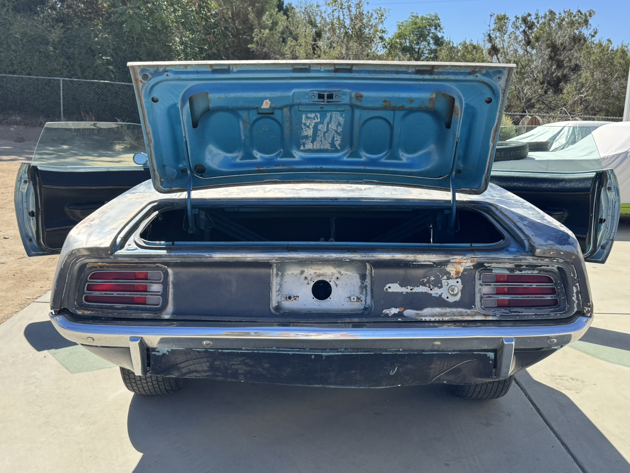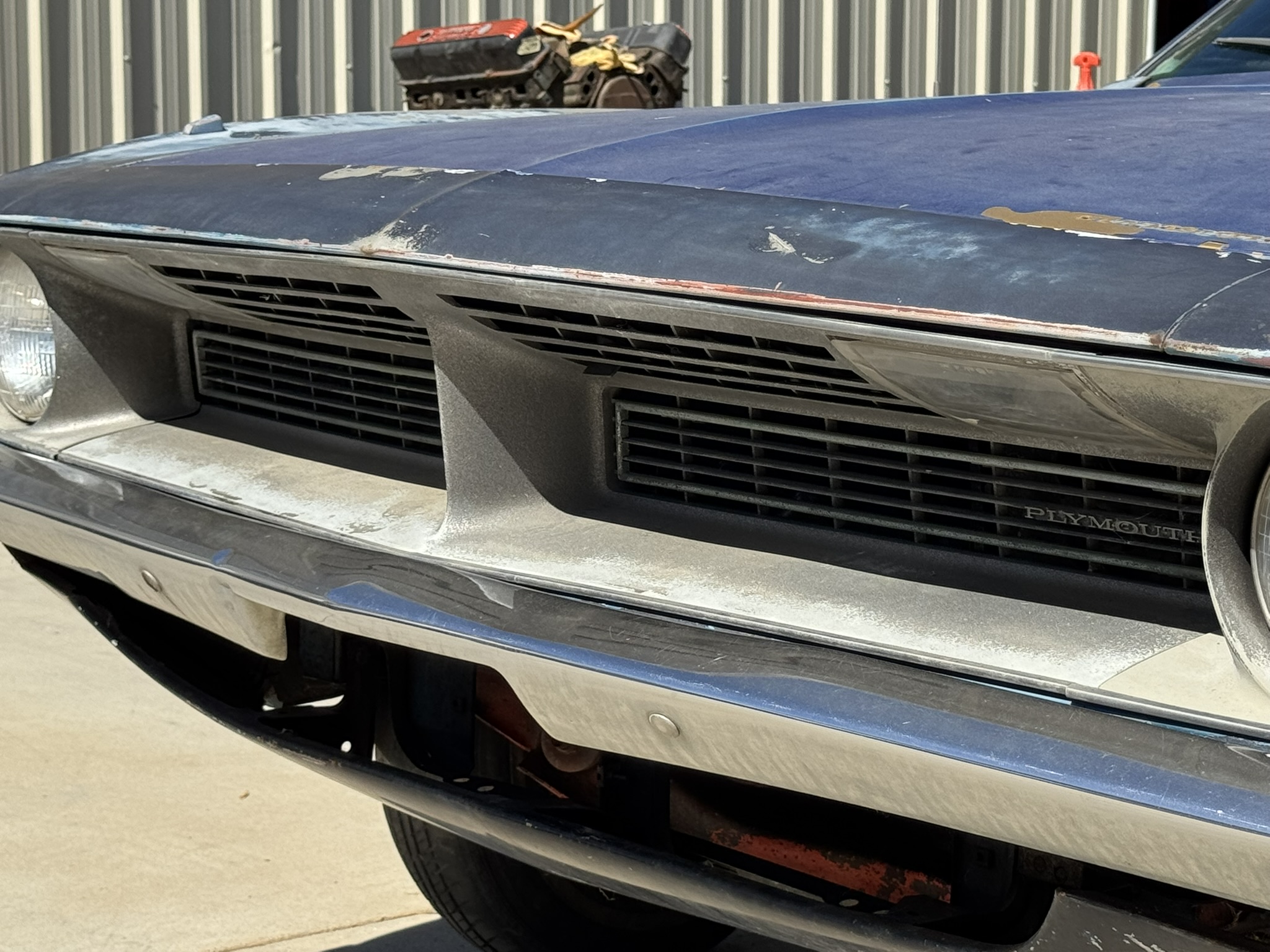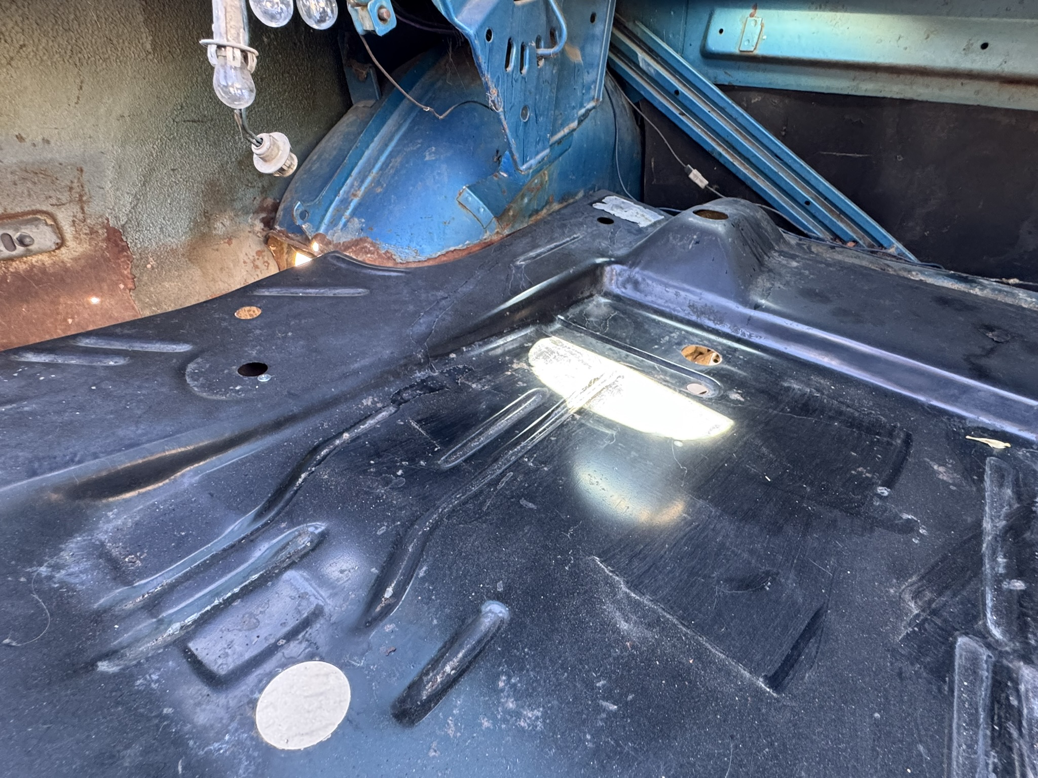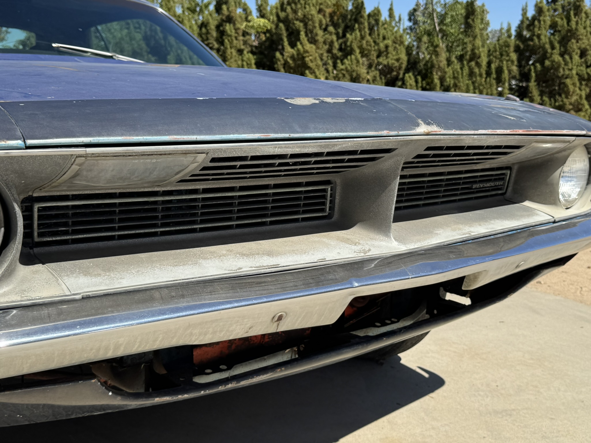 Finished originally in B5 Bright Blue Poly, the original paint can still be seen in many areas on the car. The only bondo identified on the car is a small section on the passenger side quarter panel towards the tail. Both factory bumpers are in place and in very good condition. The hood is from a donor car, which opens, closes, and latches easily. The rest of the body is original sheet metal. The factory fender turn signals are in place. This car has the correct options to allow for a shaker hood, such as the 3 speed wiper motor. The doors and trunk close nicely, only requiring minor adjustment. The rust is minimal and limited to the passenger side lower quarter panel. There was a patch panel started on the same quarter panel that will need finishing. The trunk floor has been cut out even though it wasn't very rusty and a new trunk floor has been set in place. New trunk floor extensions are included as well. The grill and headlight buckets are original, all in great condition. All of the factory tinted glass is in place with the windshield showing scratches from windshield wipers without blades.