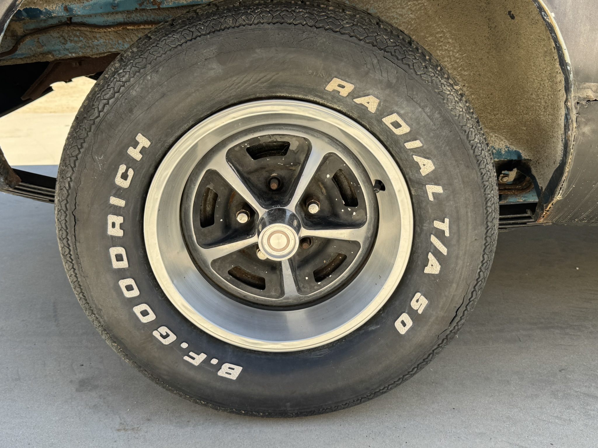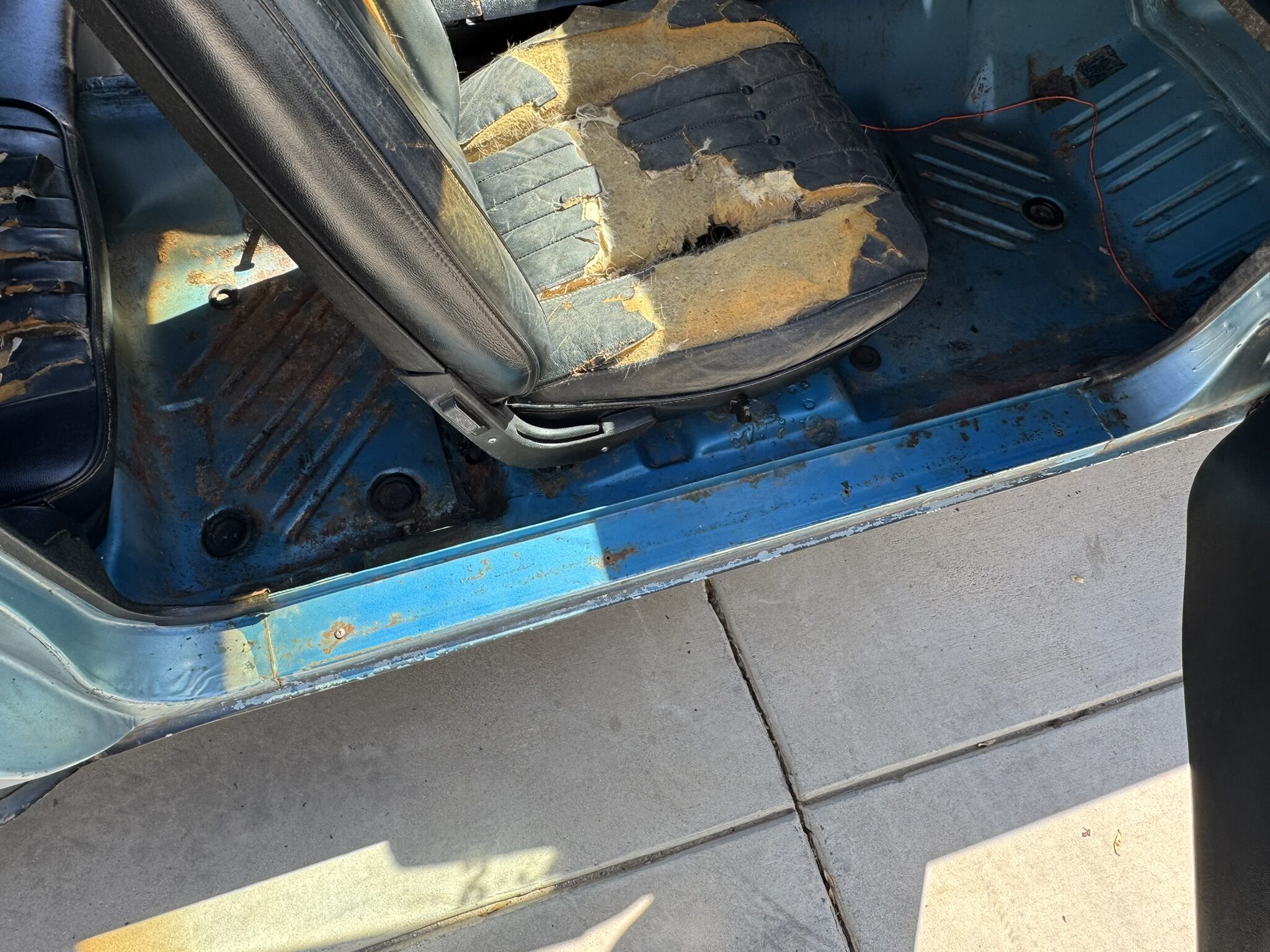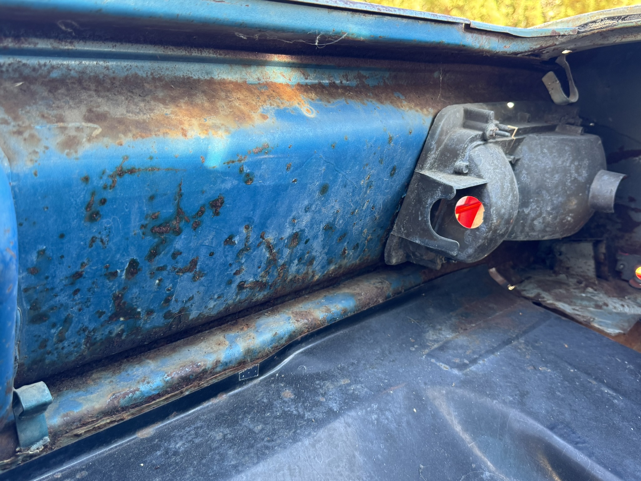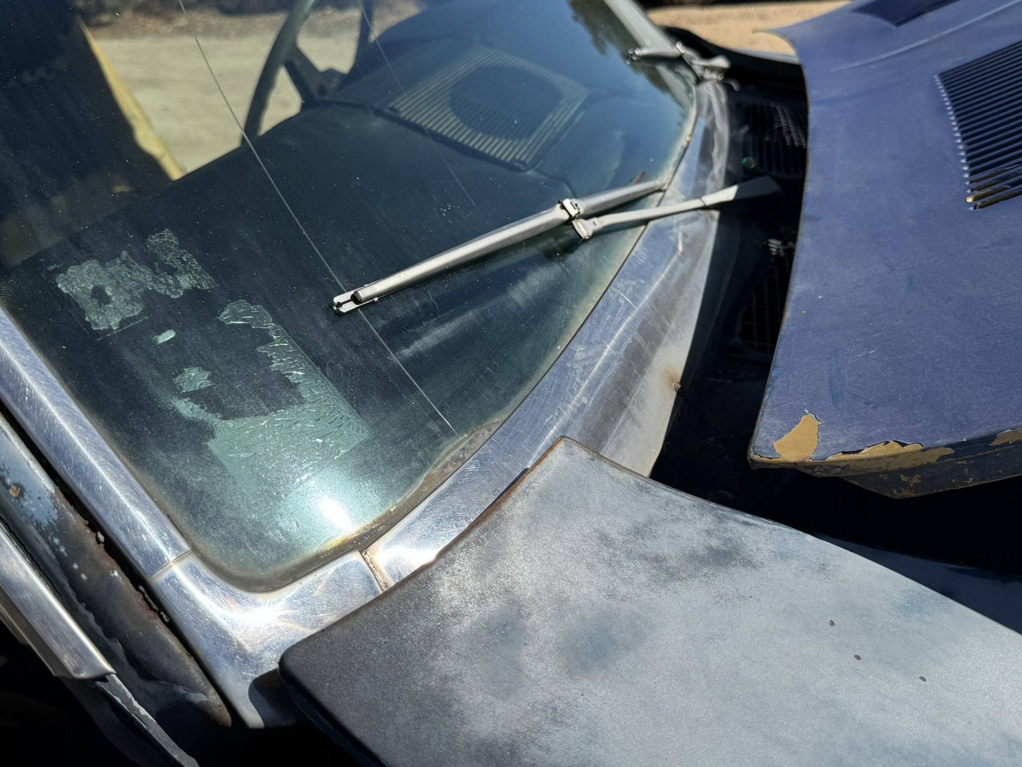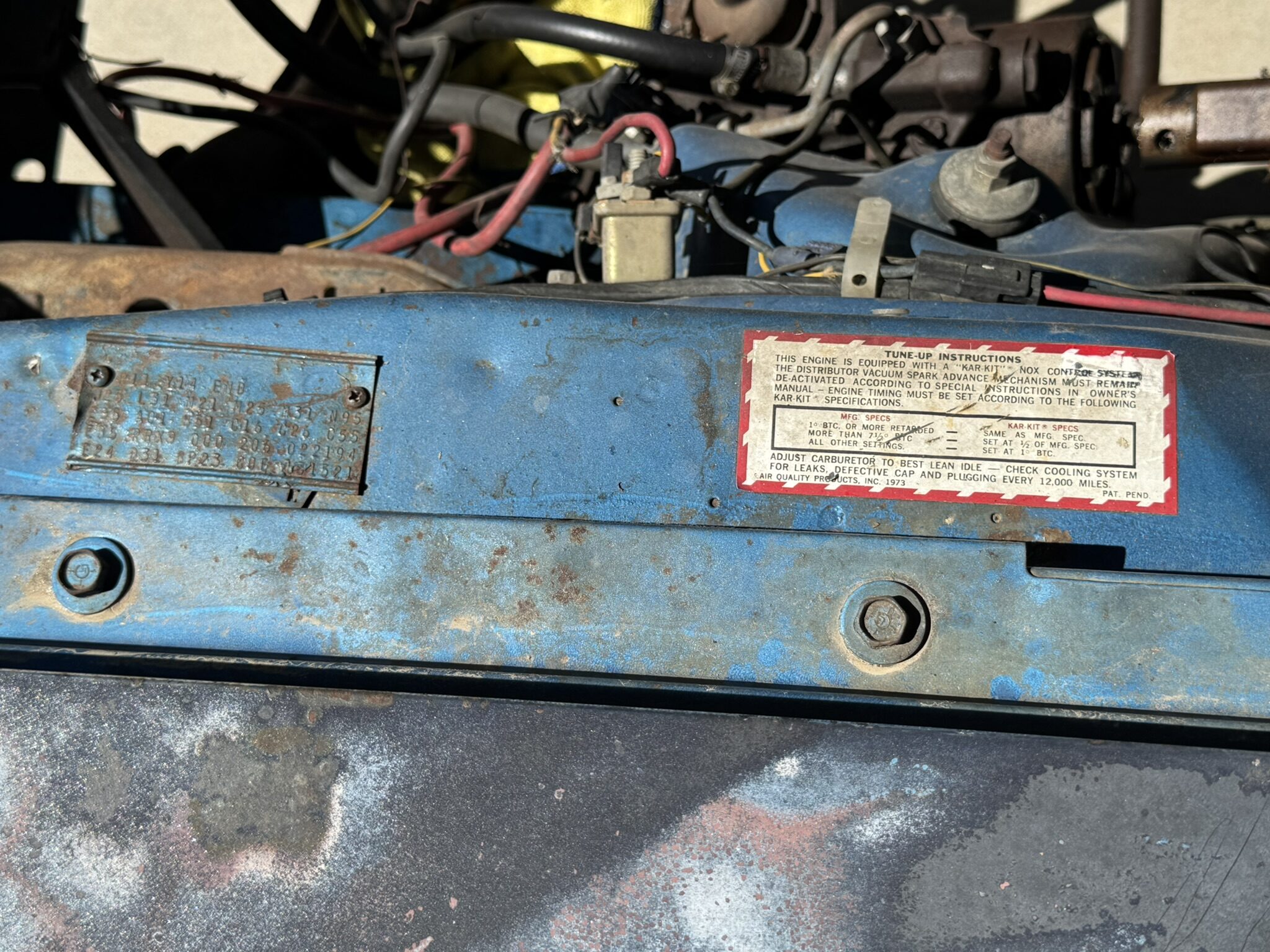 Finished originally in B5 Bright Blue Poly, the original paint can still be seen in many areas on the car. The only bondo identified on the car is a small section on the passenger side quarter panel towards the tail. Both factory bumpers are in place and in very good condition. The hood is from a donor car, which opens, closes, and latches easily. The rest of the body is original sheet metal. The factory fender turn signals are in place. This car has the correct options to allow for a shaker hood, such as the 3 speed wiper motor. The doors and trunk close nicely, only requiring minor adjustment. The rust is minimal and limited to the passenger side lower quarter panel. There was a patch panel started on the same quarter panel that will need finishing. The trunk floor has been cut out even though it wasn't very rusty and a new trunk floor has been set in place. New trunk floor extensions are included as well. The grill and headlight buckets are original, all in great condition. All of the factory tinted glass is in place with the windshield showing scratches from windshield wipers without blades.