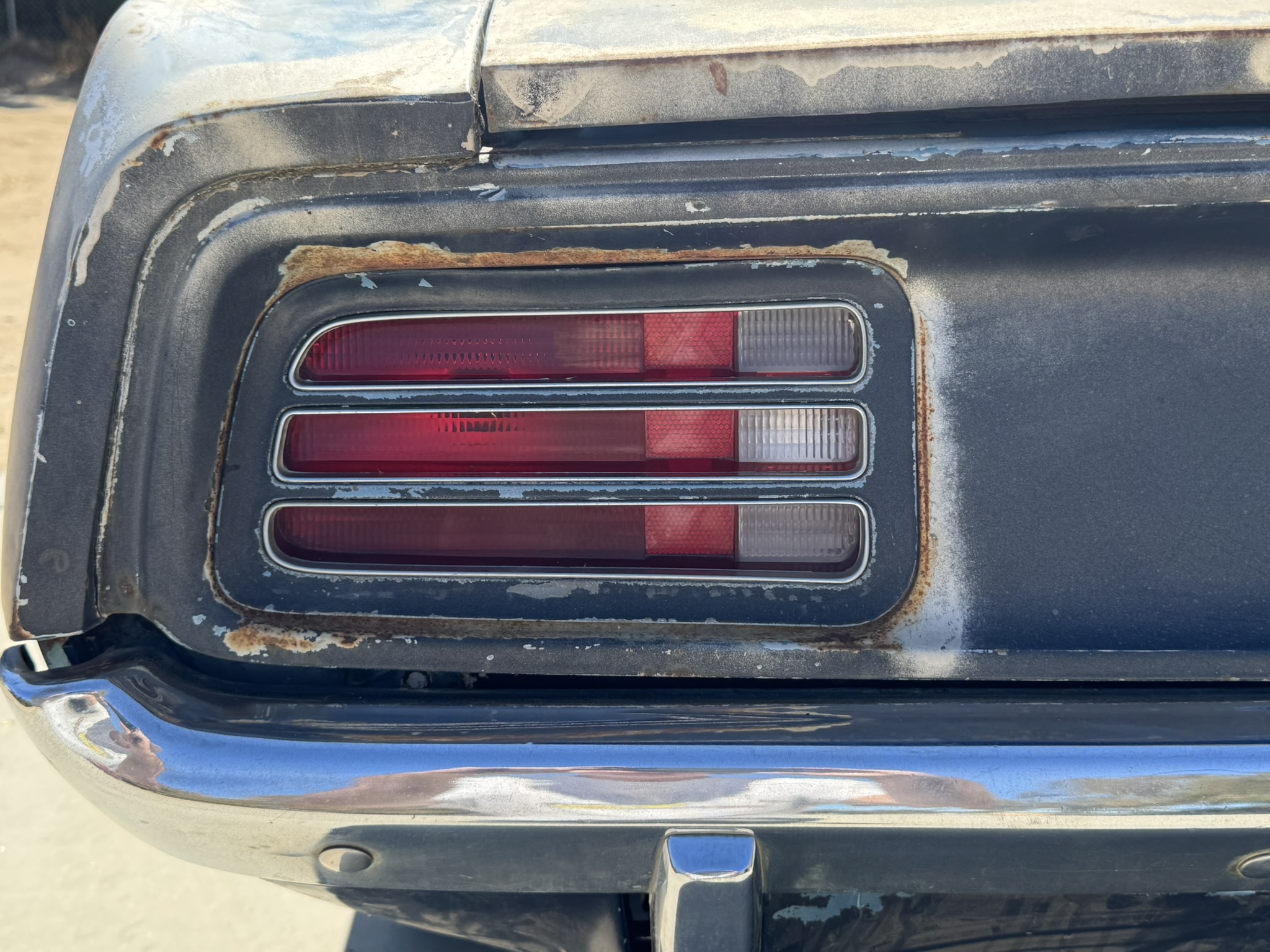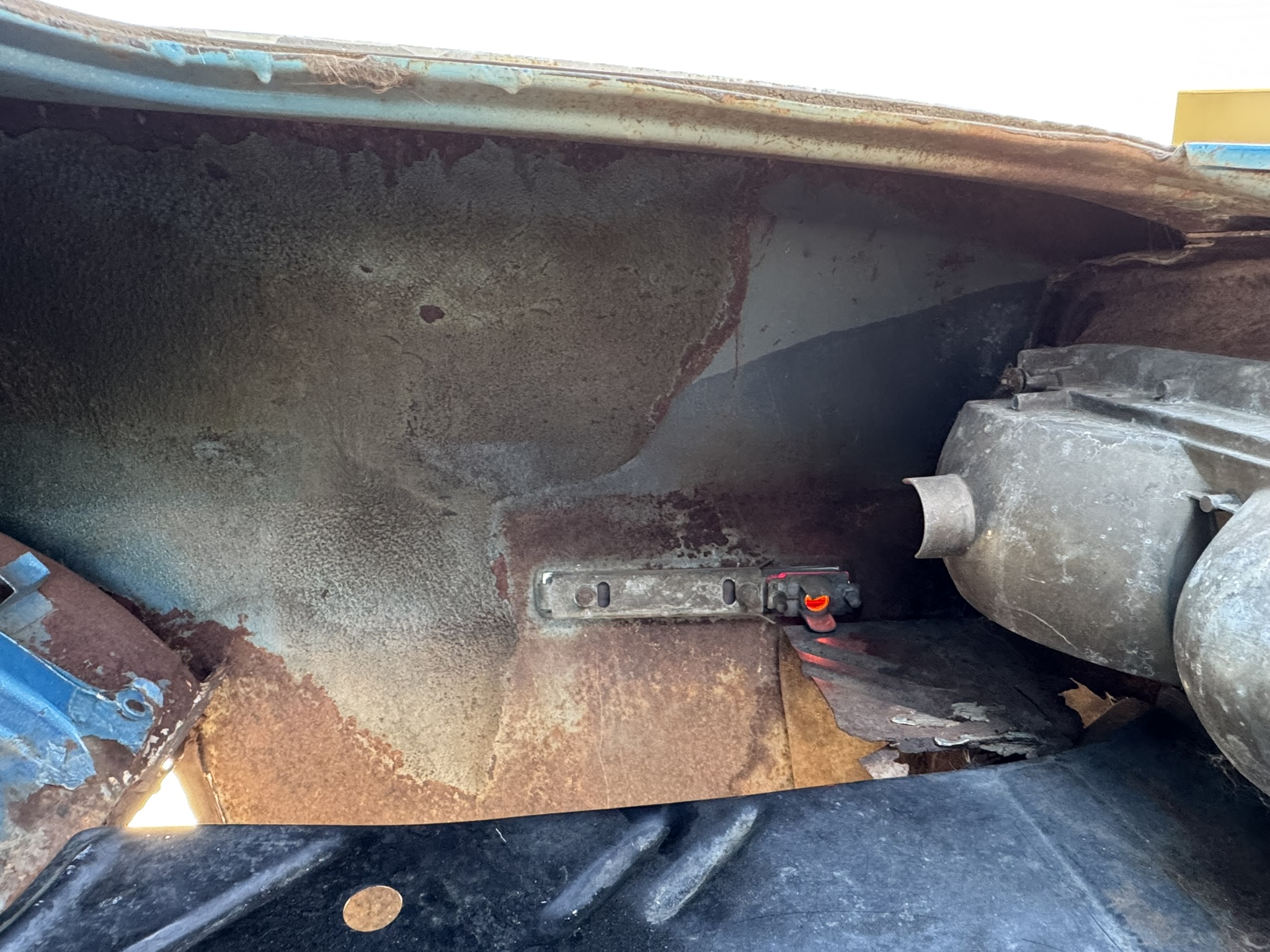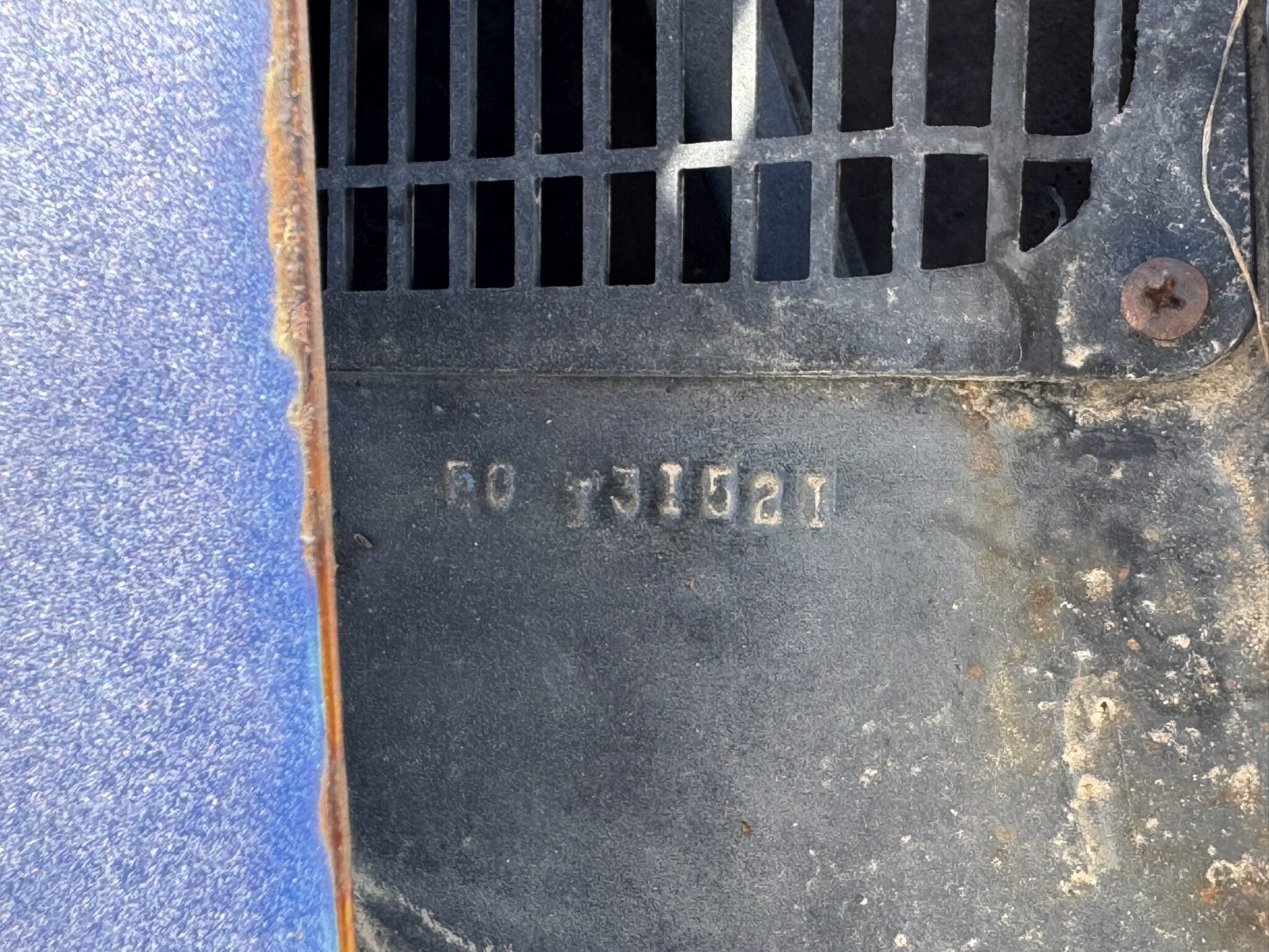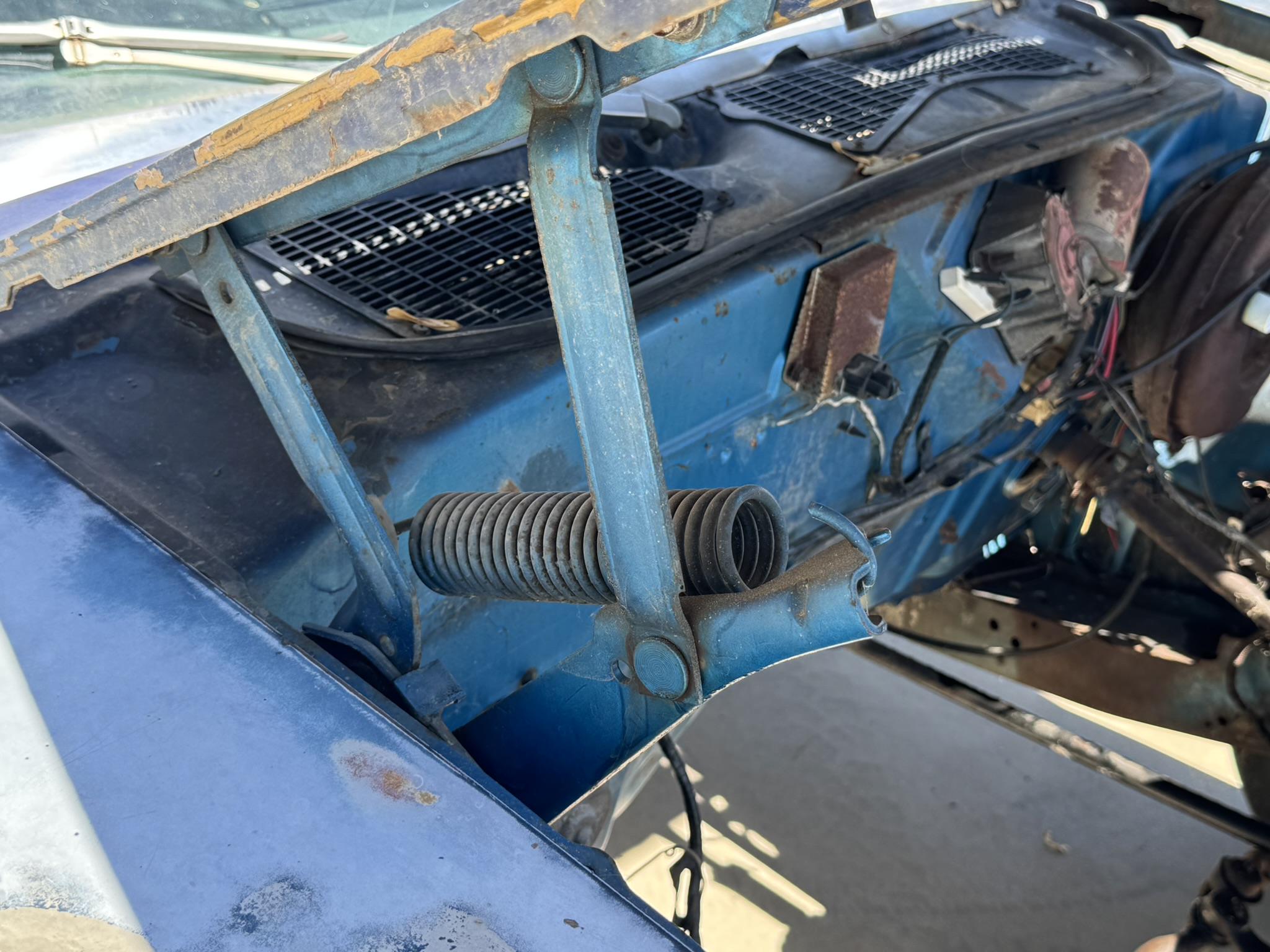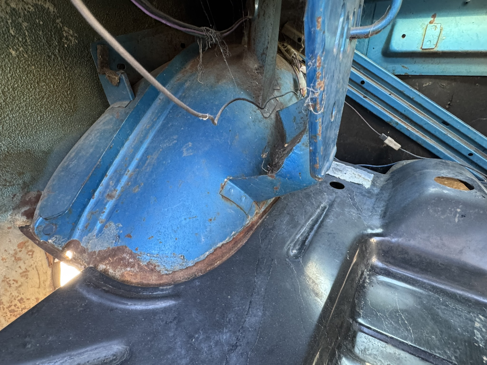 Finished originally in B5 Bright Blue Poly, the original paint can still be seen in many areas on the car. The only bondo identified on the car is a small section on the passenger side quarter panel towards the tail. Both factory bumpers are in place and in very good condition. The hood is from a donor car, which opens, closes, and latches easily. The rest of the body is original sheet metal. The factory fender turn signals are in place. This car has the correct options to allow for a shaker hood, such as the 3 speed wiper motor. The doors and trunk close nicely, only requiring minor adjustment. The rust is minimal and limited to the passenger side lower quarter panel. There was a patch panel started on the same quarter panel that will need finishing. The trunk floor has been cut out even though it wasn't very rusty and a new trunk floor has been set in place. New trunk floor extensions are included as well. The grill and headlight buckets are original, all in great condition. All of the factory tinted glass is in place with the windshield showing scratches from windshield wipers without blades.
