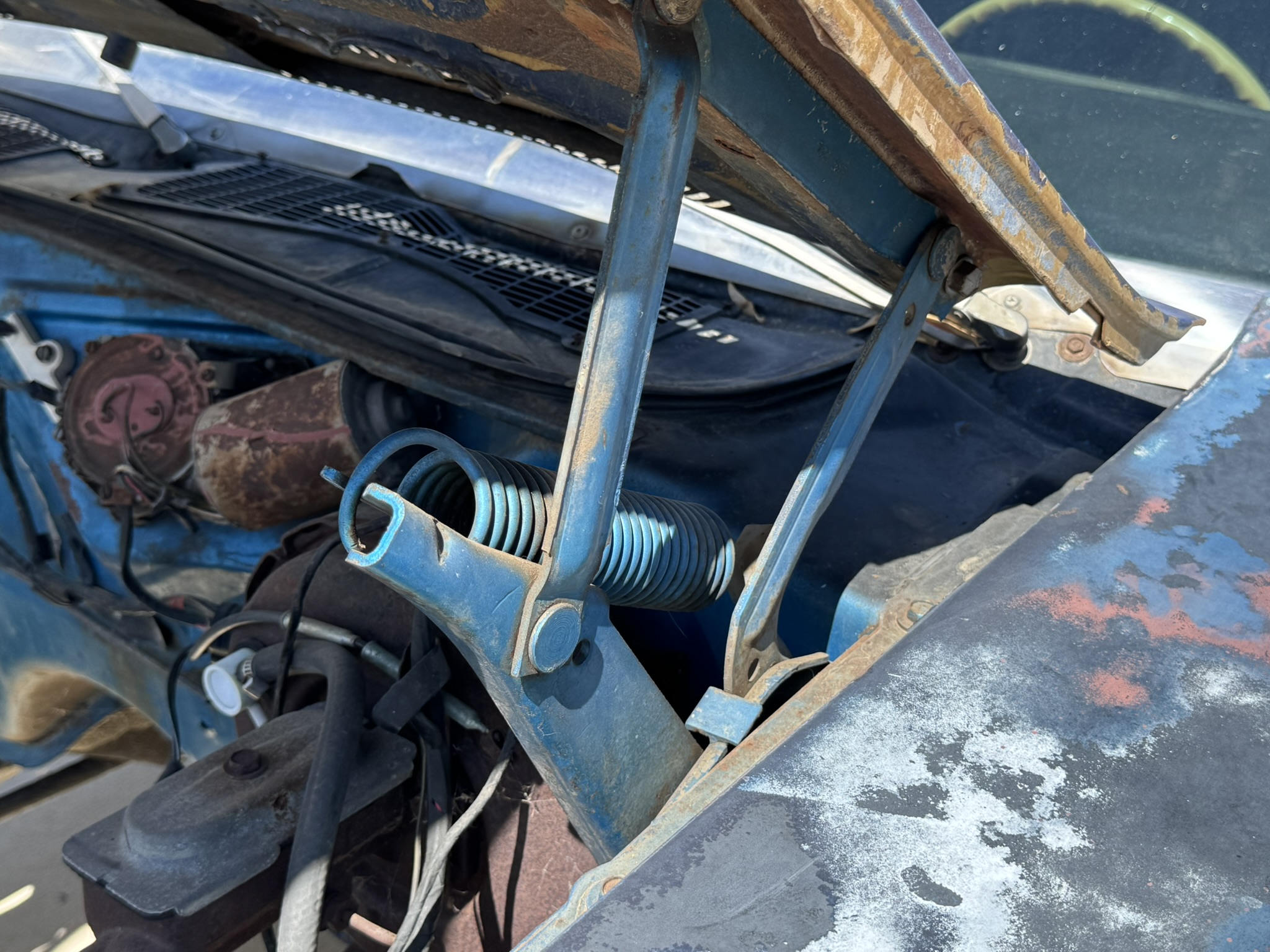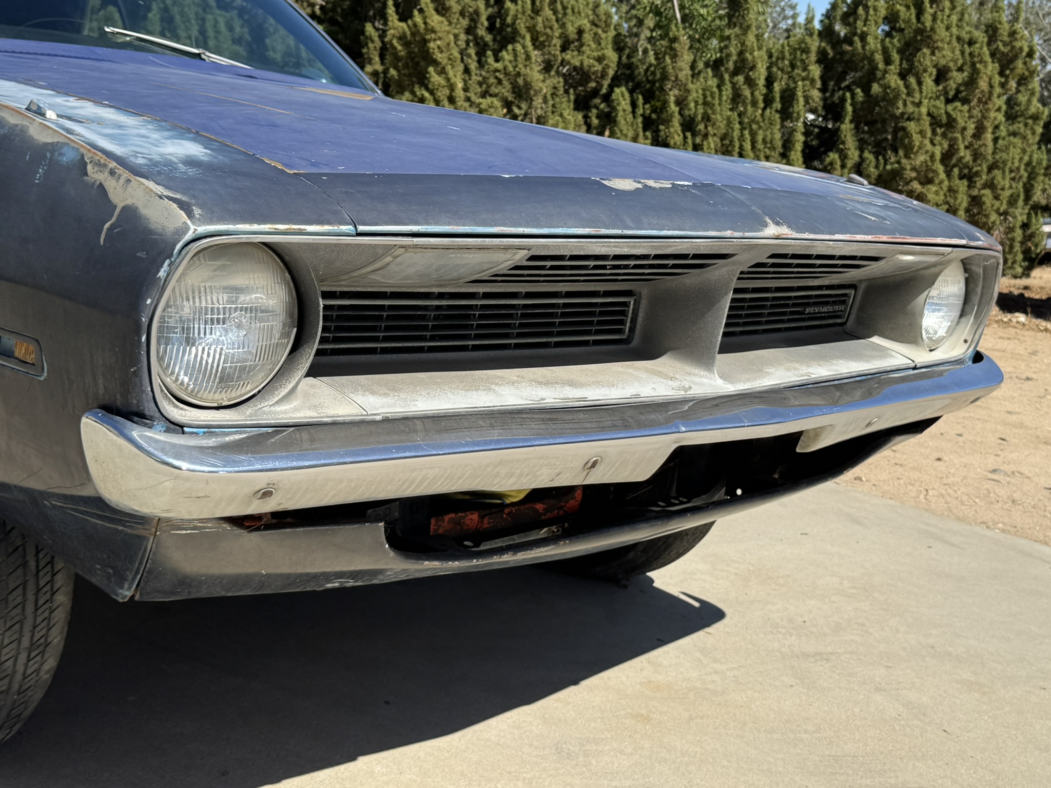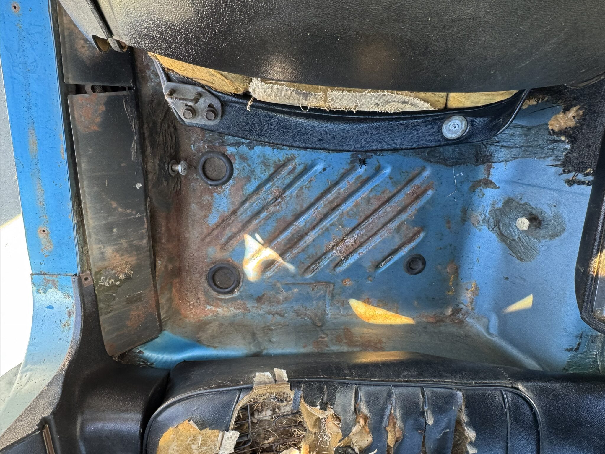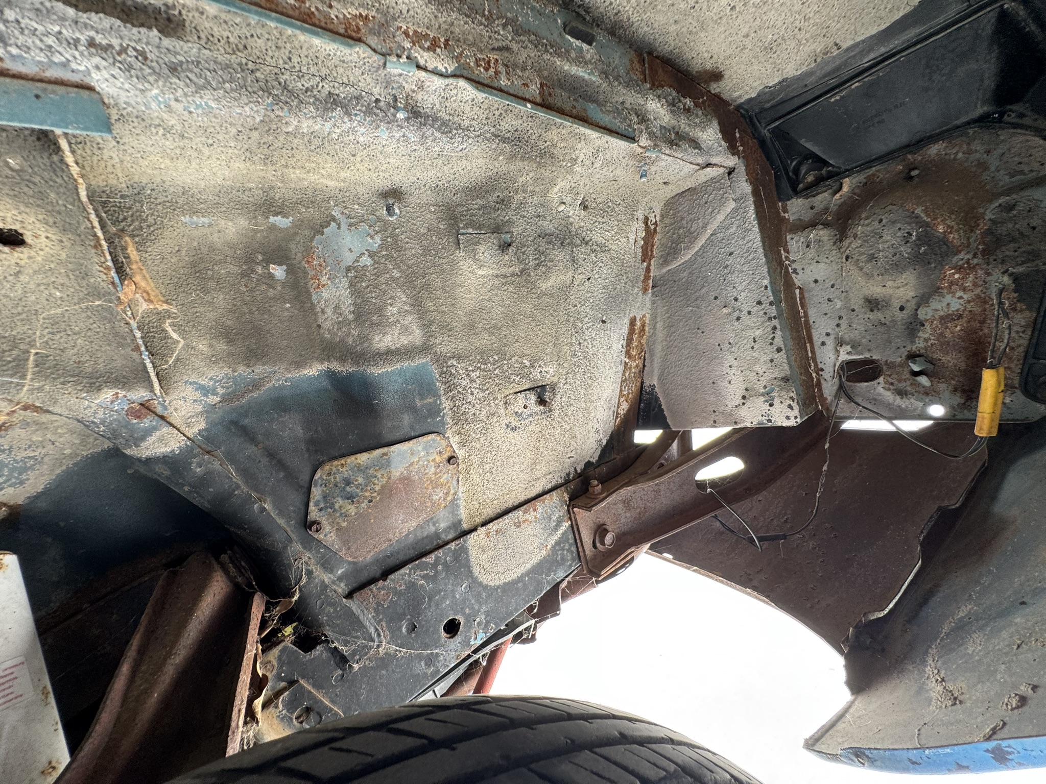 Finished originally in B5 Bright Blue Poly, the original paint can still be seen in many areas on the car. The only bondo identified on the car is a small section on the passenger side quarter panel towards the tail. Both factory bumpers are in place and in very good condition. The hood is from a donor car, which opens, closes, and latches easily. The rest of the body is original sheet metal. The factory fender turn signals are in place. This car has the correct options to allow for a shaker hood, such as the 3 speed wiper motor. The doors and trunk close nicely, only requiring minor adjustment. The rust is minimal and limited to the passenger side lower quarter panel. There was a patch panel started on the same quarter panel that will need finishing. The trunk floor has been cut out even though it wasn't very rusty and a new trunk floor has been set in place. New trunk floor extensions are included as well. The grill and headlight buckets are original, all in great condition. All of the factory tinted glass is in place with the windshield showing scratches from windshield wipers without blades.