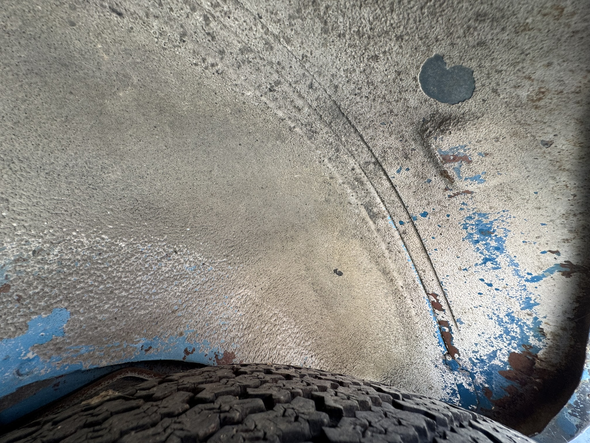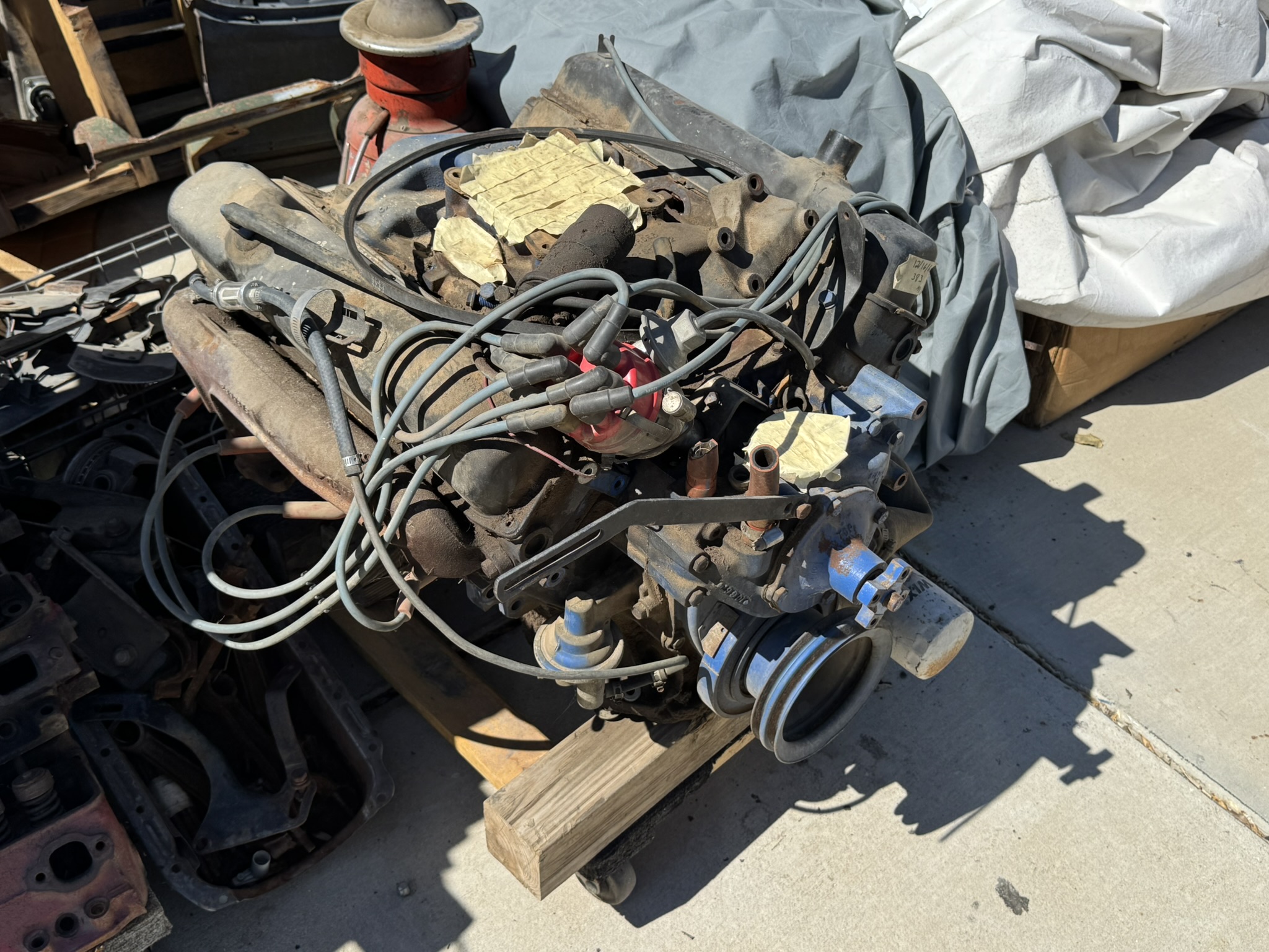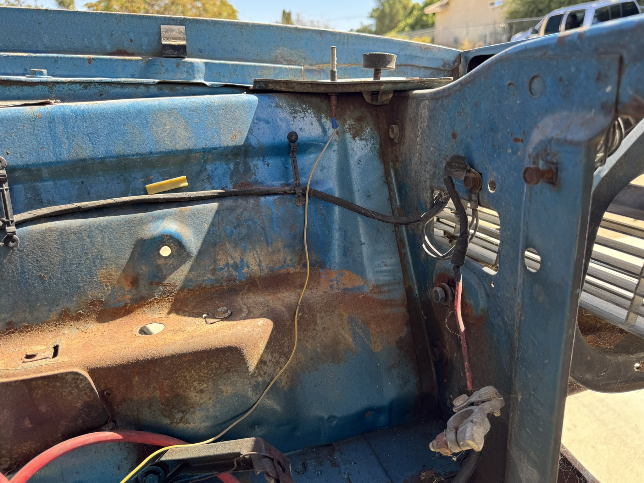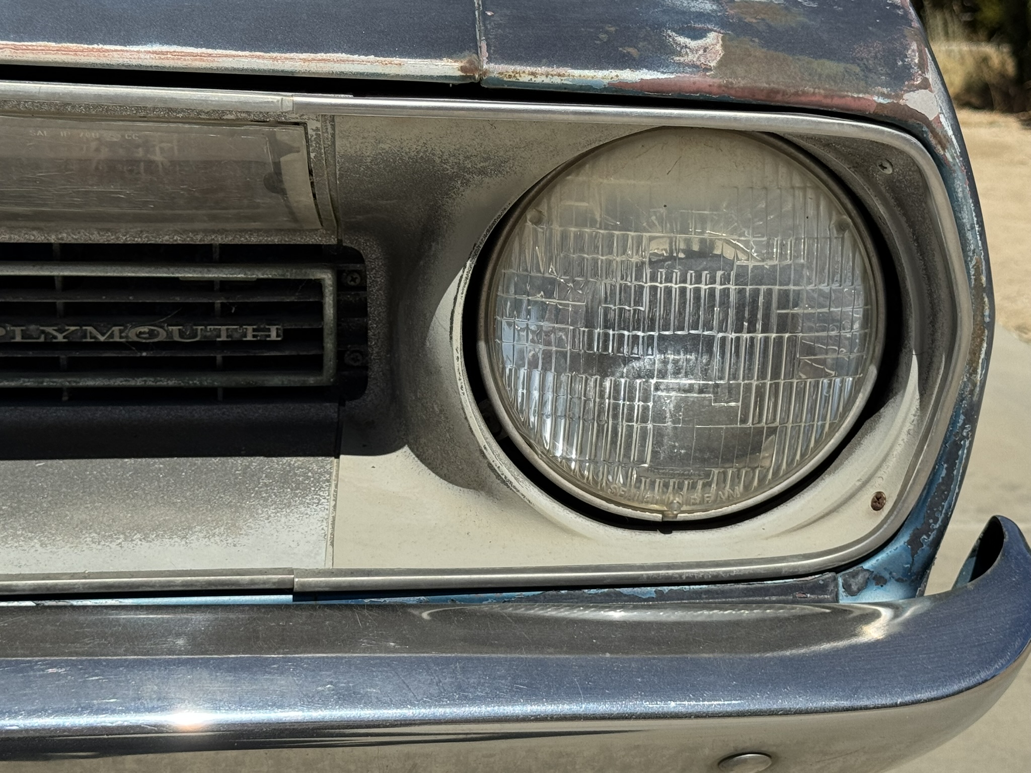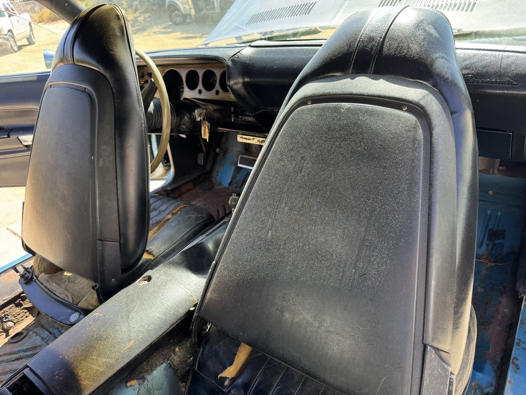 Finished originally in B5 Bright Blue Poly, the original paint can still be seen in many areas on the car. The only bondo identified on the car is a small section on the passenger side quarter panel towards the tail. Both factory bumpers are in place and in very good condition. The hood is from a donor car, which opens, closes, and latches easily. The rest of the body is original sheet metal. The factory fender turn signals are in place. This car has the correct options to allow for a shaker hood, such as the 3 speed wiper motor. The doors and trunk close nicely, only requiring minor adjustment. The rust is minimal and limited to the passenger side lower quarter panel. There was a patch panel started on the same quarter panel that will need finishing. The trunk floor has been cut out even though it wasn't very rusty and a new trunk floor has been set in place. New trunk floor extensions are included as well. The grill and headlight buckets are original, all in great condition. All of the factory tinted glass is in place with the windshield showing scratches from windshield wipers without blades.