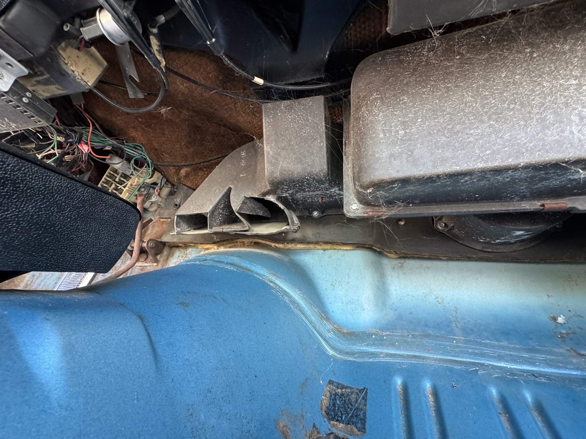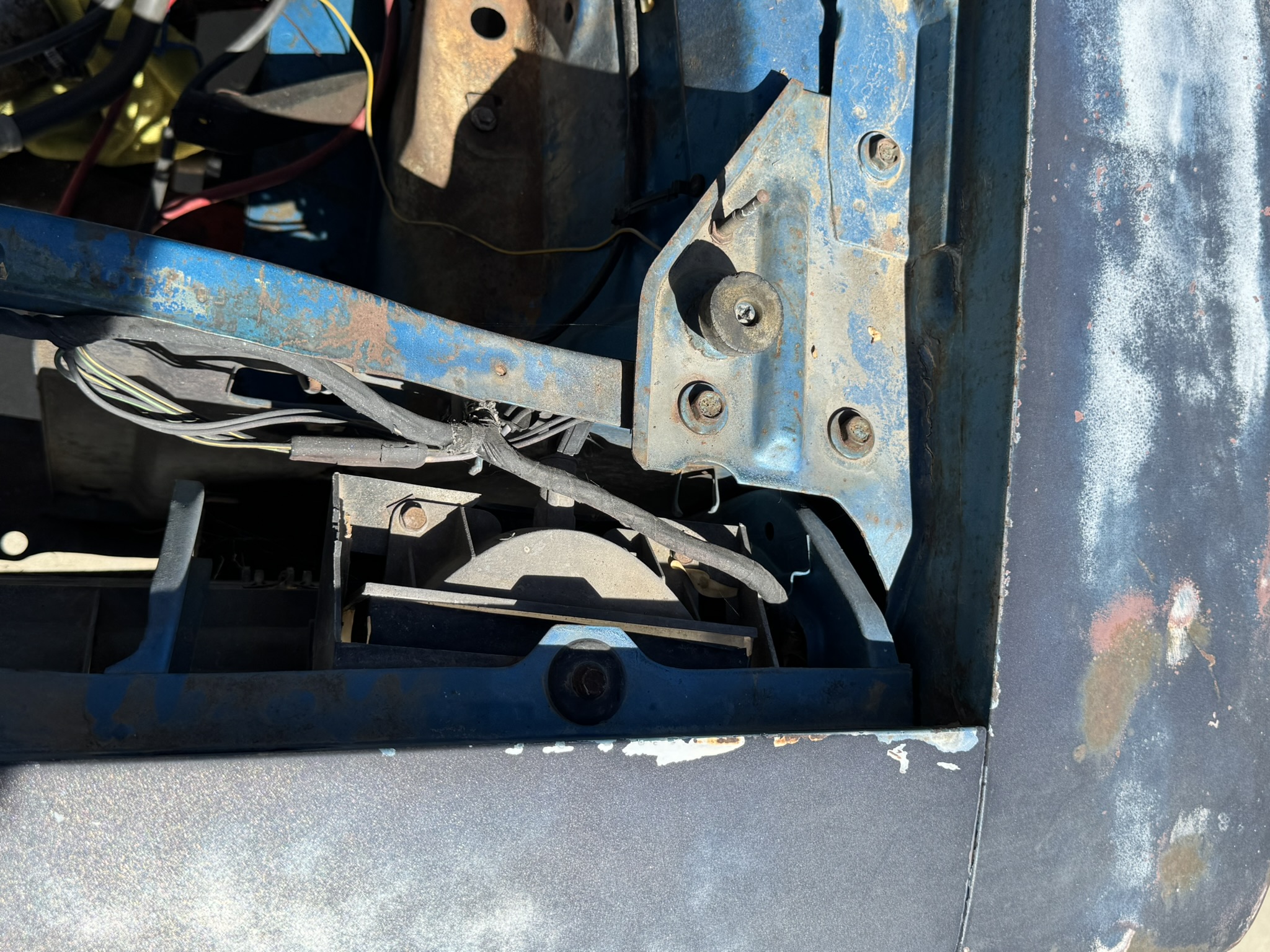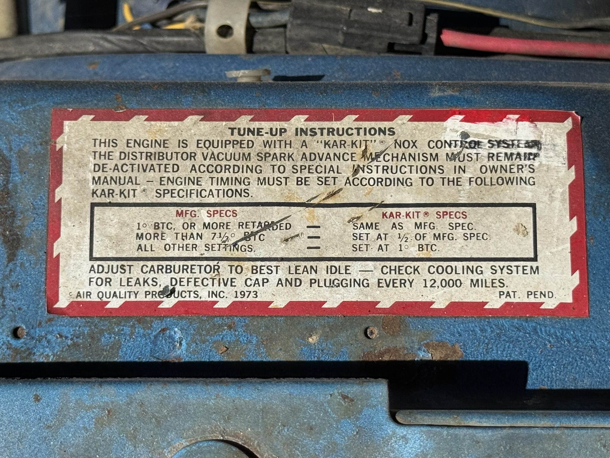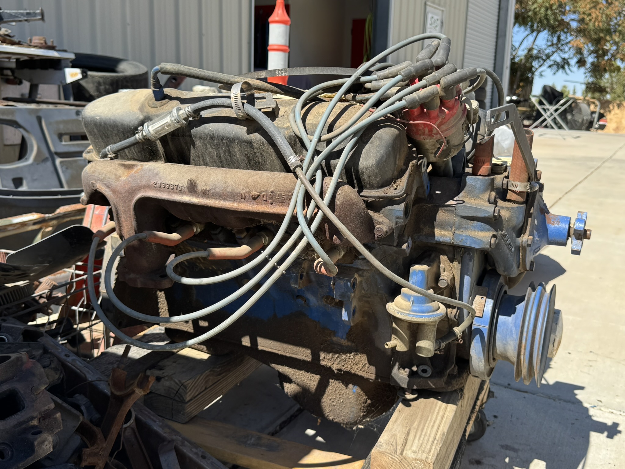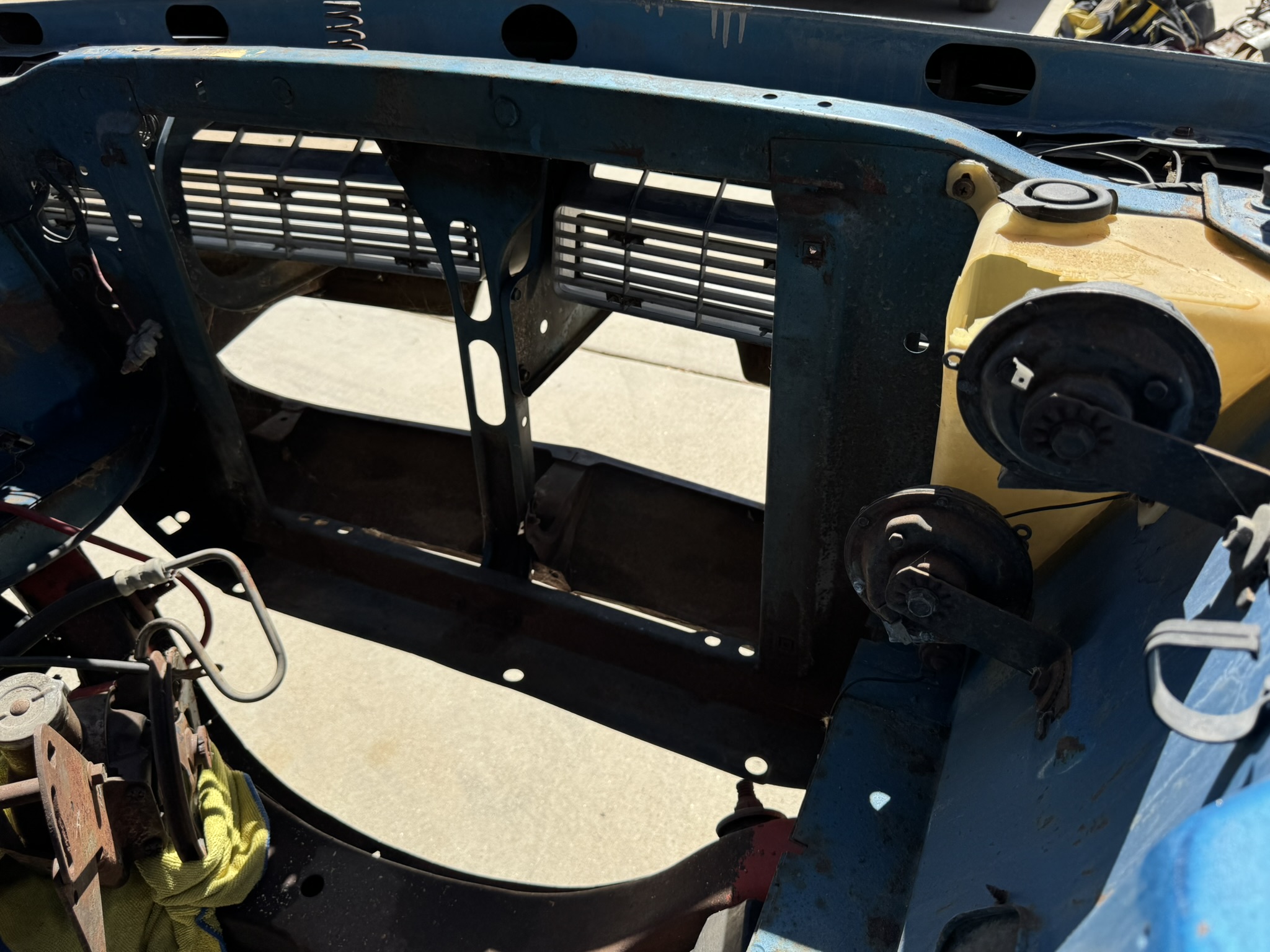 Finished originally in B5 Bright Blue Poly, the original paint can still be seen in many areas on the car. The only bondo identified on the car is a small section on the passenger side quarter panel towards the tail. Both factory bumpers are in place and in very good condition. The hood is from a donor car, which opens, closes, and latches easily. The rest of the body is original sheet metal. The factory fender turn signals are in place. This car has the correct options to allow for a shaker hood, such as the 3 speed wiper motor. The doors and trunk close nicely, only requiring minor adjustment. The rust is minimal and limited to the passenger side lower quarter panel. There was a patch panel started on the same quarter panel that will need finishing. The trunk floor has been cut out even though it wasn't very rusty and a new trunk floor has been set in place. New trunk floor extensions are included as well. The grill and headlight buckets are original, all in great condition. All of the factory tinted glass is in place with the windshield showing scratches from windshield wipers without blades.