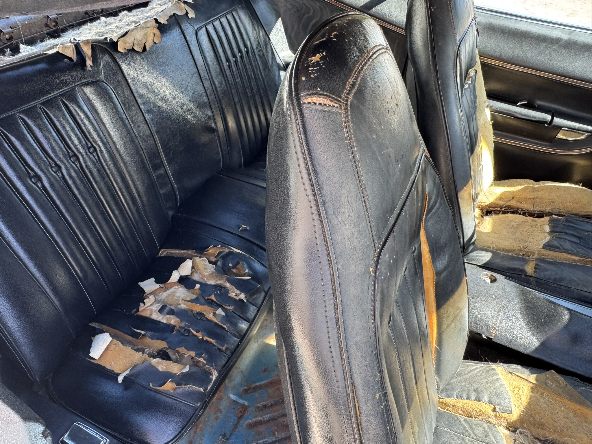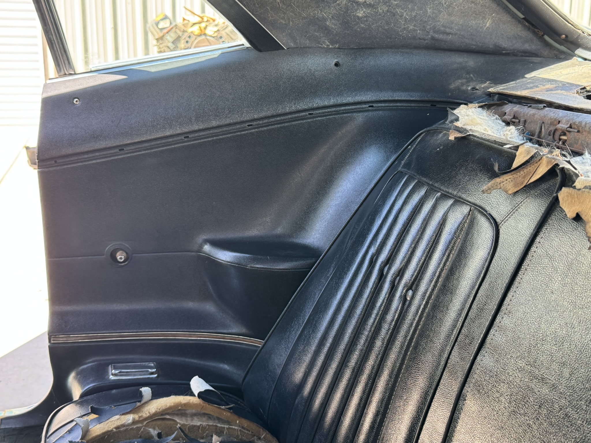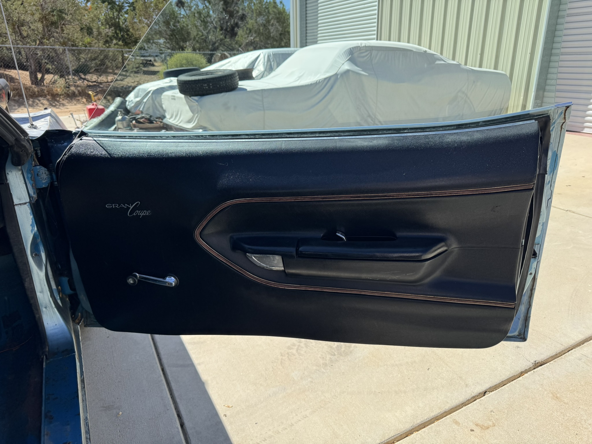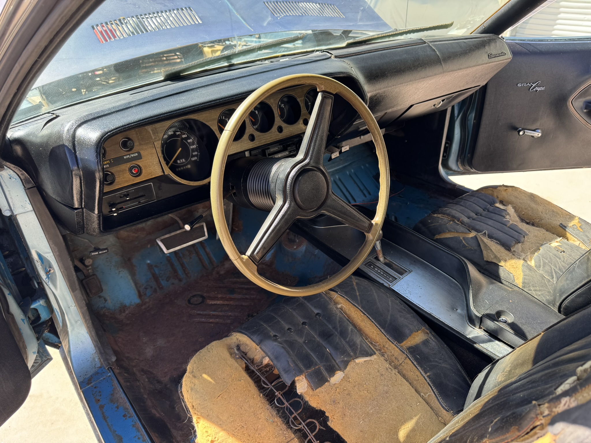 The seats are ready to be recovered with new leather and vinyl seat covers. The headliner in a Gran Coupe is a fiber board covered in a velour-type material, which will need to be re-done. This allows for the overhead console to mount. The overhead console bezel with lights for "Door Ajar", "Low Fuel", and "Seat Belts" will need to be installed. The carpet is missing, requiring a new kit. The dash is in decent shape with a few cracks. The package tray has holes cut for aftermarket speakers and should be replaced. All of the wiring will need to be assessed for completeness and functionality, but it appears intact. The replacement trunk floor is ready to be welded in along with the provided trunk extensions. The floors on the interior do not require any metal work.