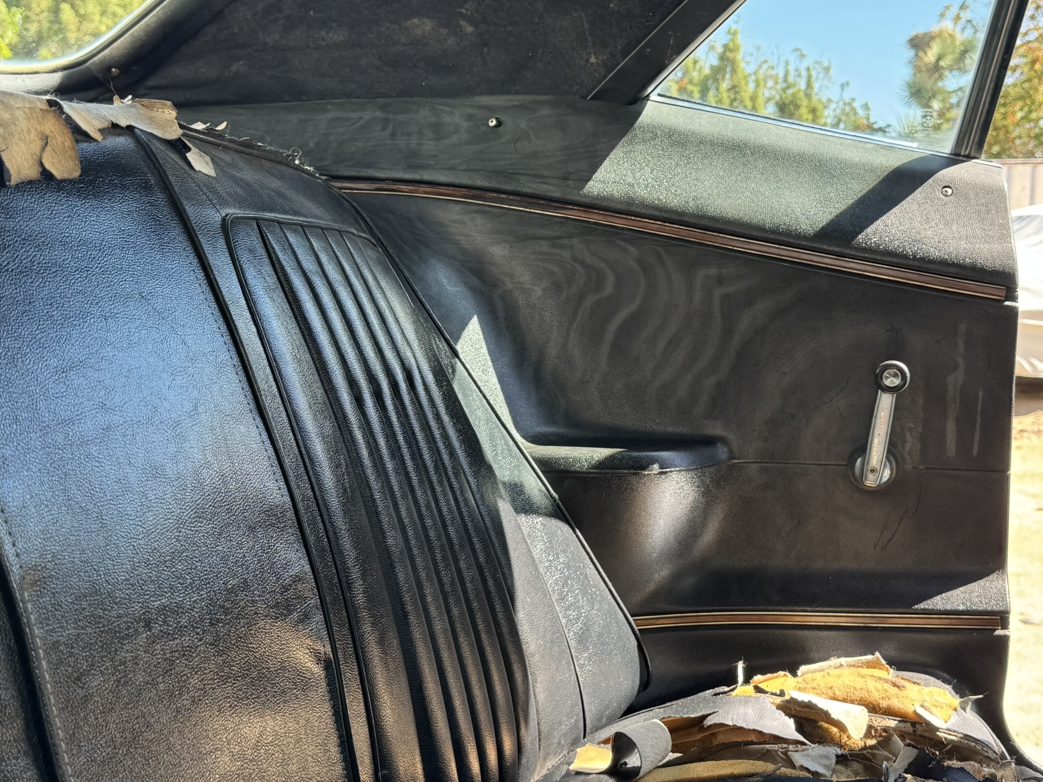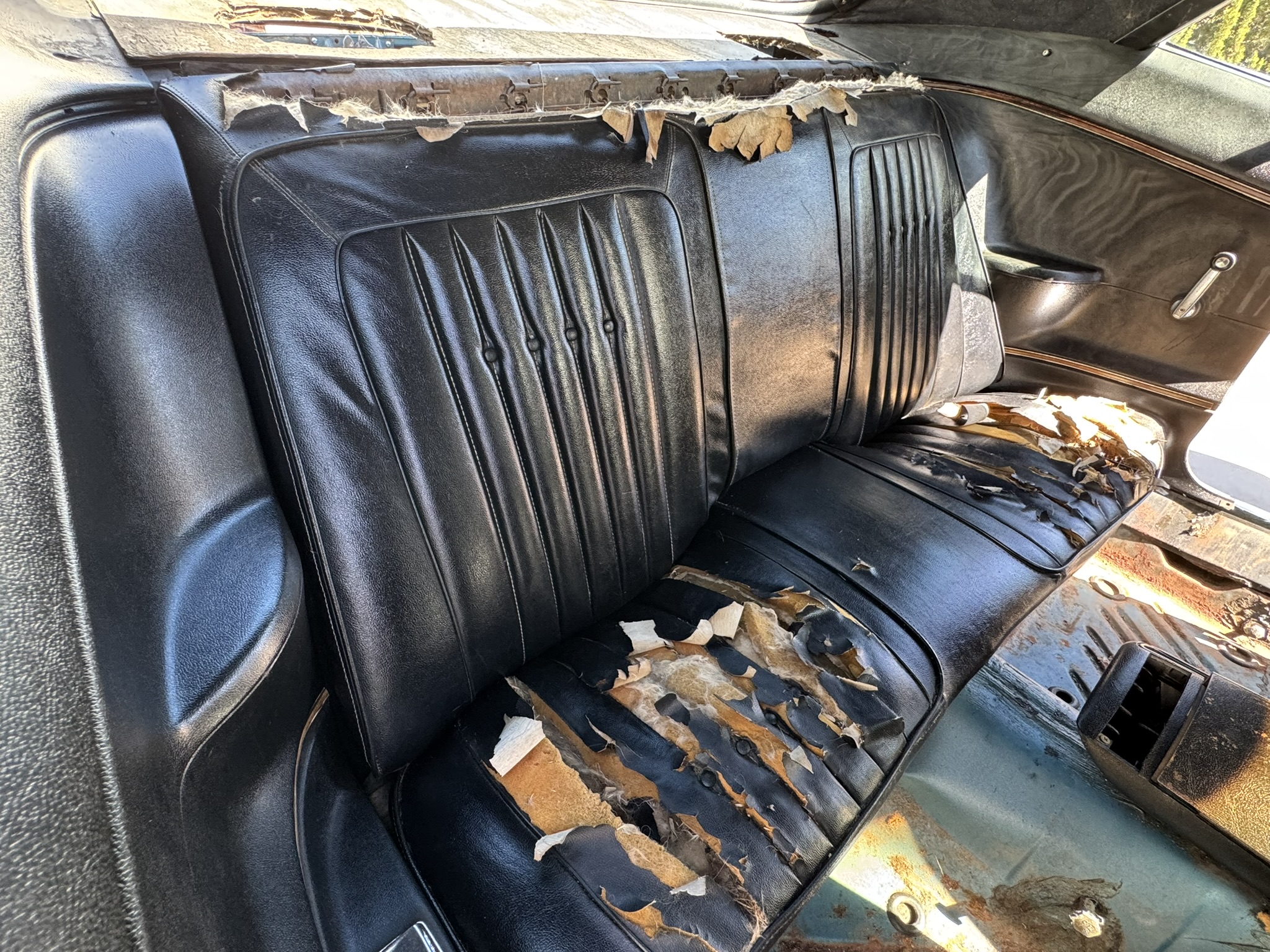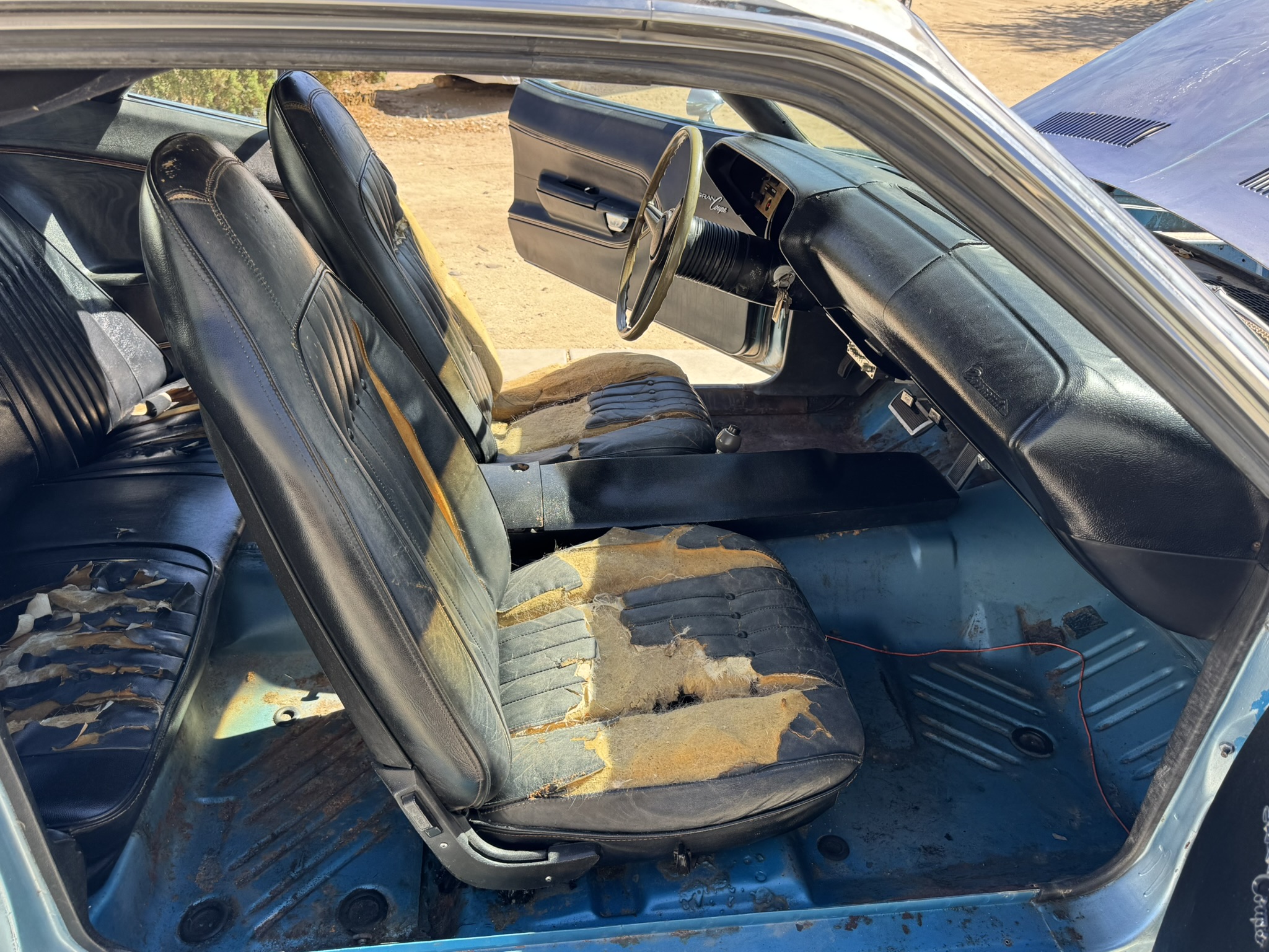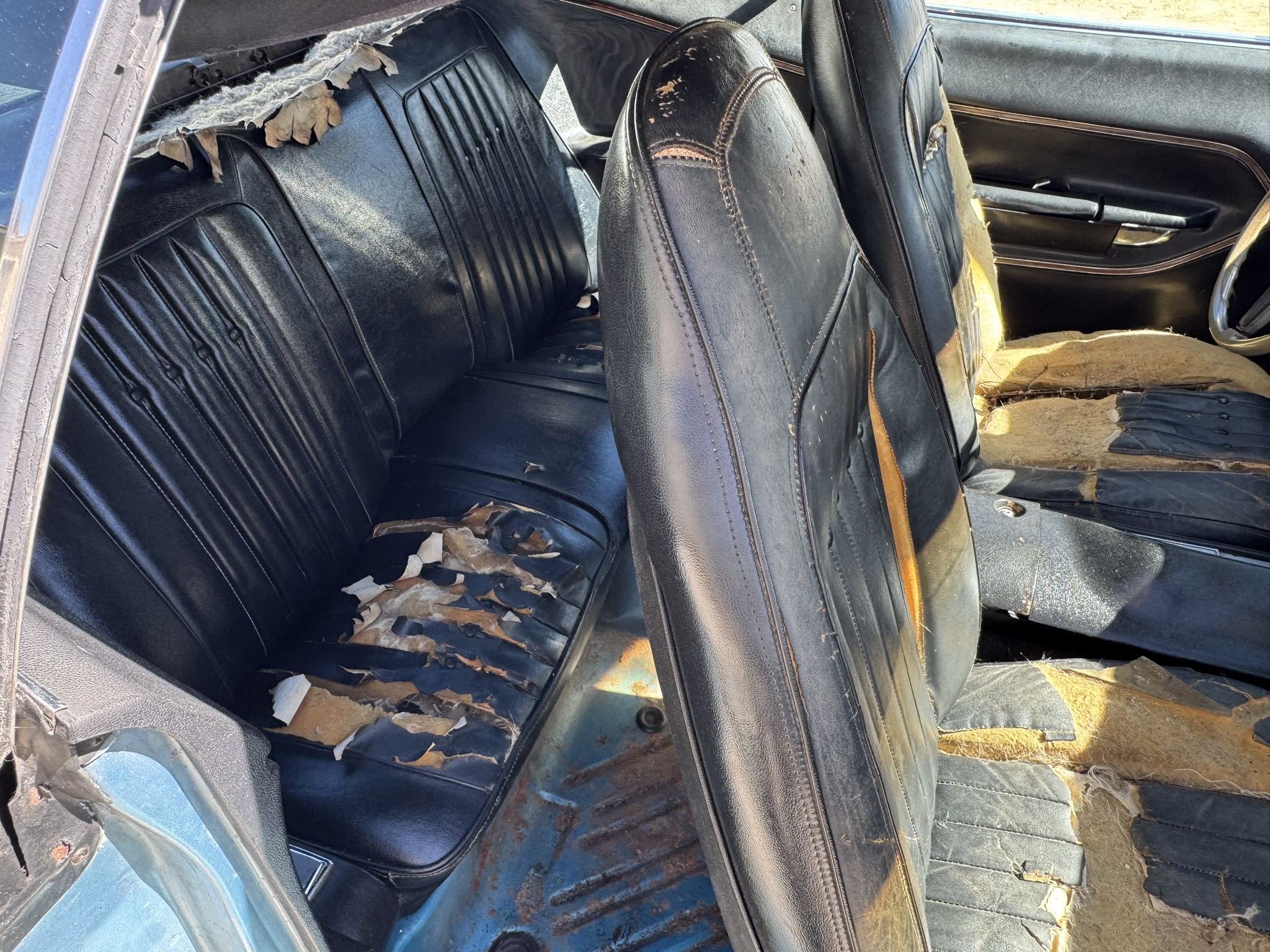 The seats are ready to be recovered with new leather and vinyl seat covers. The headliner in a Gran Coupe is a fiber board covered in a velour-type material, which will need to be re-done. This allows for the overhead console to mount. The overhead console bezel with lights for "Door Ajar", "Low Fuel", and "Seat Belts" will need to be installed. The carpet is missing, requiring a new kit. The dash is in decent shape with a few cracks. The package tray has holes cut for aftermarket speakers and should be replaced. All of the wiring will need to be assessed for completeness and functionality, but it appears intact. The replacement trunk floor is ready to be welded in along with the provided trunk extensions. The floors on the interior do not require any metal work.