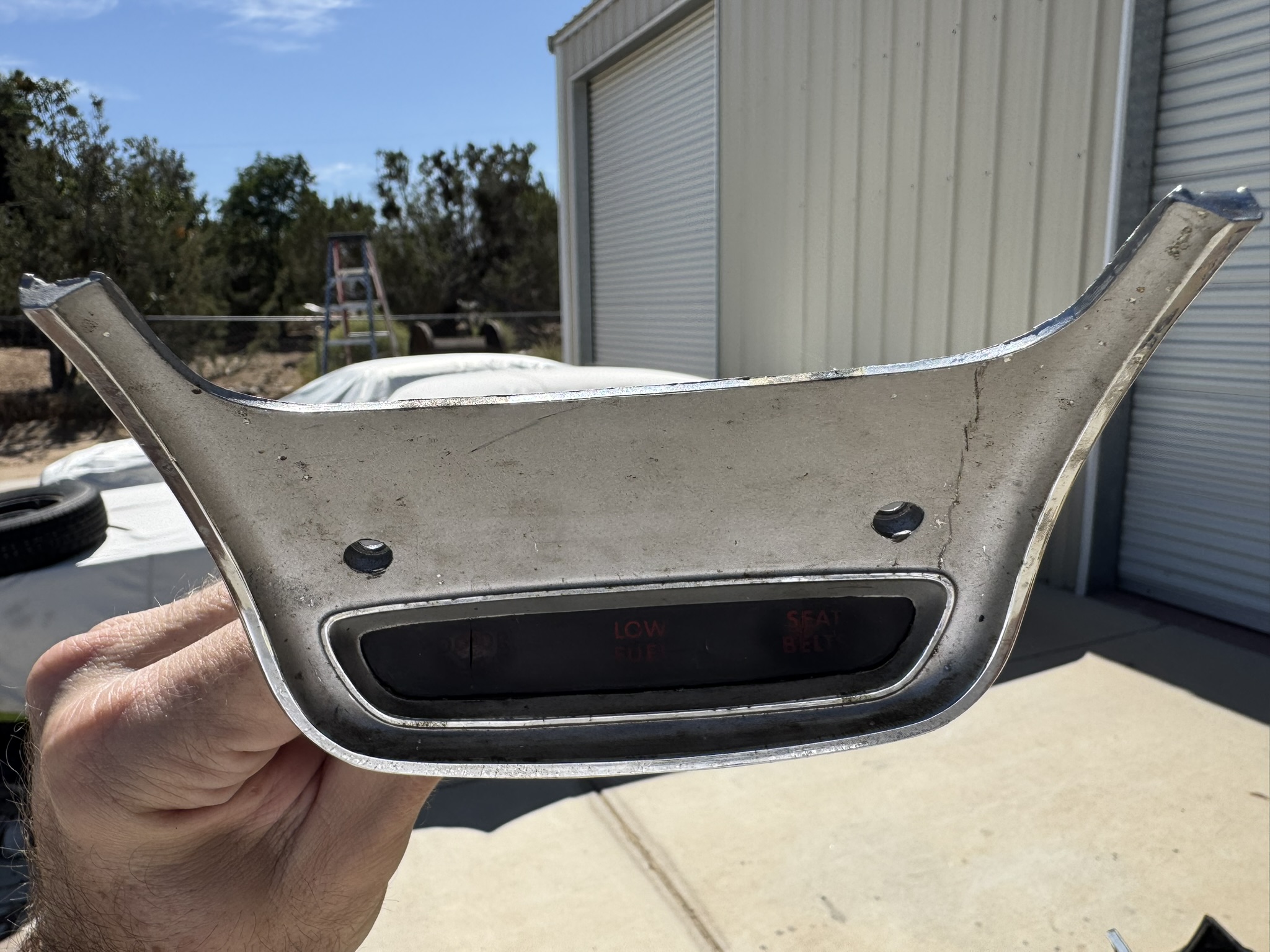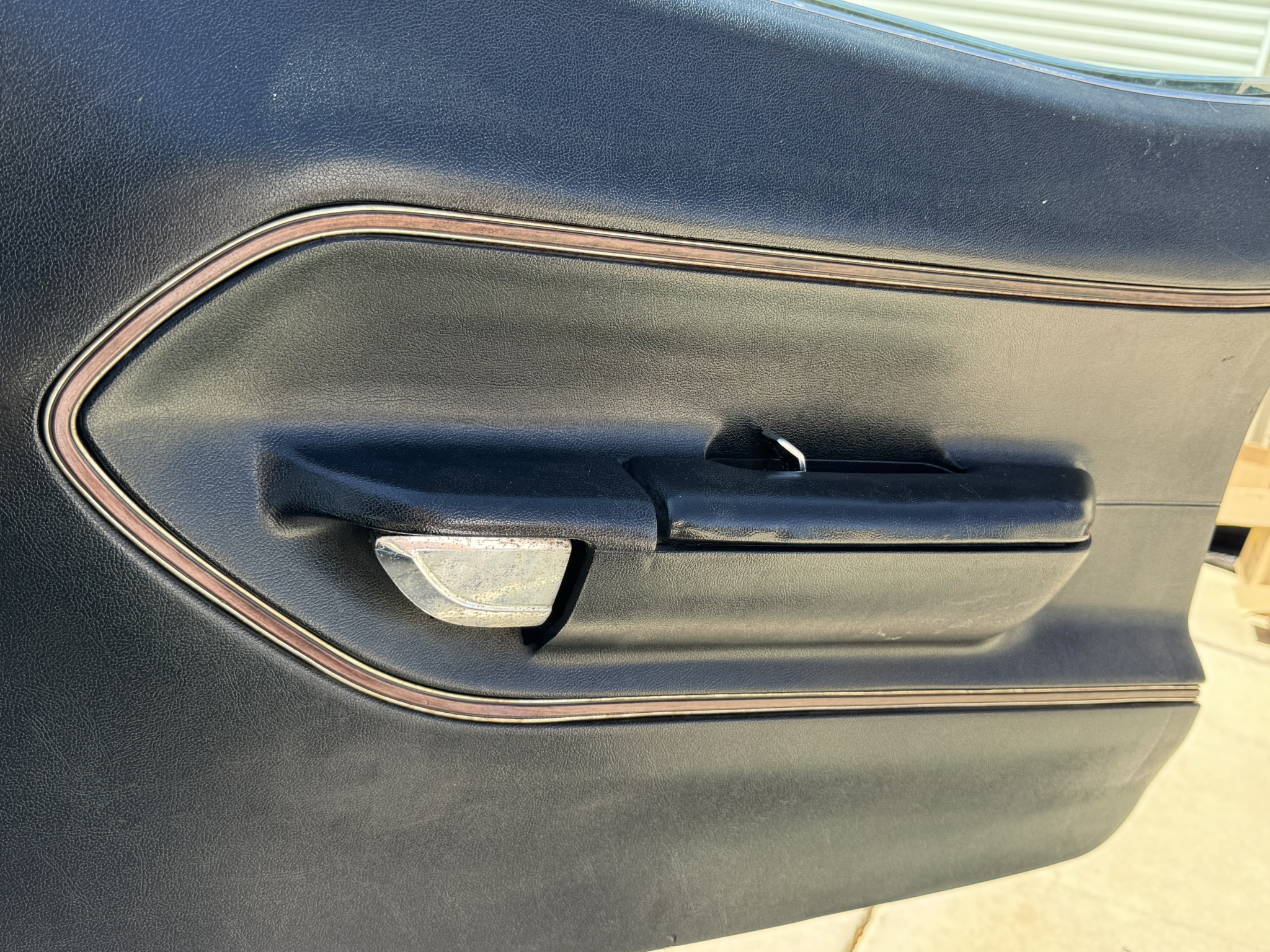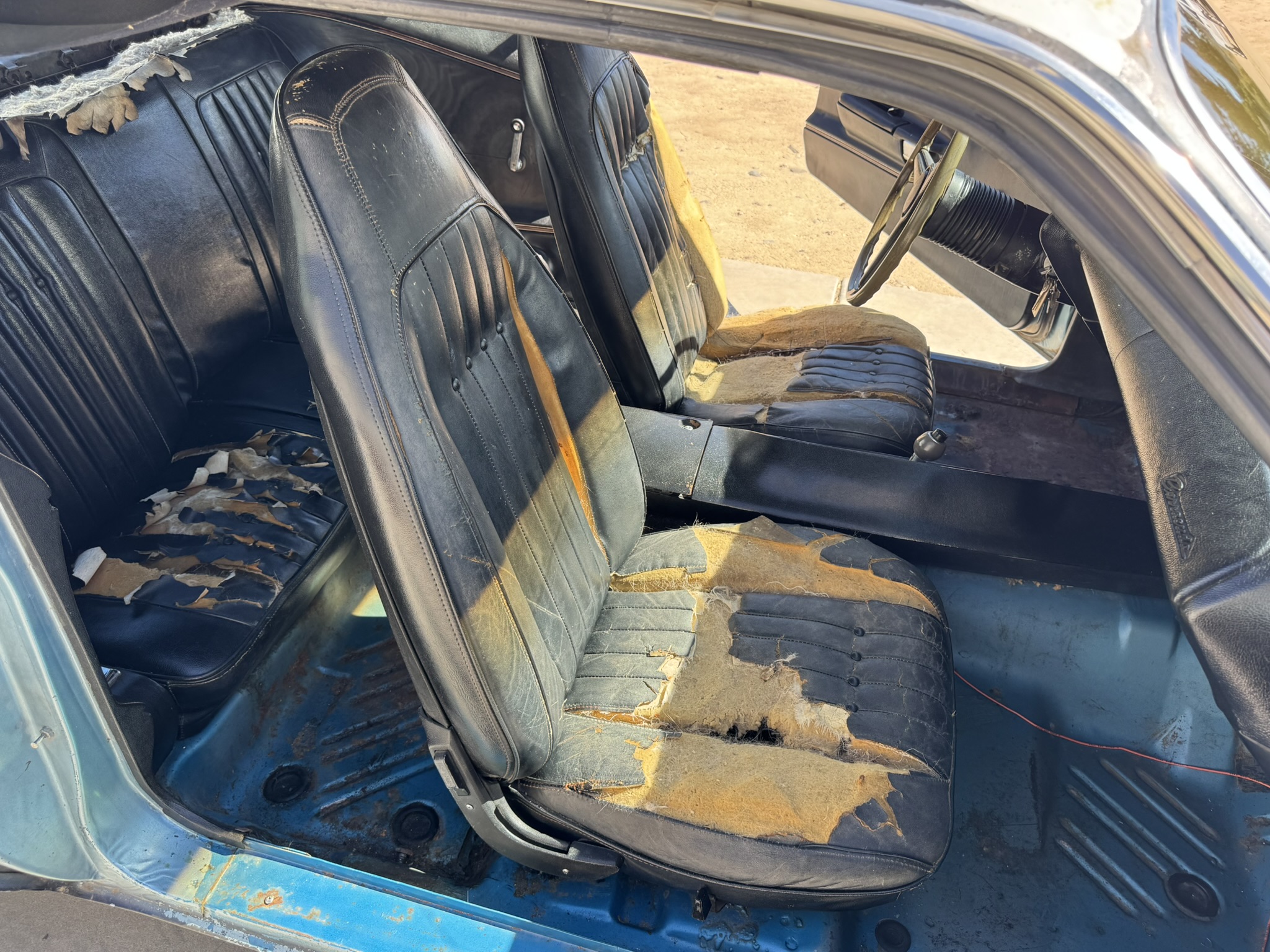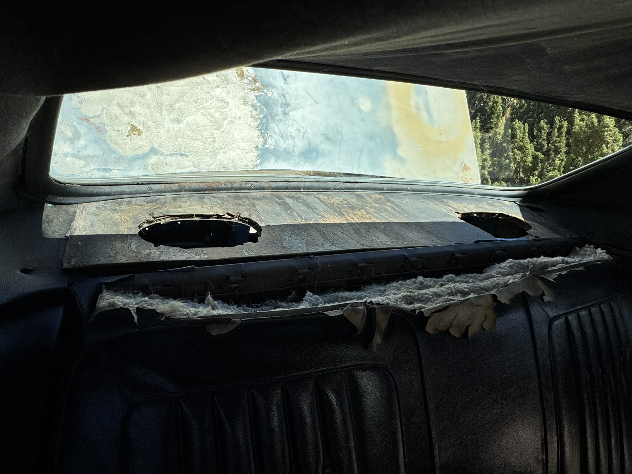 The seats are ready to be recovered with new leather and vinyl seat covers. The headliner in a Gran Coupe is a fiber board covered in a velour-type material, which will need to be re-done. This allows for the overhead console to mount. The overhead console bezel with lights for "Door Ajar", "Low Fuel", and "Seat Belts" will need to be installed. The carpet is missing, requiring a new kit. The dash is in decent shape with a few cracks. The package tray has holes cut for aftermarket speakers and should be replaced. All of the wiring will need to be assessed for completeness and functionality, but it appears intact. The replacement trunk floor is ready to be welded in along with the provided trunk extensions. The floors on the interior do not require any metal work.