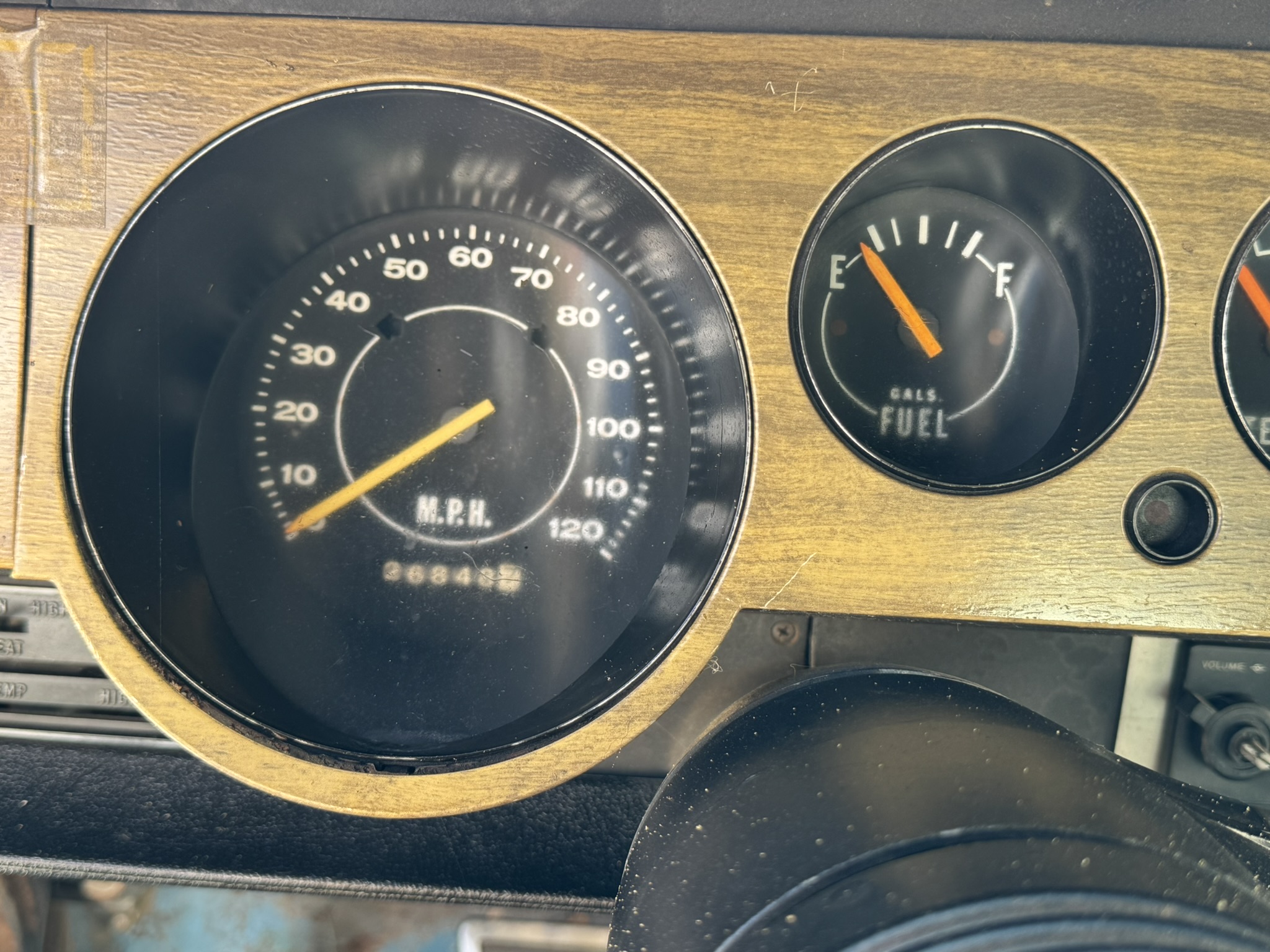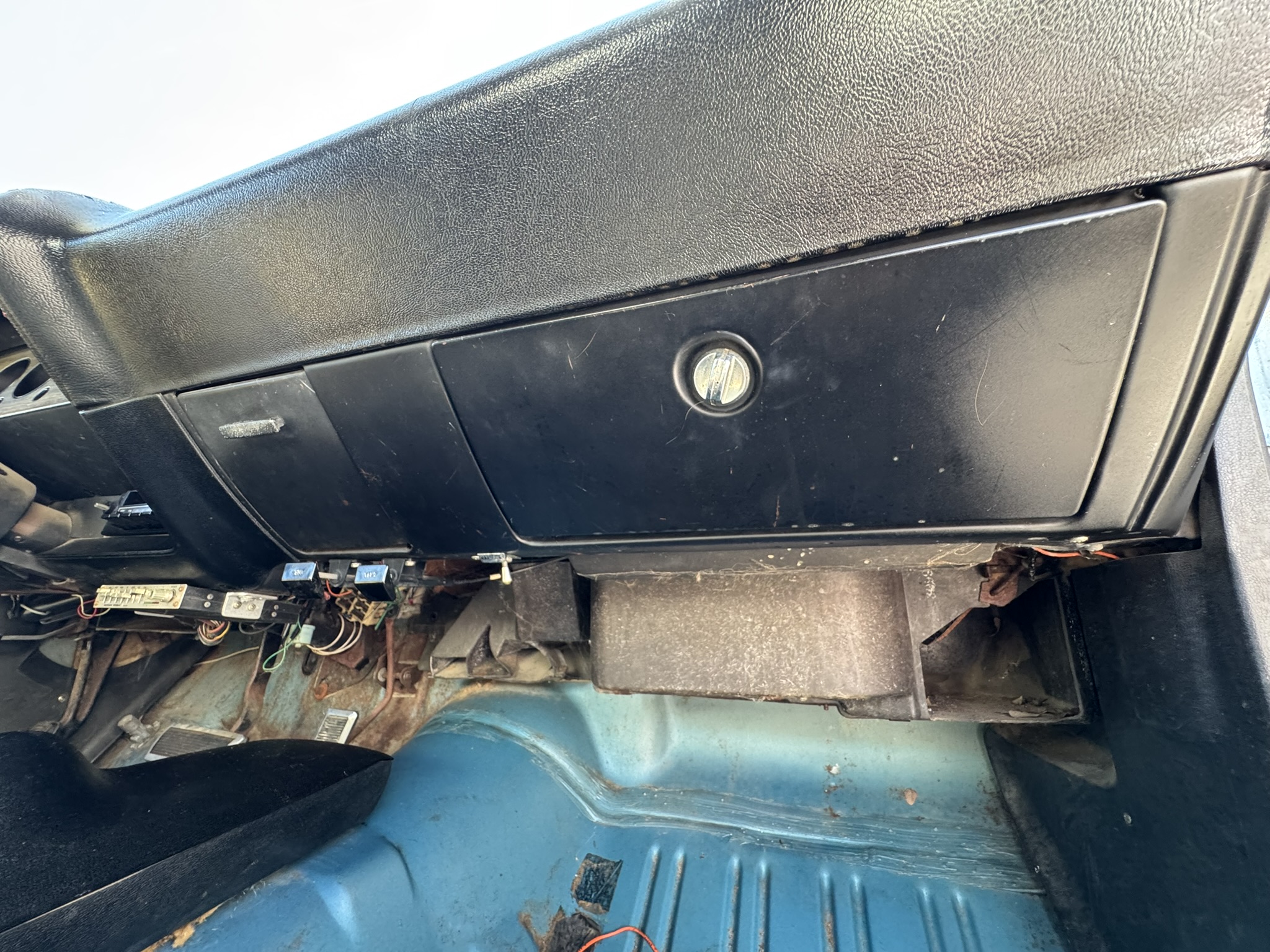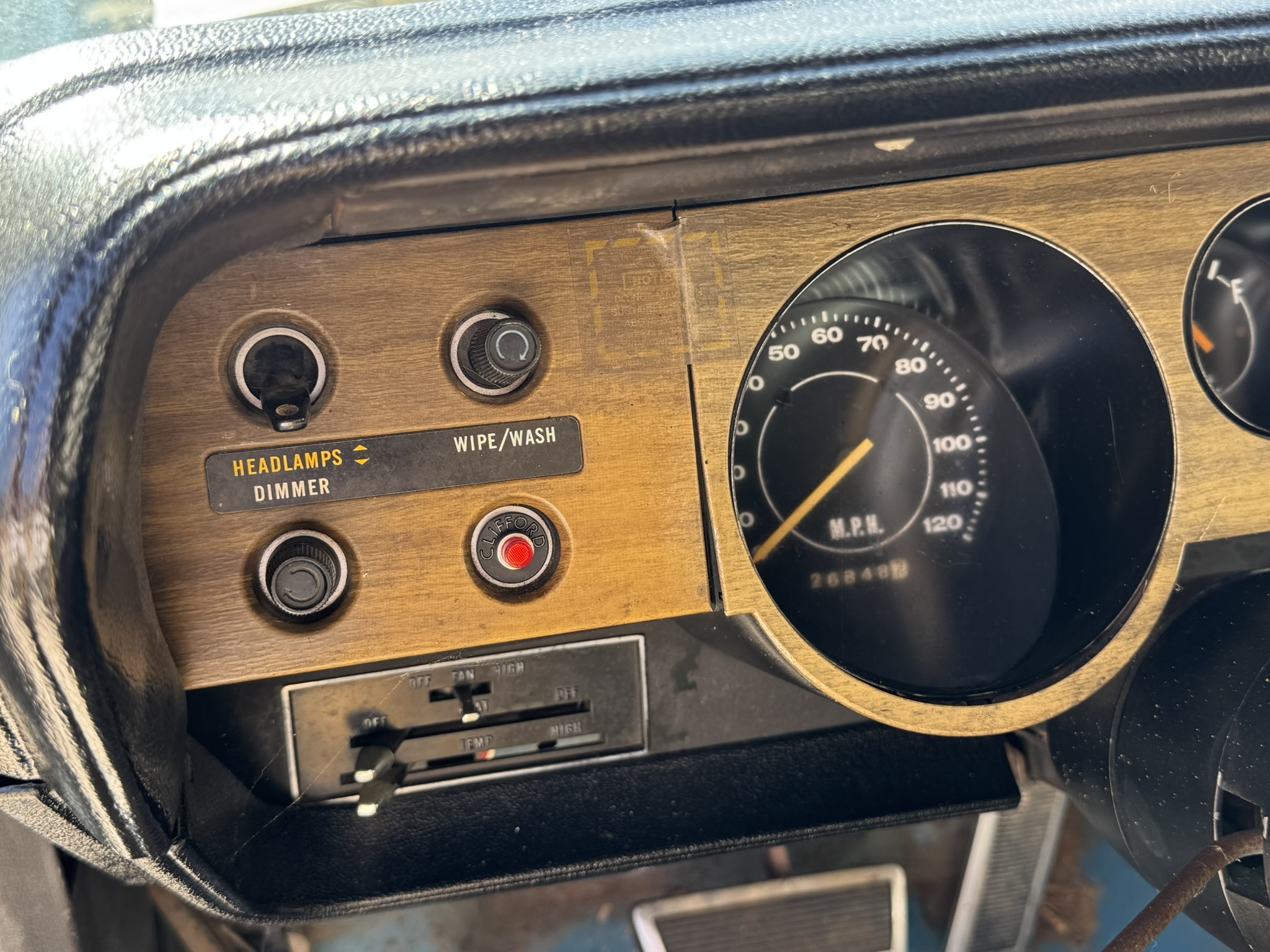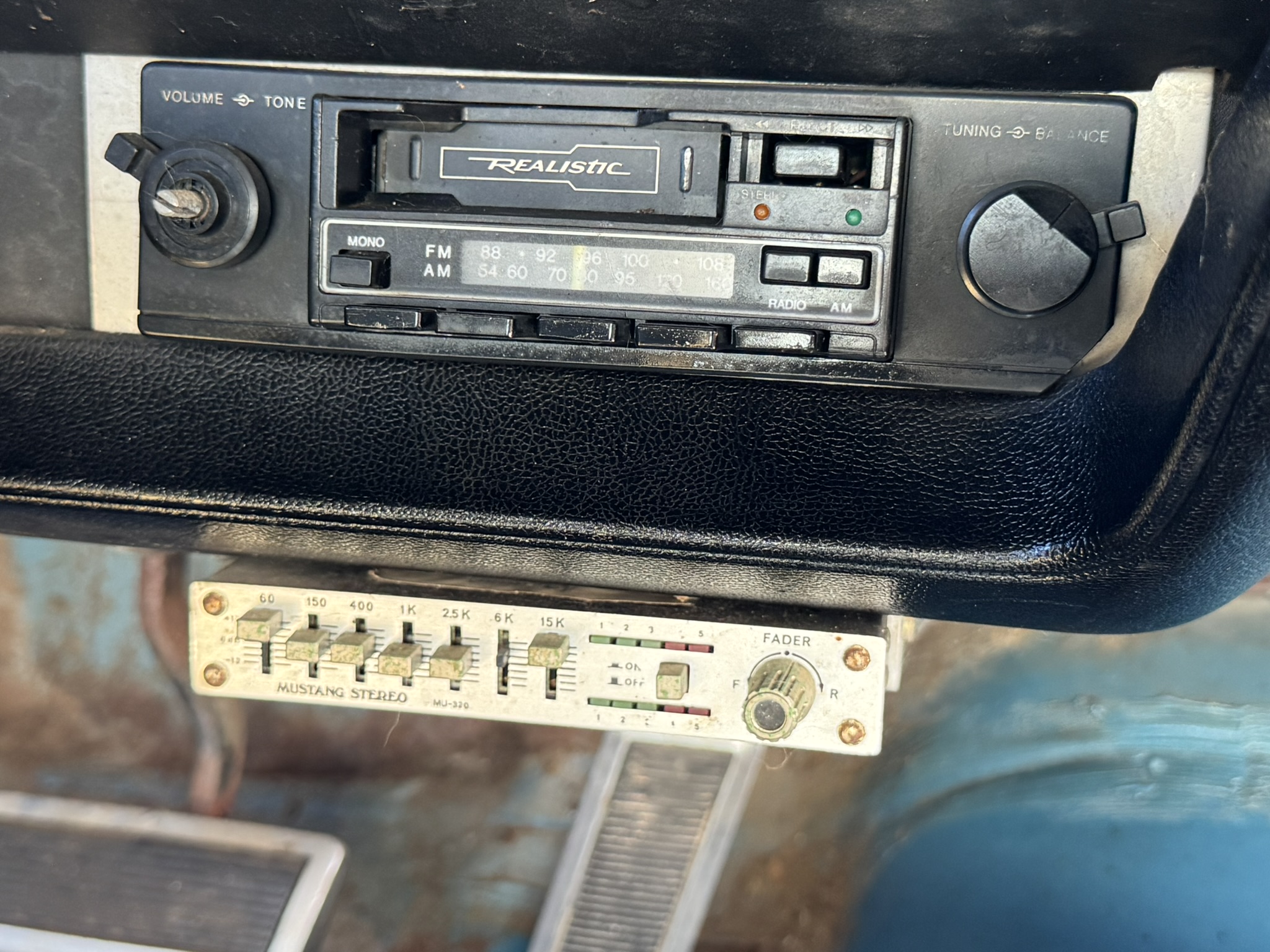 The interior retains its factory original dash with simulated wood grain, gauges, steering wheel, bucket seats, rear seat, consoles, door panels, and rear interior panels. The glove box, door and lock are in good condition. There is an aftermarket radio and an equalizer mounted under the dash. The original seat belts are included and uninstalled. The floors are in excellent condition with only some surface rust in a few spots, no rot.