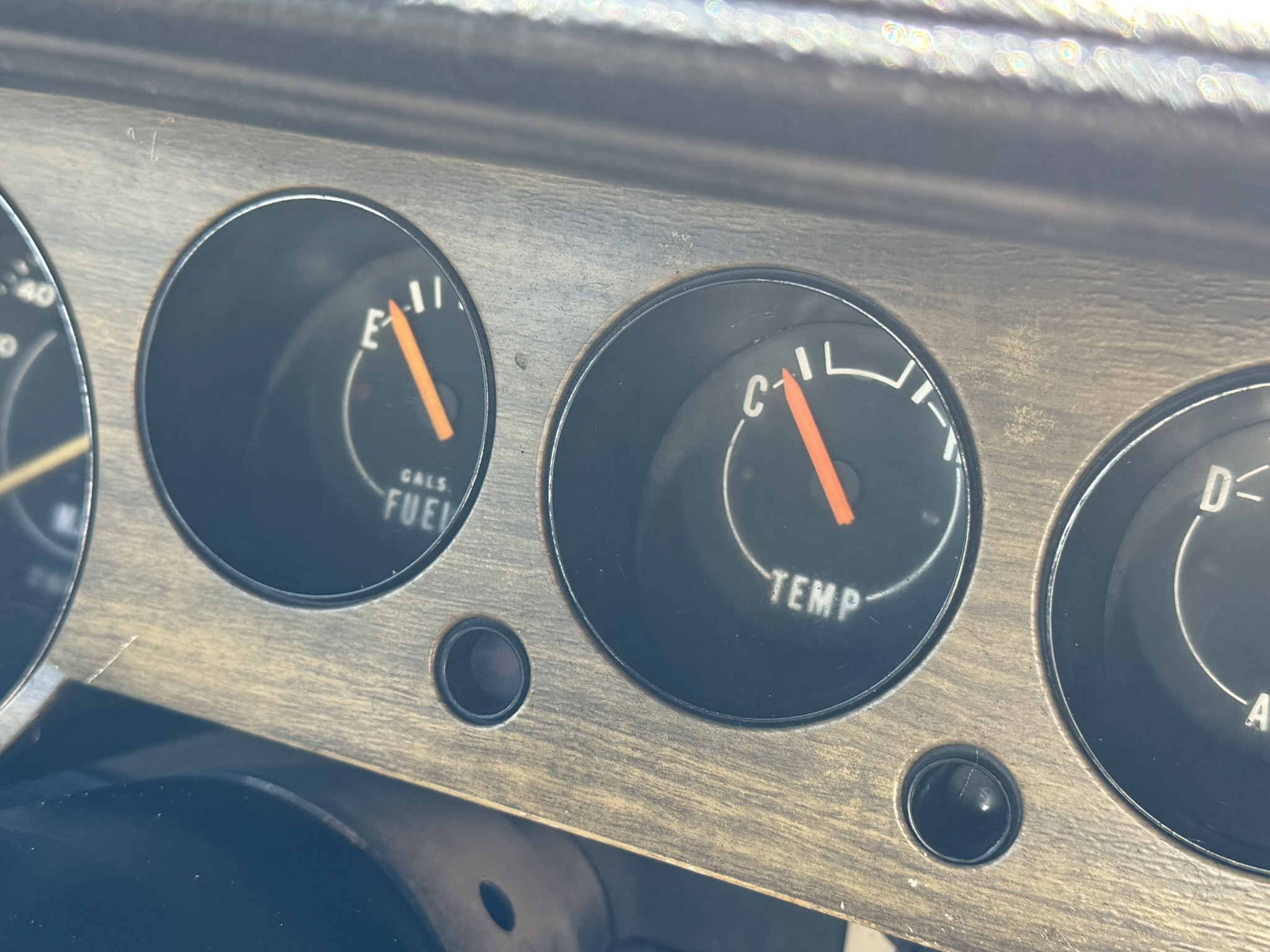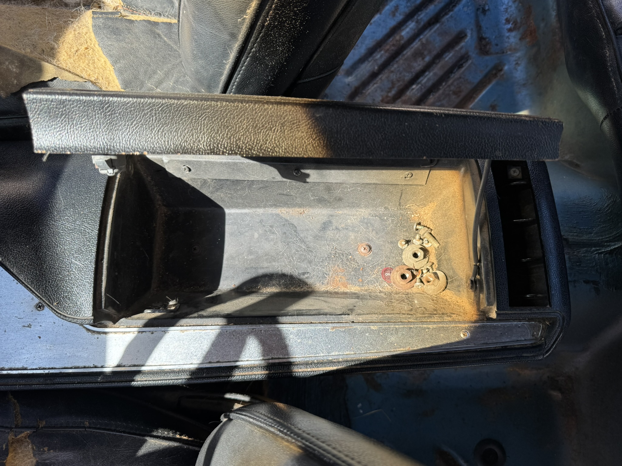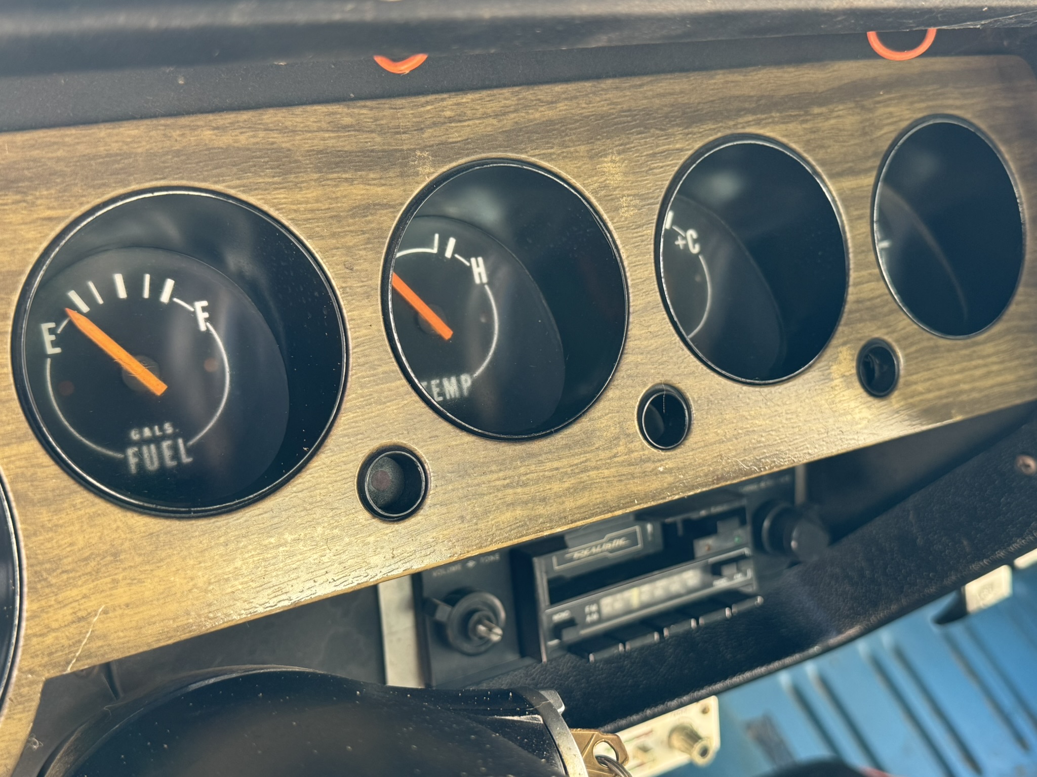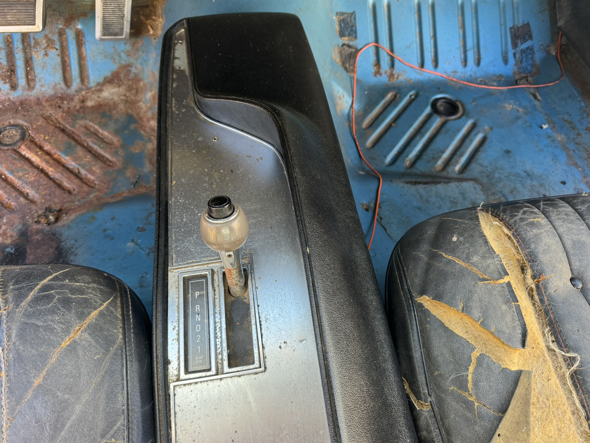 The interior retains its factory original dash with simulated wood grain, gauges, steering wheel, bucket seats, rear seat, consoles, door panels, and rear interior panels. The glove box, door and lock are in good condition. There is an aftermarket radio and an equalizer mounted under the dash. The original seat belts are included and uninstalled. The floors are in excellent condition with only some surface rust in a few spots, no rot.