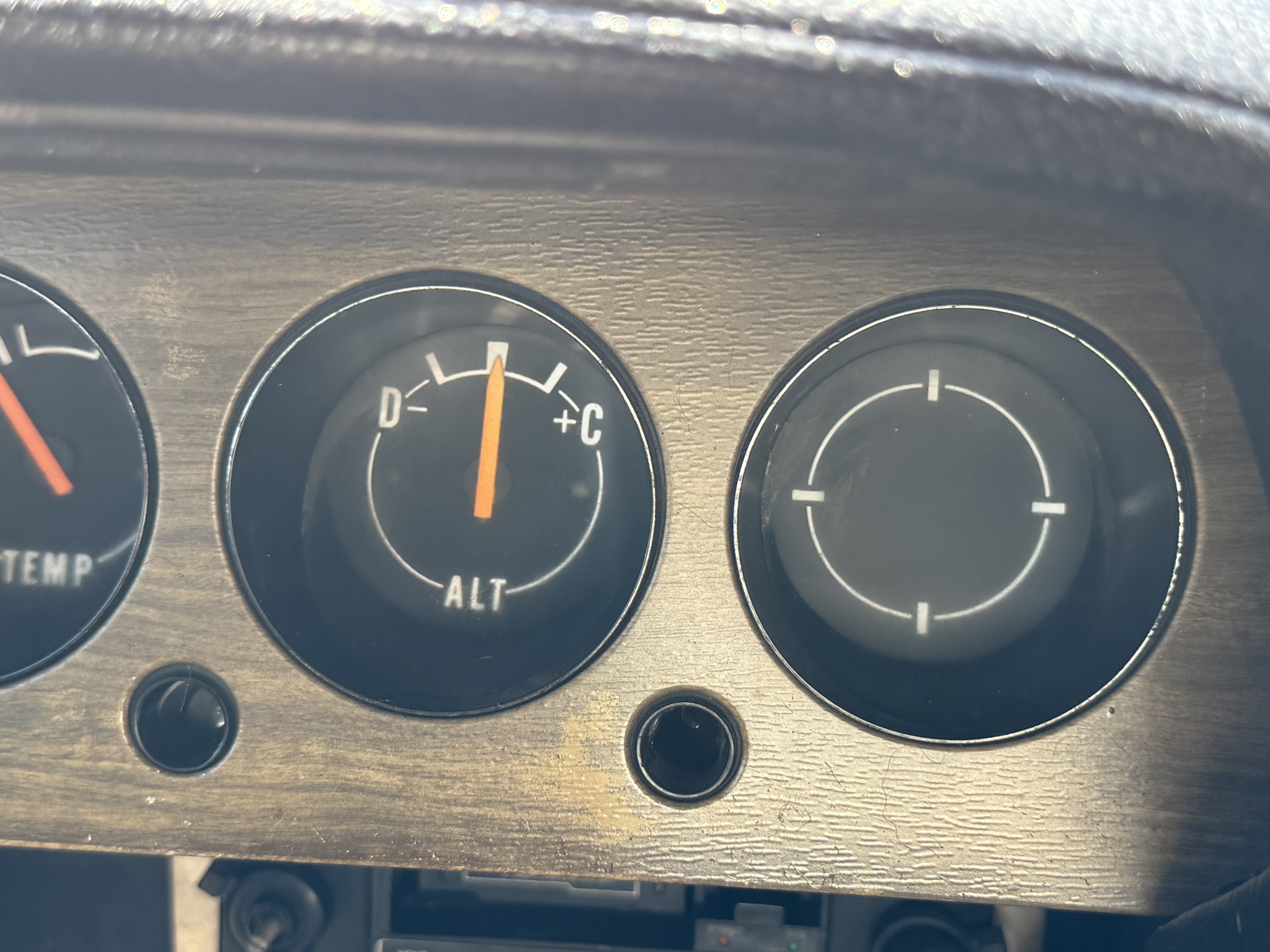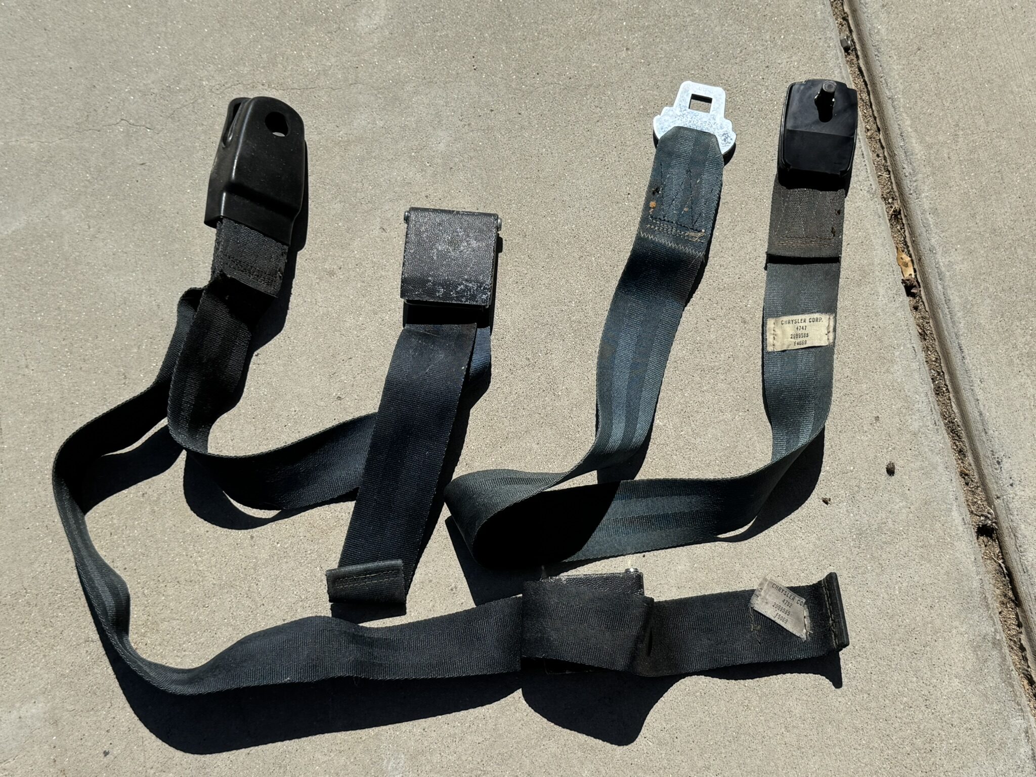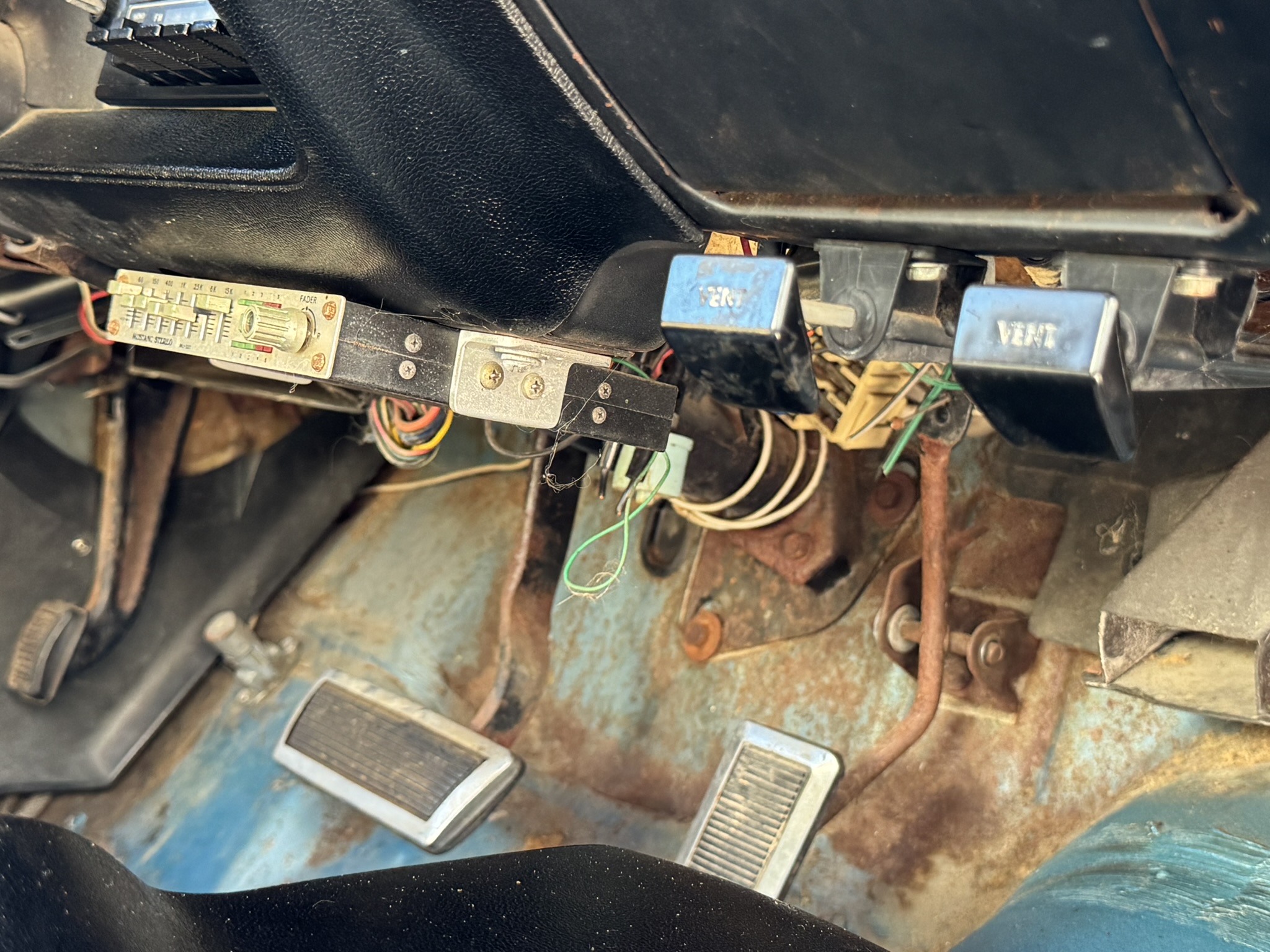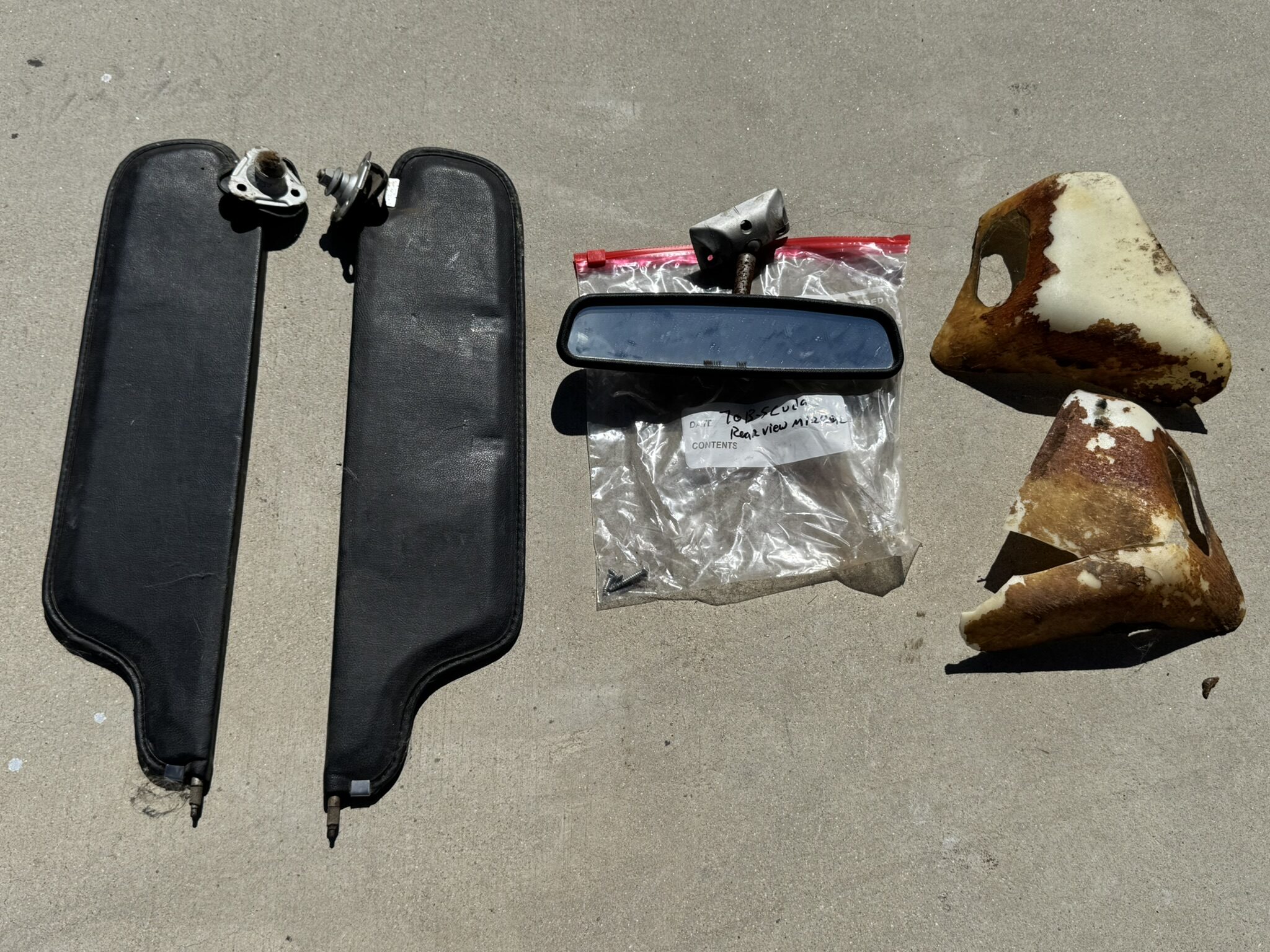 The interior retains its factory original dash with simulated wood grain, gauges, steering wheel, bucket seats, rear seat, consoles, door panels, and rear interior panels. The glove box, door and lock are in good condition. There is an aftermarket radio and an equalizer mounted under the dash. The original seat belts are included and uninstalled. The floors are in excellent condition with only some surface rust in a few spots, no rot.