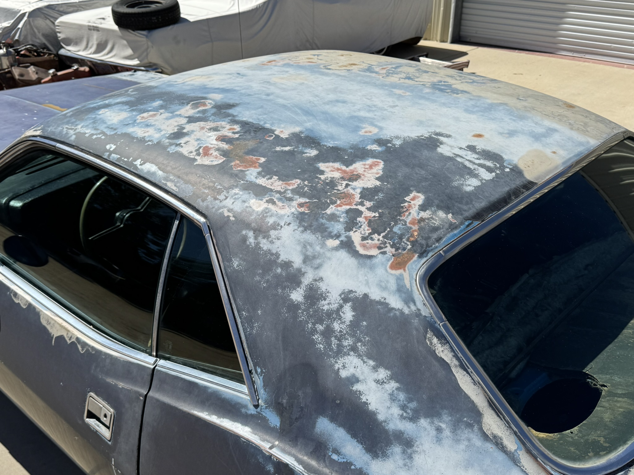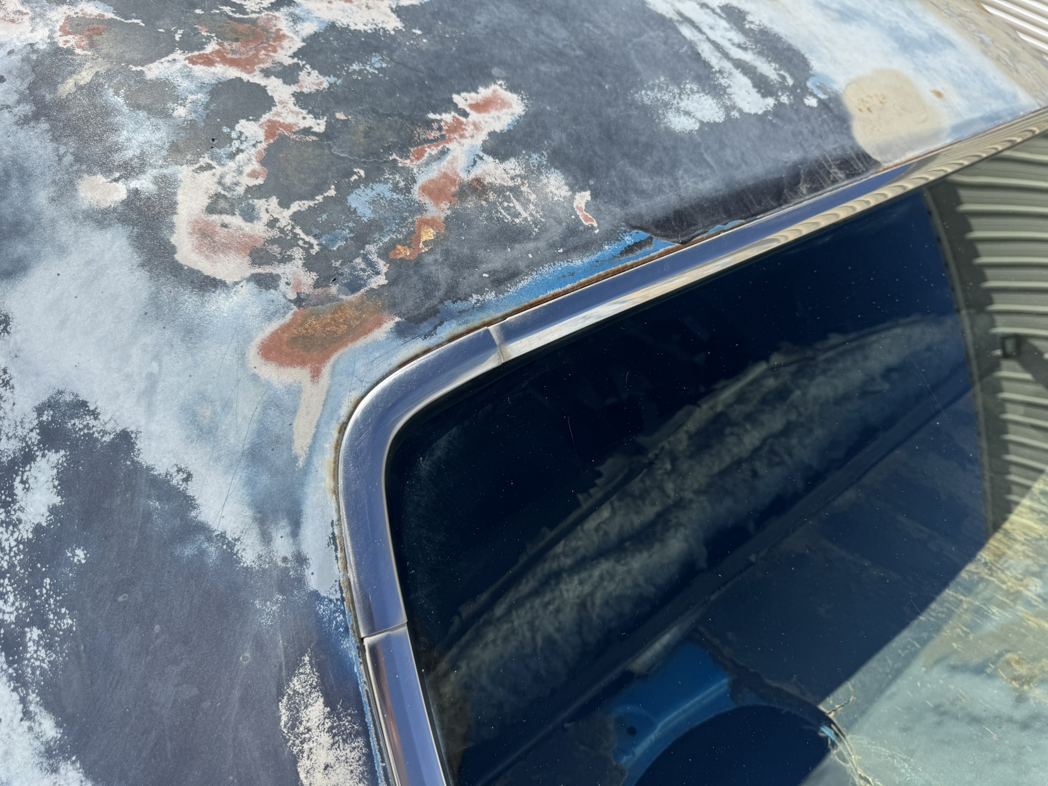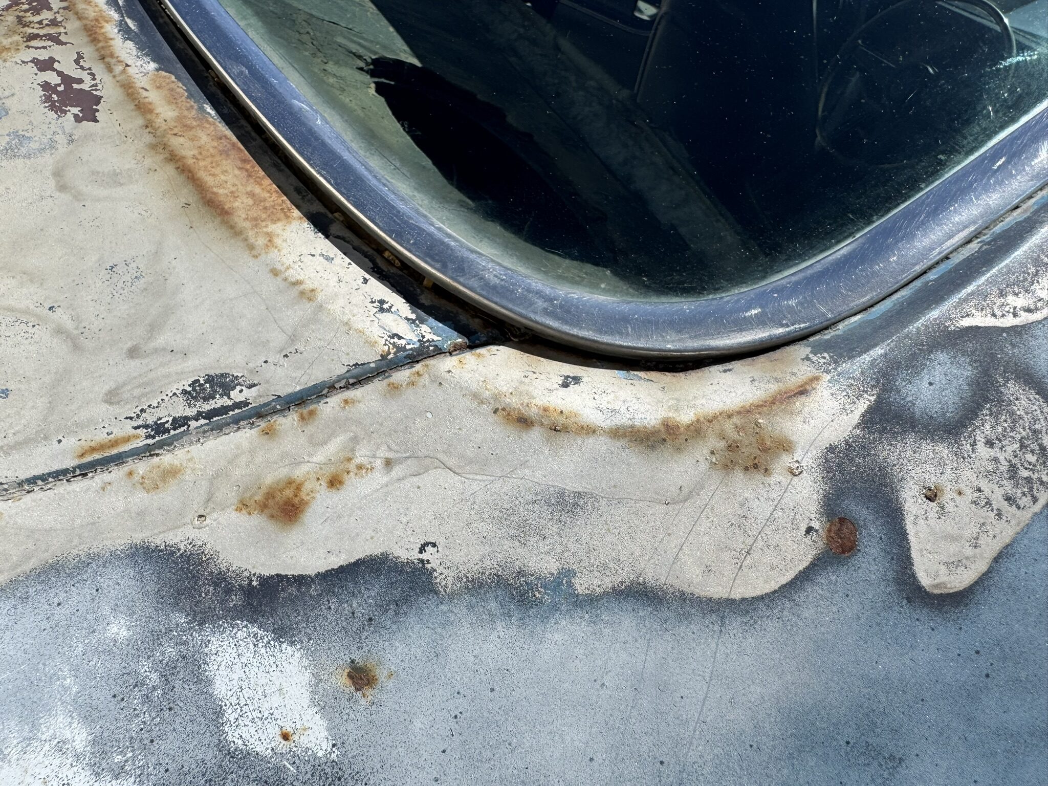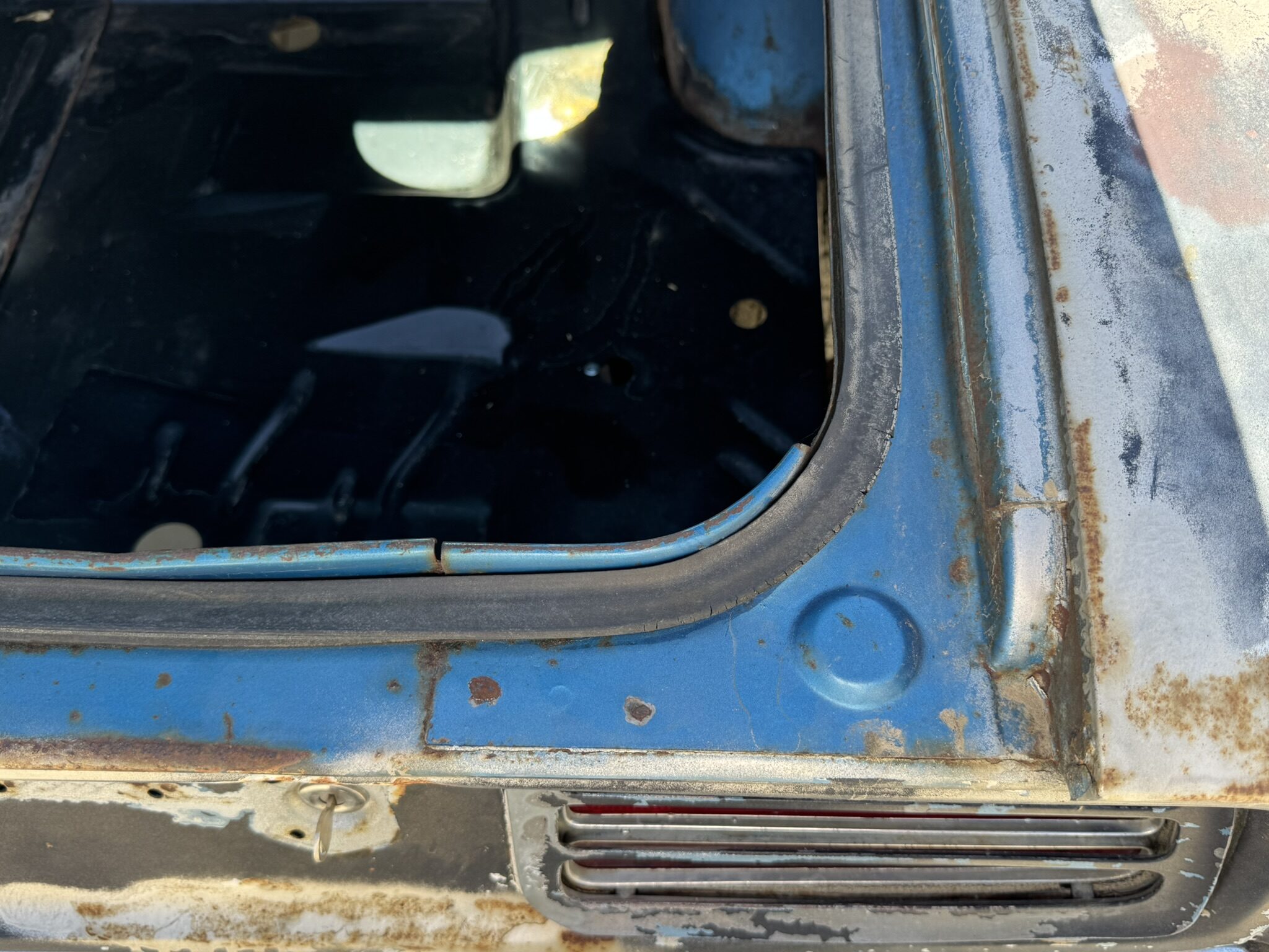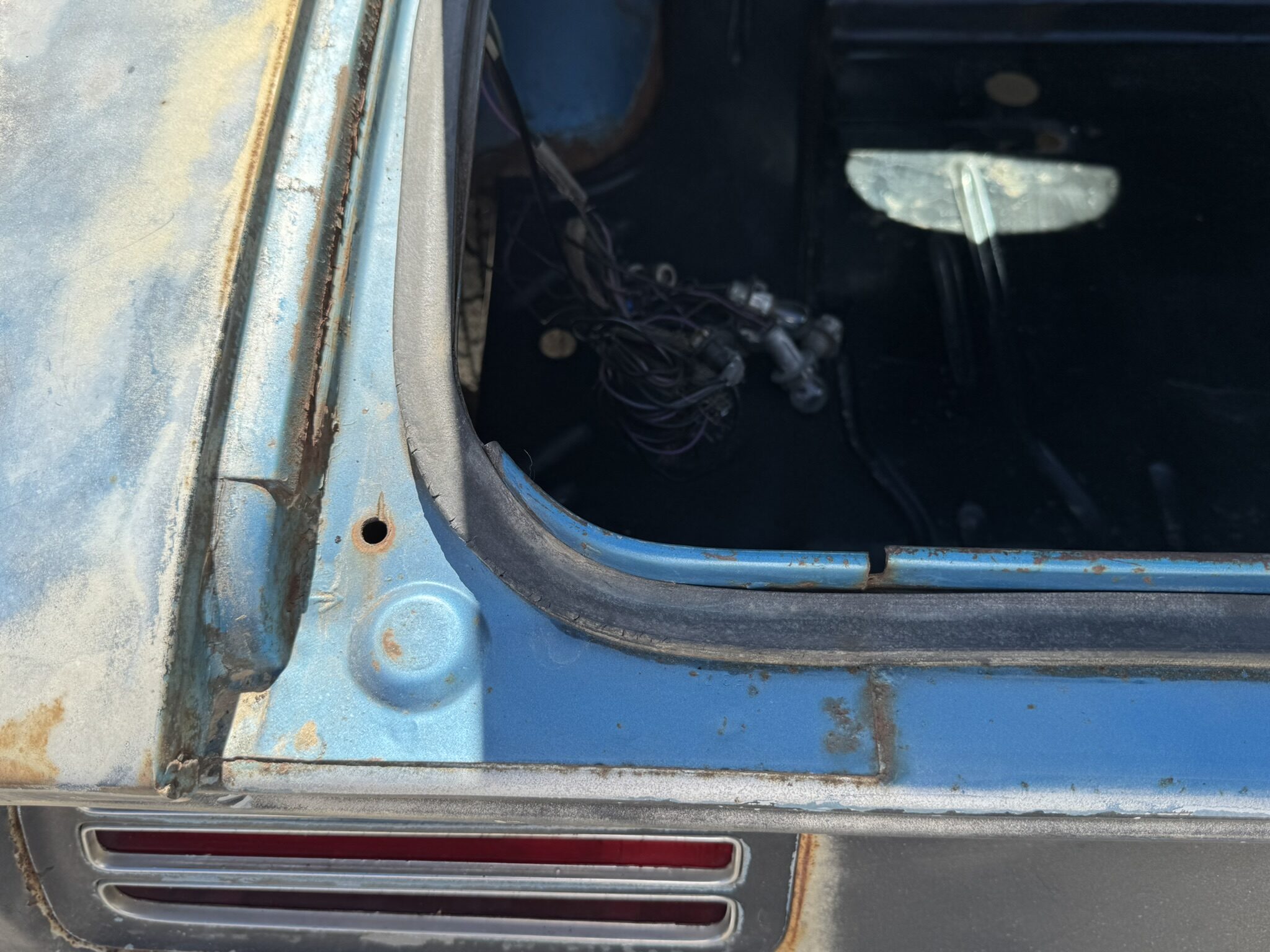 Bodywork will be focused on the passenger lower rear quarter where there is rust and the area that has a patch panel started. The rear part of the quarter can be repaired with patch panel. The factory seams on the roof need to be ground out and refilled. All new weather stripping is required. Both license plate brackets are included