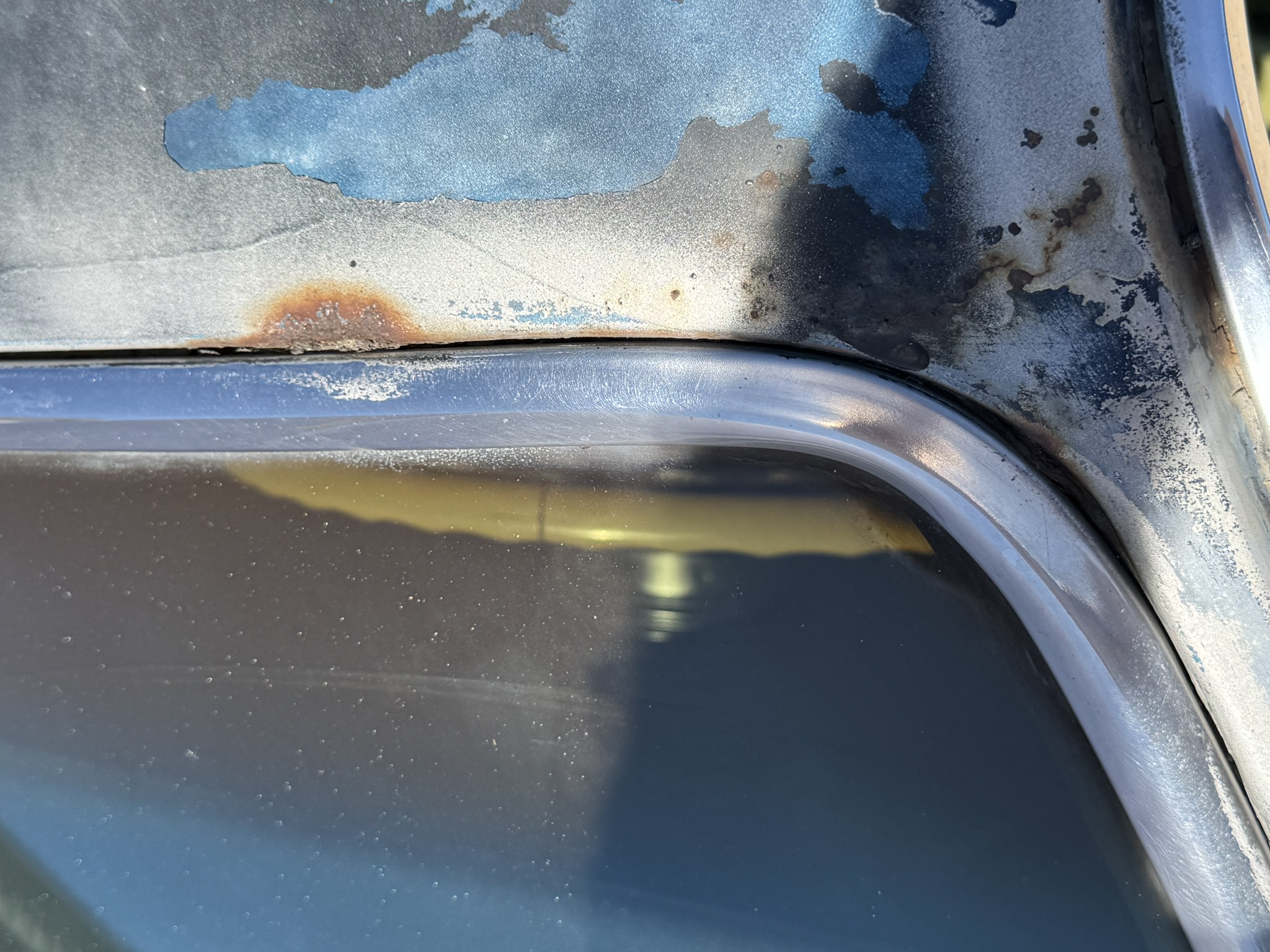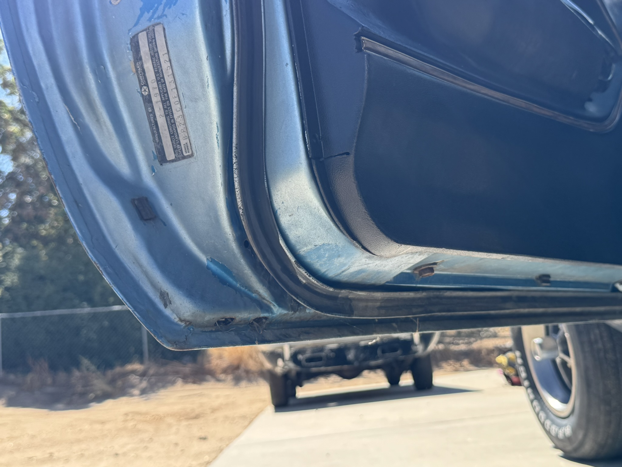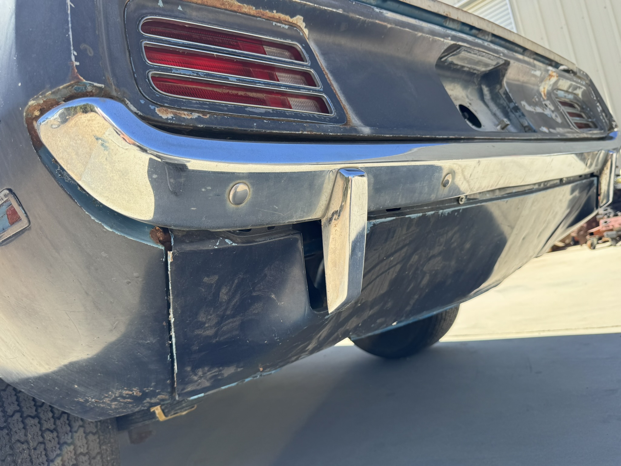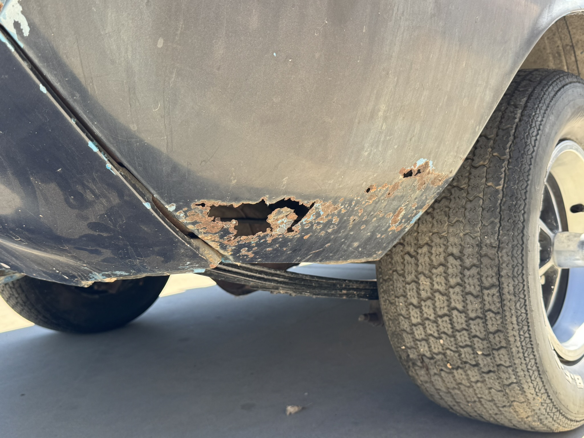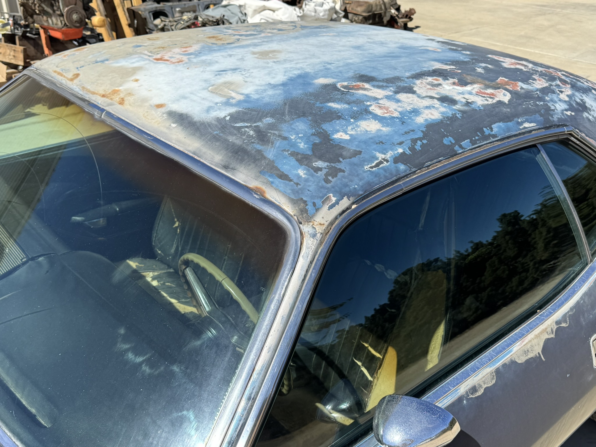 Bodywork will be focused on the passenger lower rear quarter where there is rust and the area that has a patch panel started. The rear part of the quarter can be repaired with patch panel. The factory seams on the roof need to be ground out and refilled. All new weather stripping is required. Both license plate brackets are included