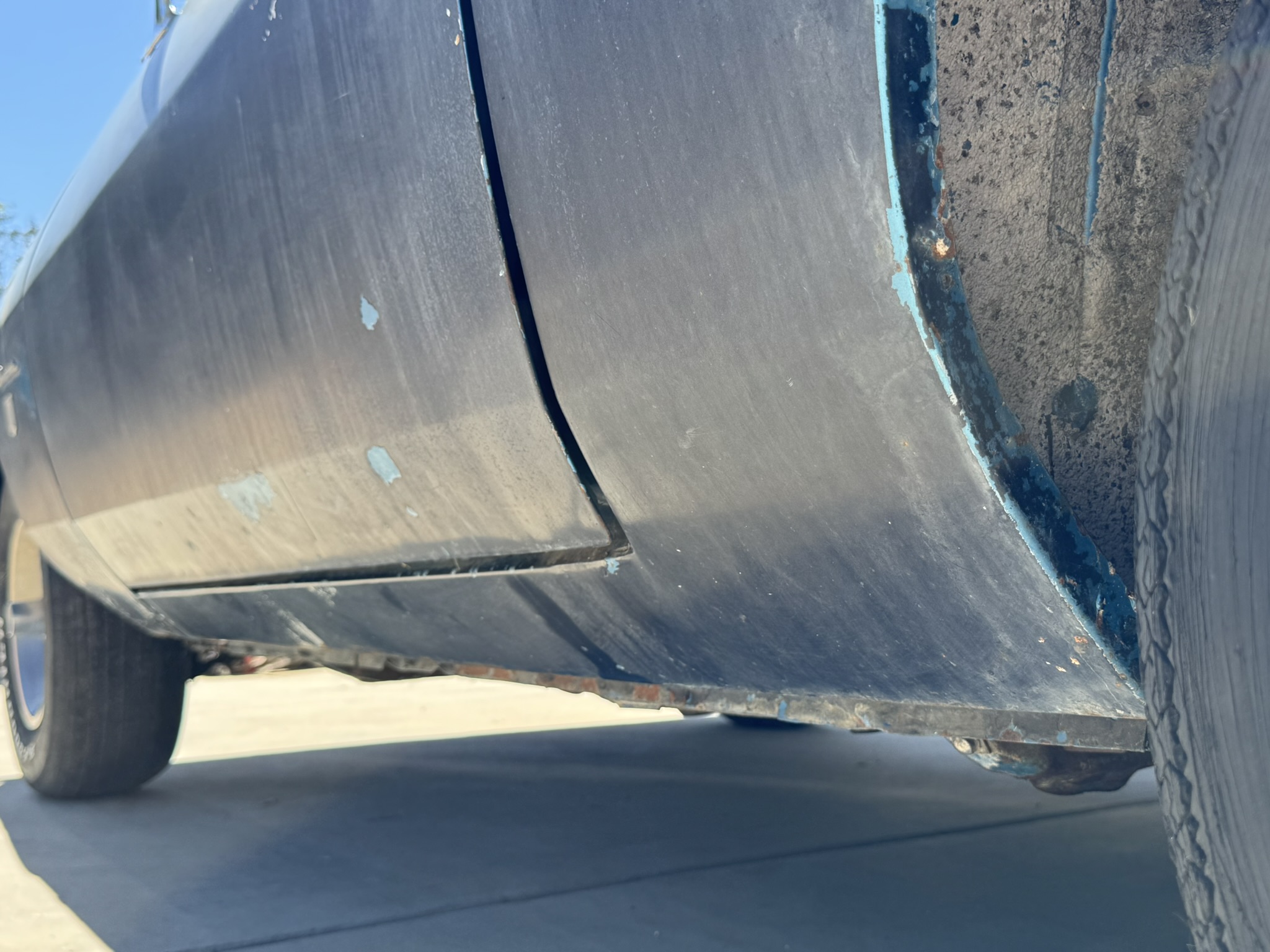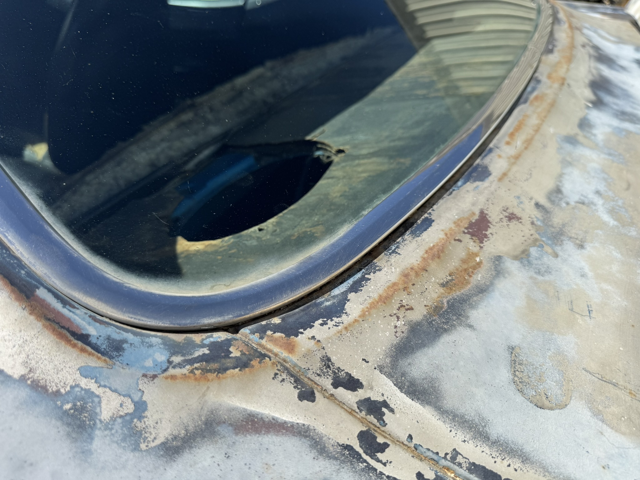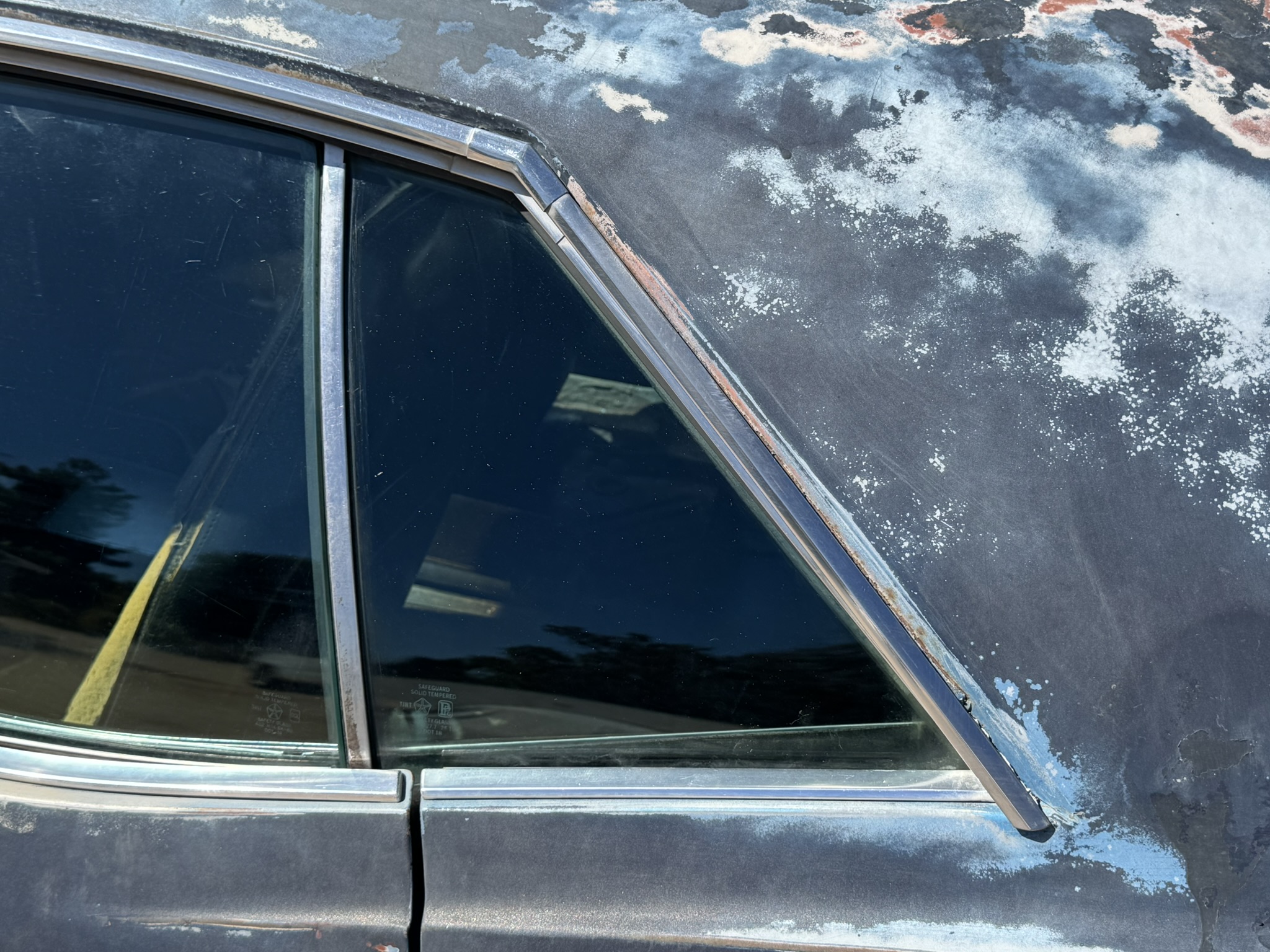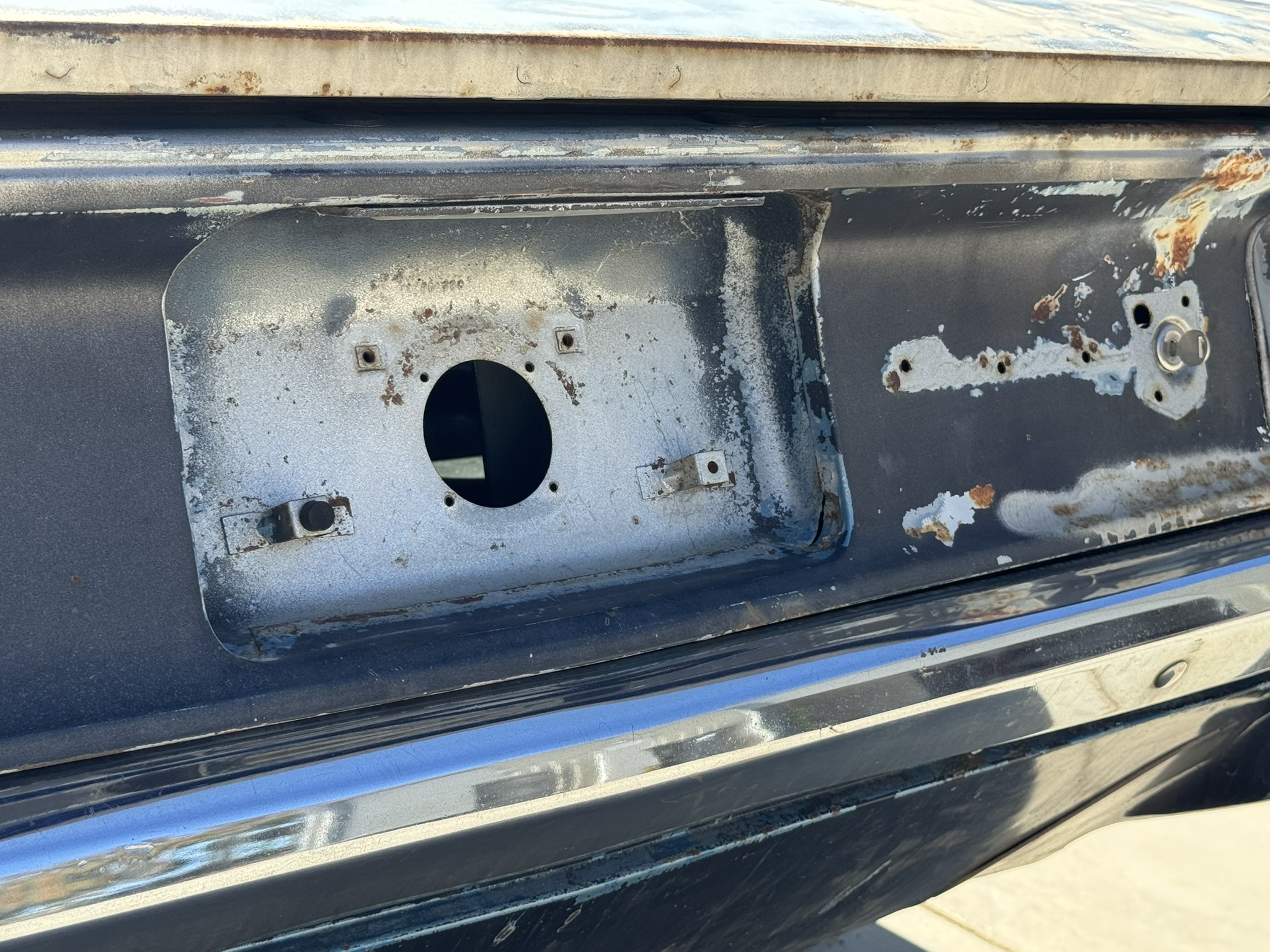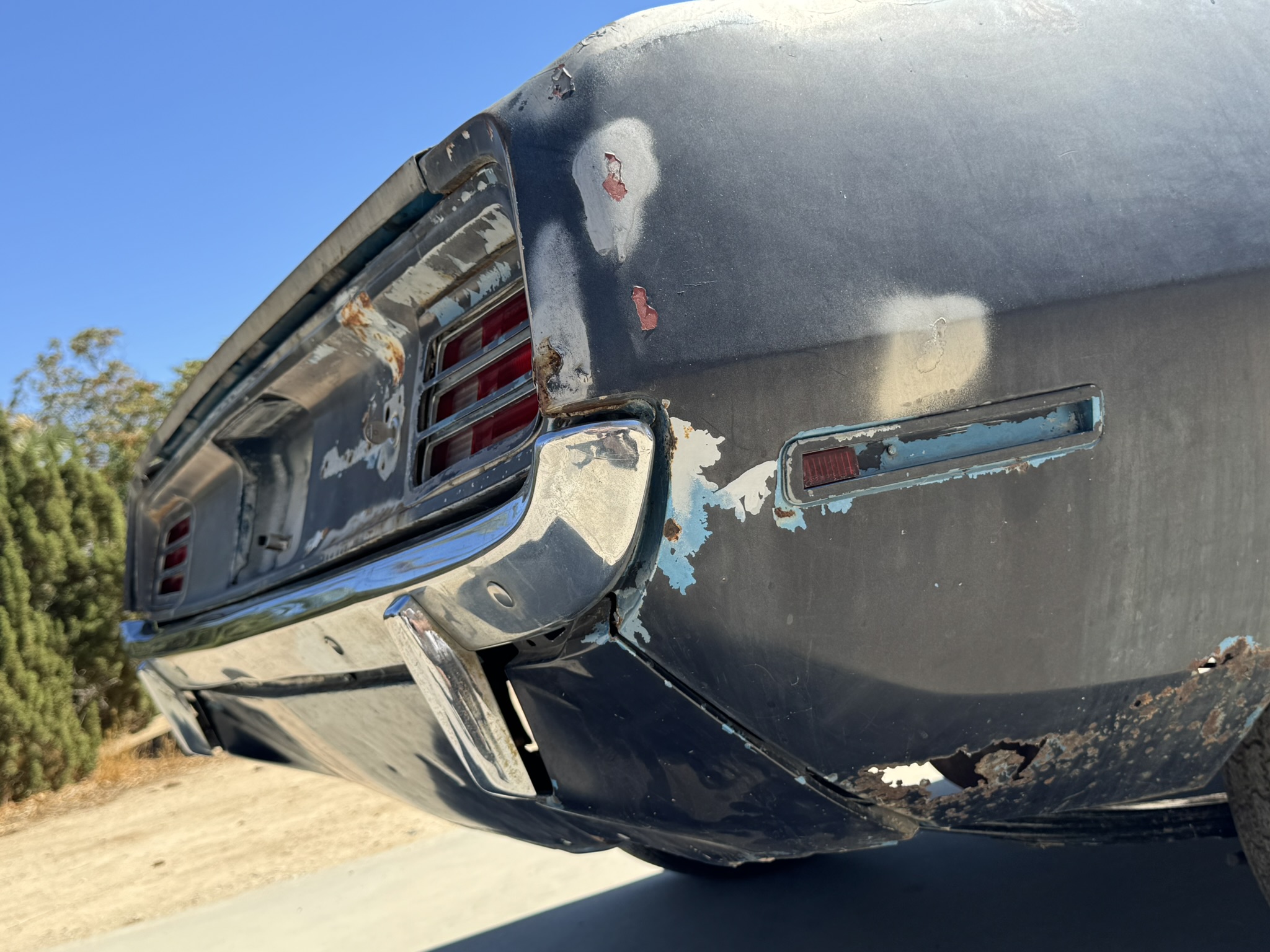 Bodywork will be focused on the passenger lower rear quarter where there is rust and the area that has a patch panel started. The rear part of the quarter can be repaired with patch panel. The factory seams on the roof need to be ground out and refilled. All new weather stripping is required. Both license plate brackets are included