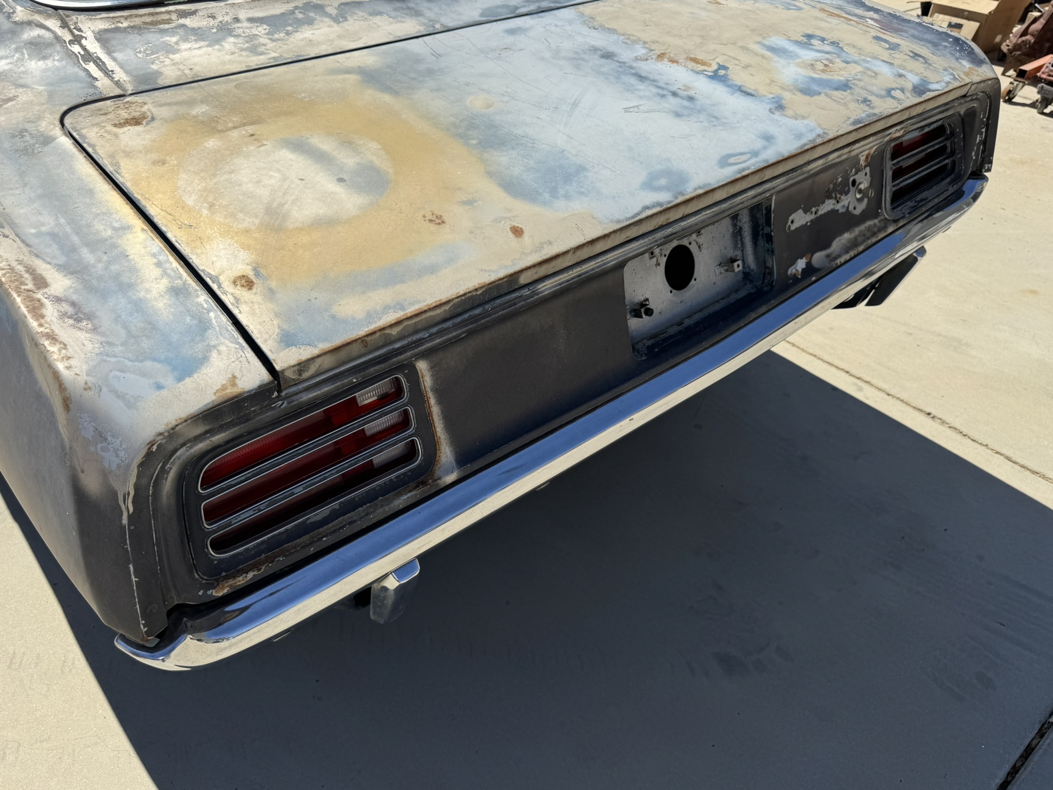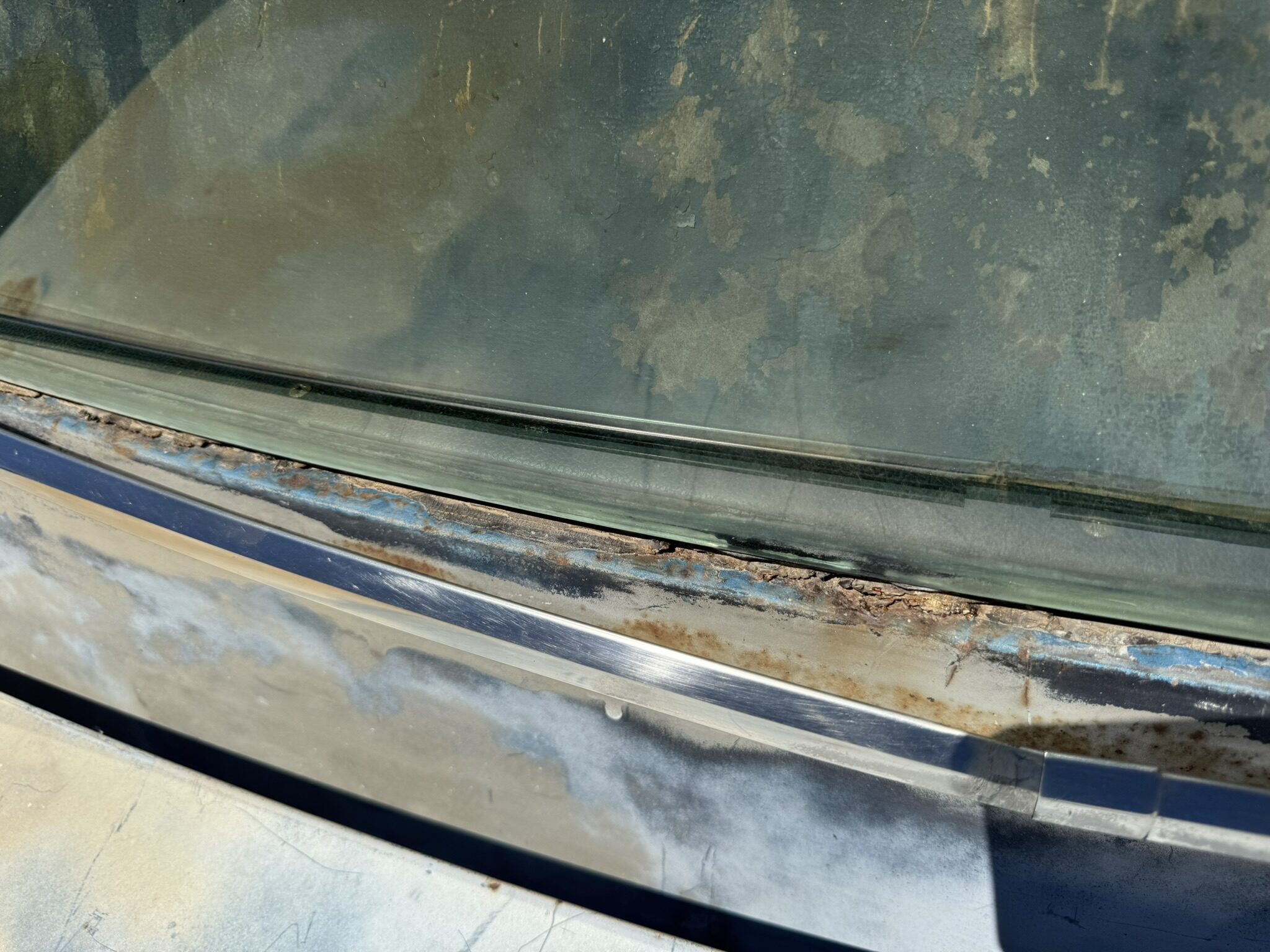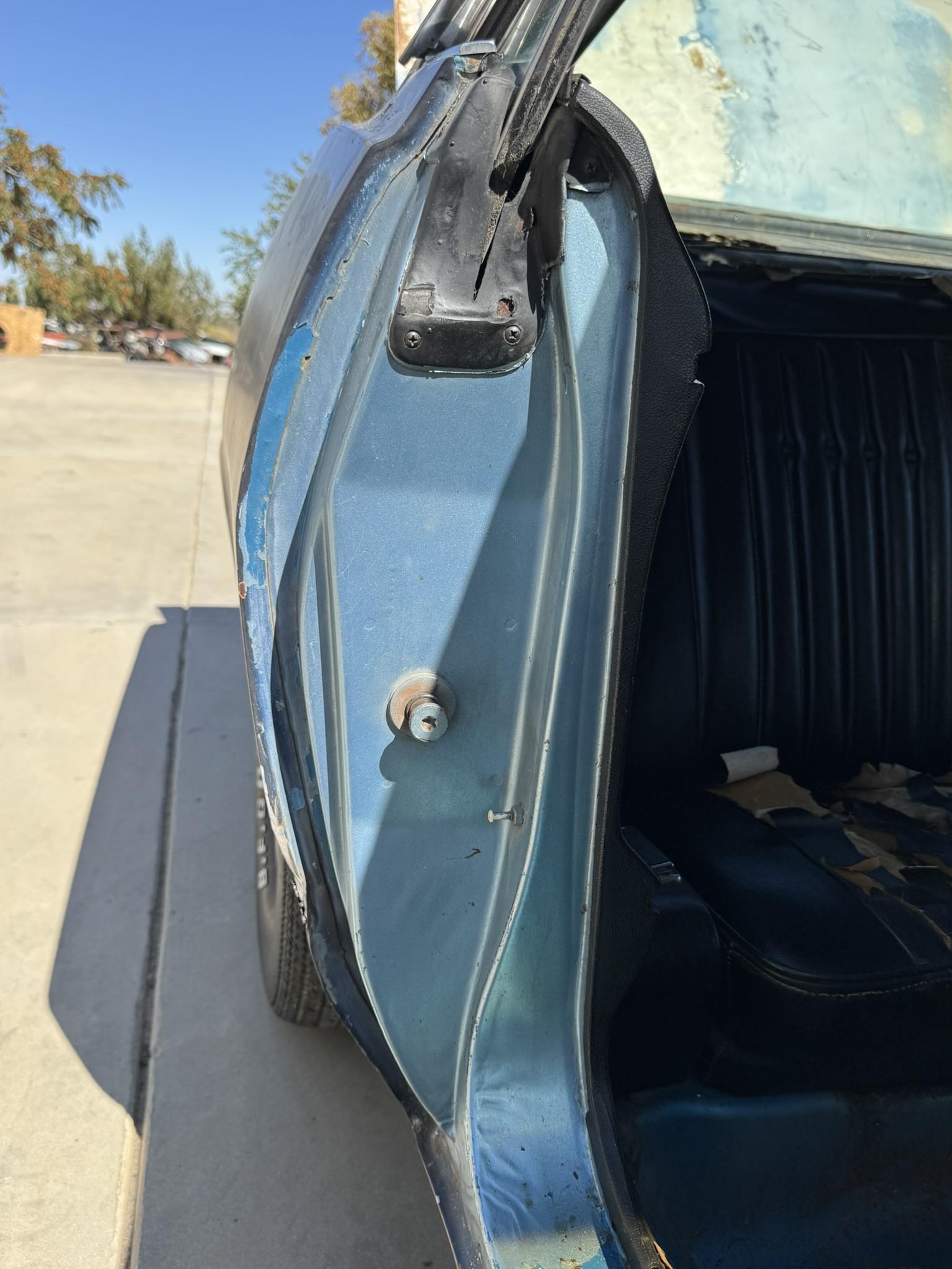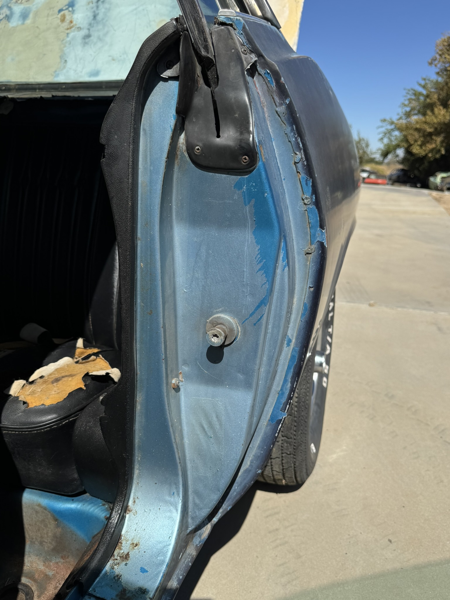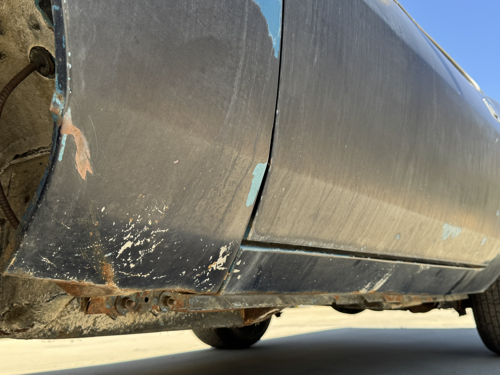 Bodywork will be focused on the passenger lower rear quarter where there is rust and the area that has a patch panel started. The rear part of the quarter can be repaired with patch panel. The factory seams on the roof need to be ground out and refilled. All new weather stripping is required. Both license plate brackets are included