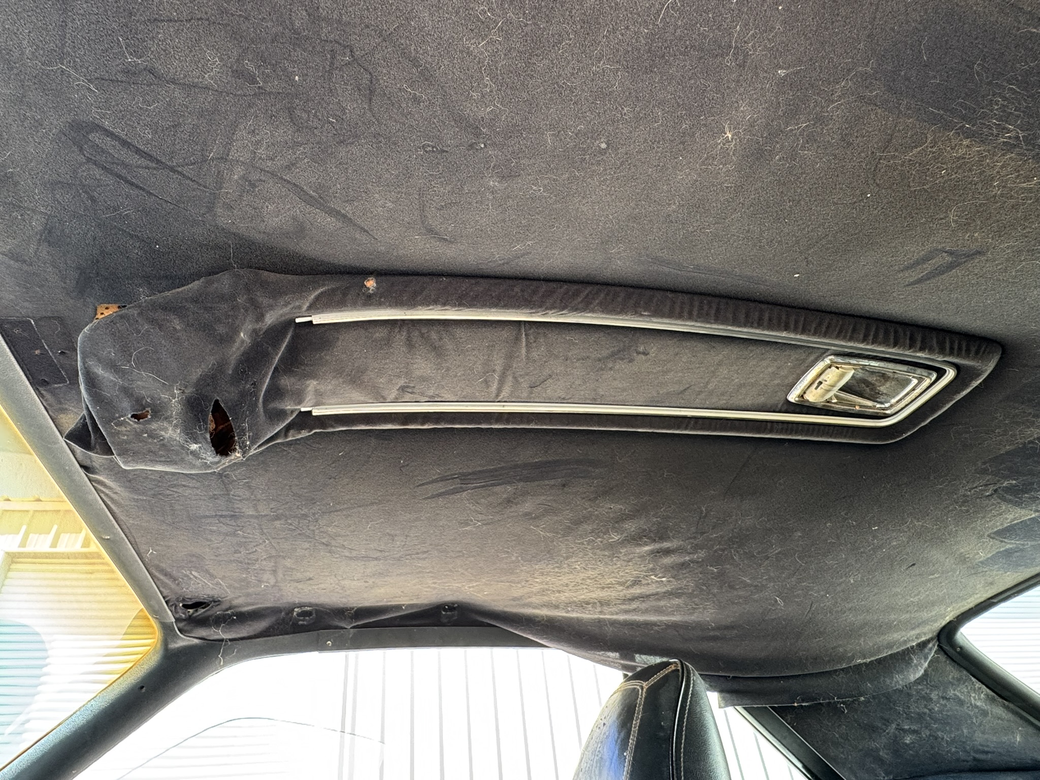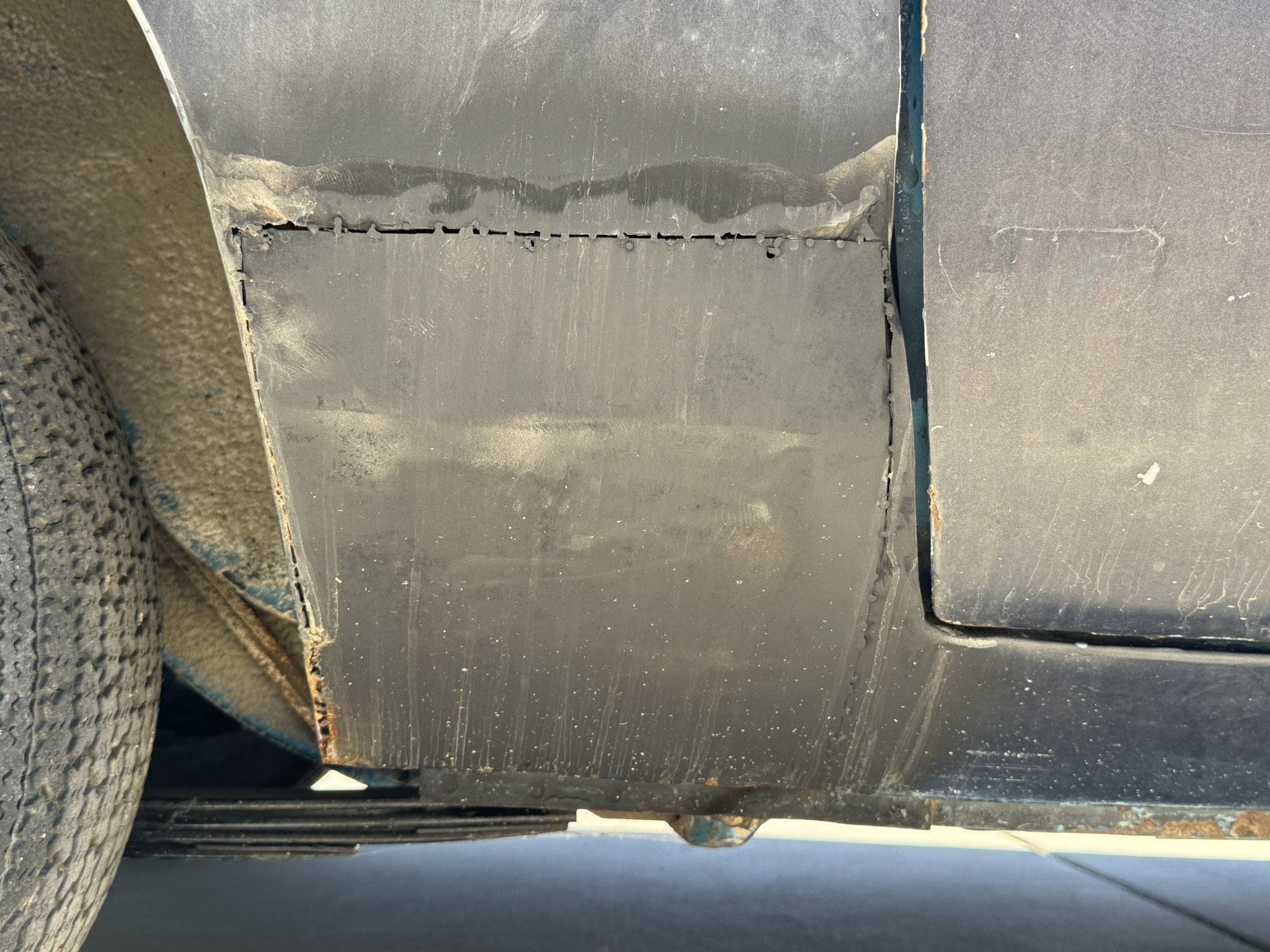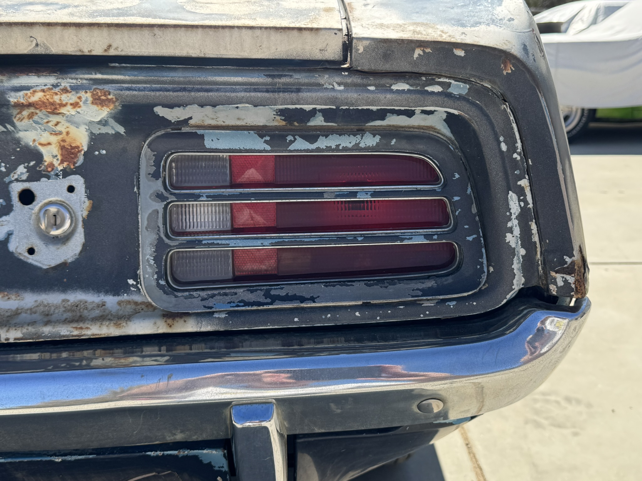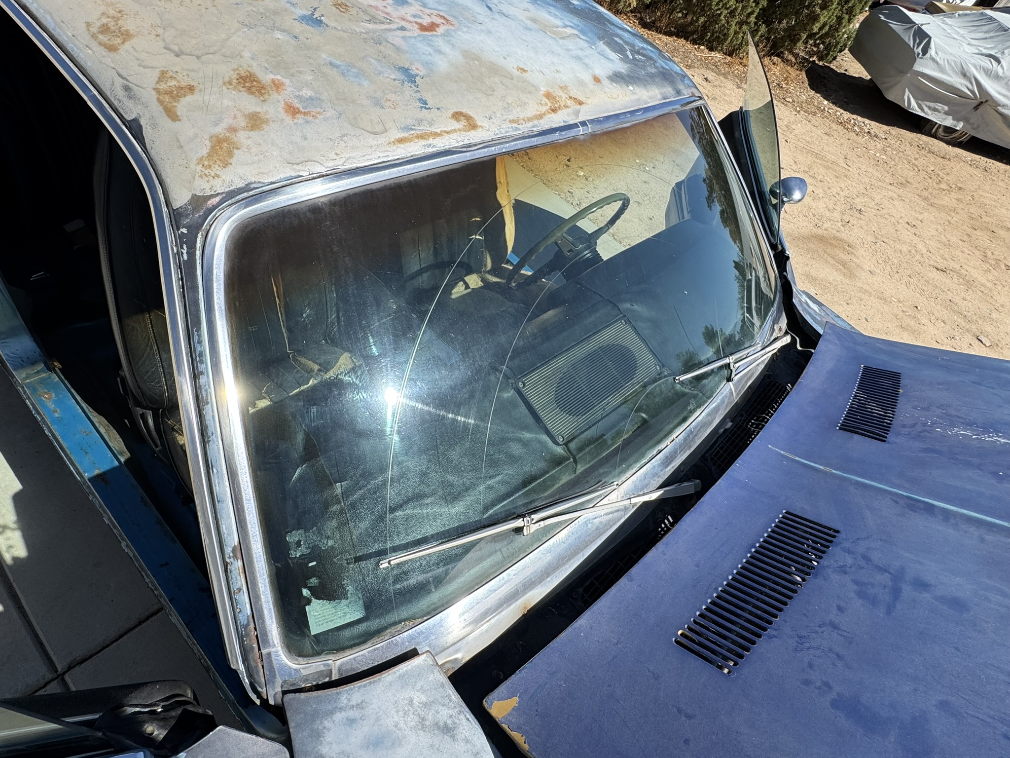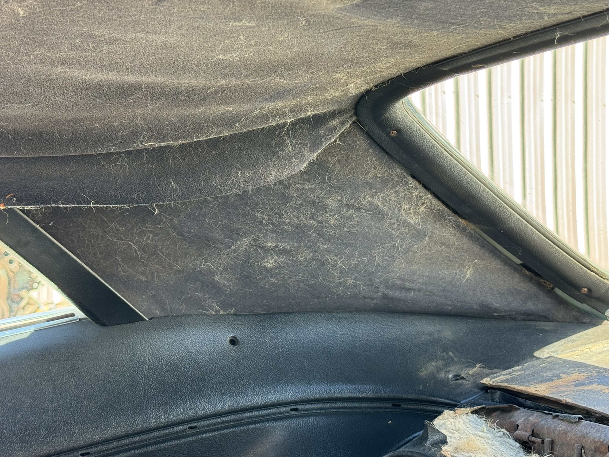 Bodywork will be focused on the passenger lower rear quarter where there is rust and the area that has a patch panel started. The rear part of the quarter can be repaired with patch panel. The factory seams on the roof need to be ground out and refilled. All new weather stripping is required. Both license plate brackets are included