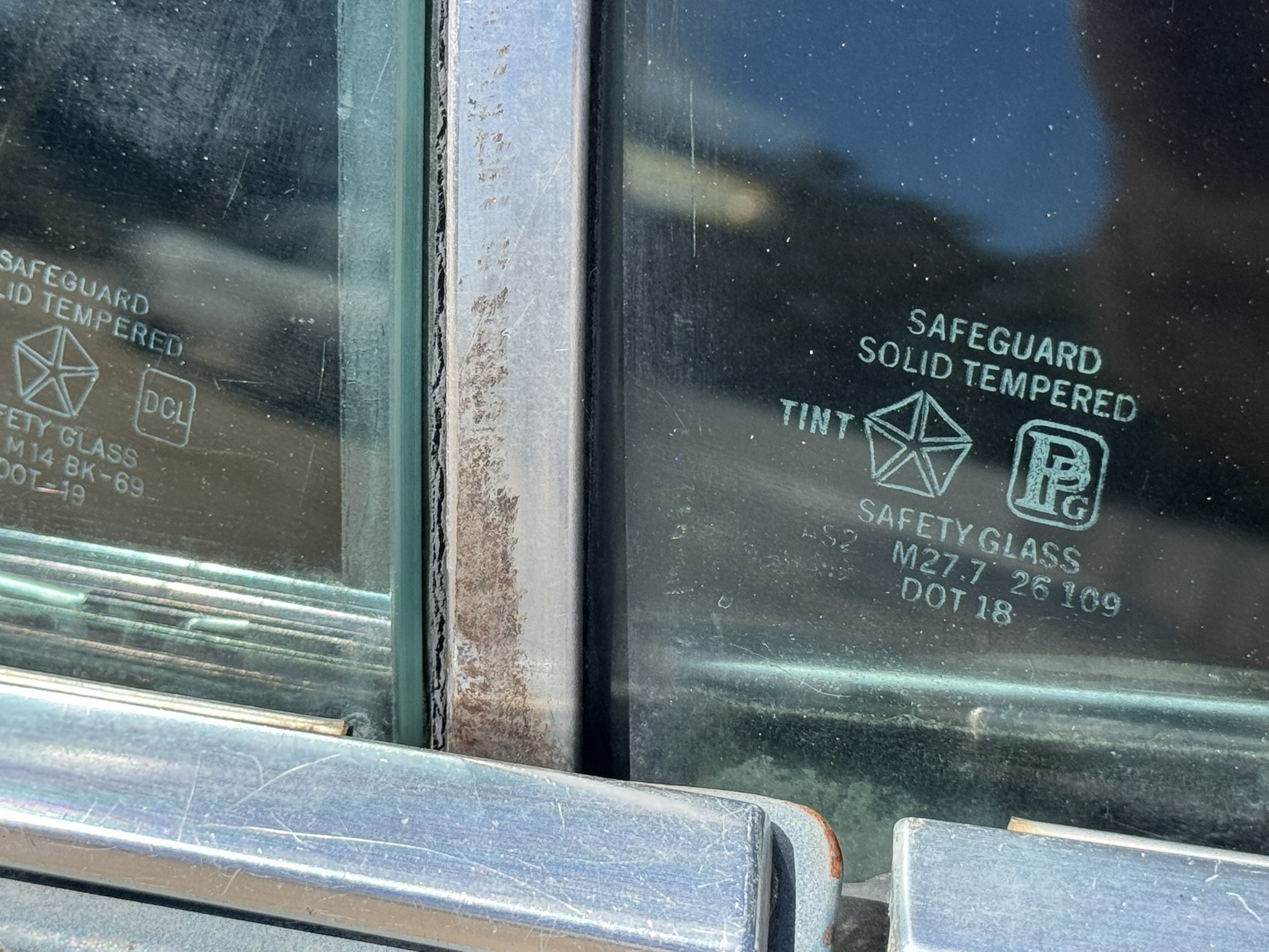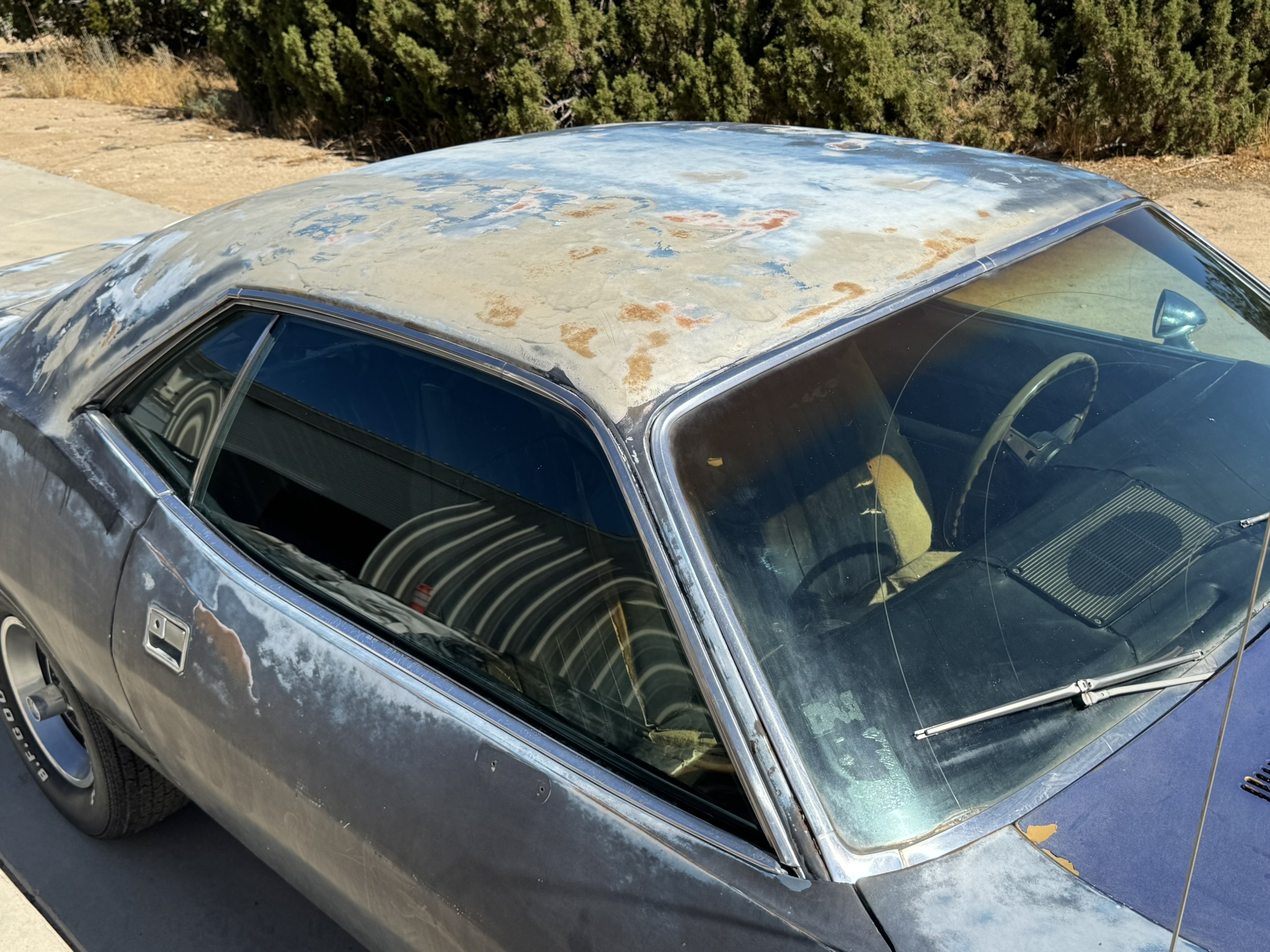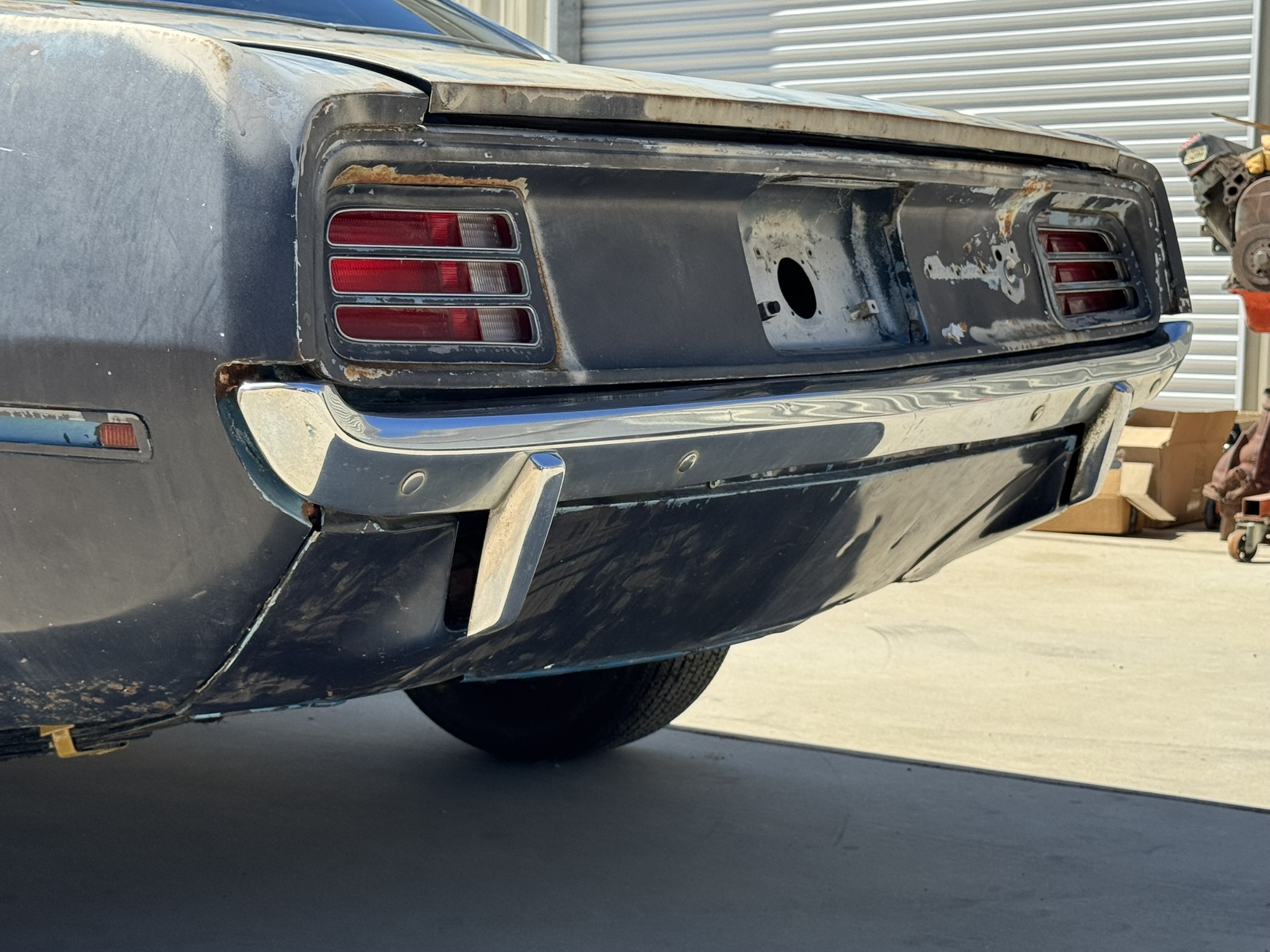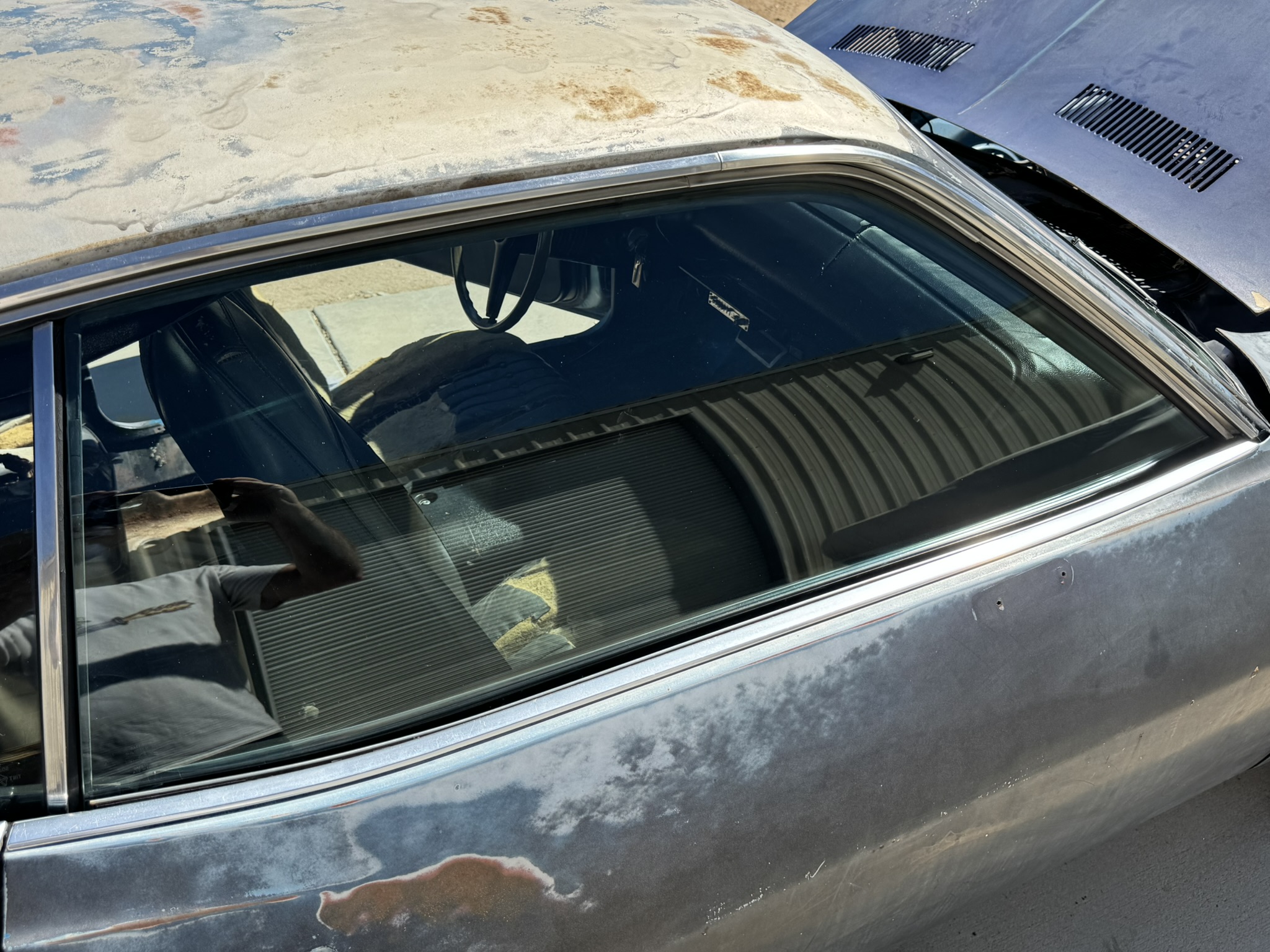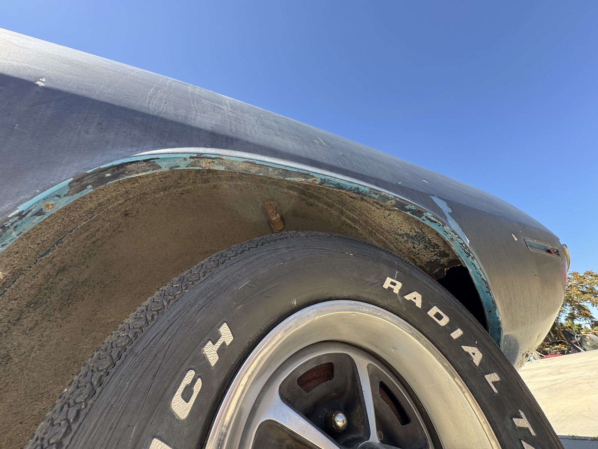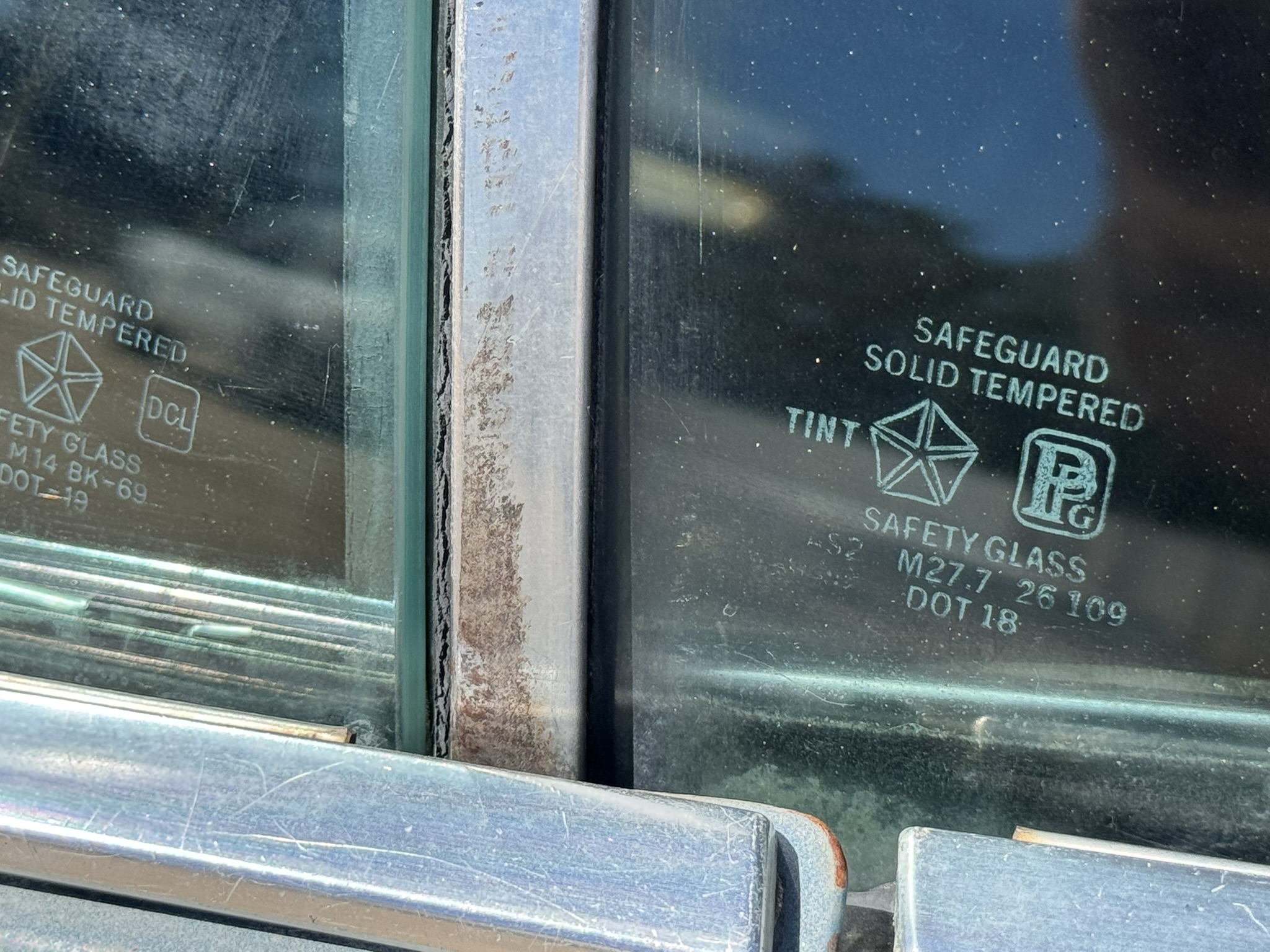 Bodywork will be focused on the passenger lower rear quarter where there is rust and the area that has a patch panel started. The rear part of the quarter can be repaired with patch panel. The factory seams on the roof need to be ground out and refilled. All new weather stripping is required. Both license plate brackets are included