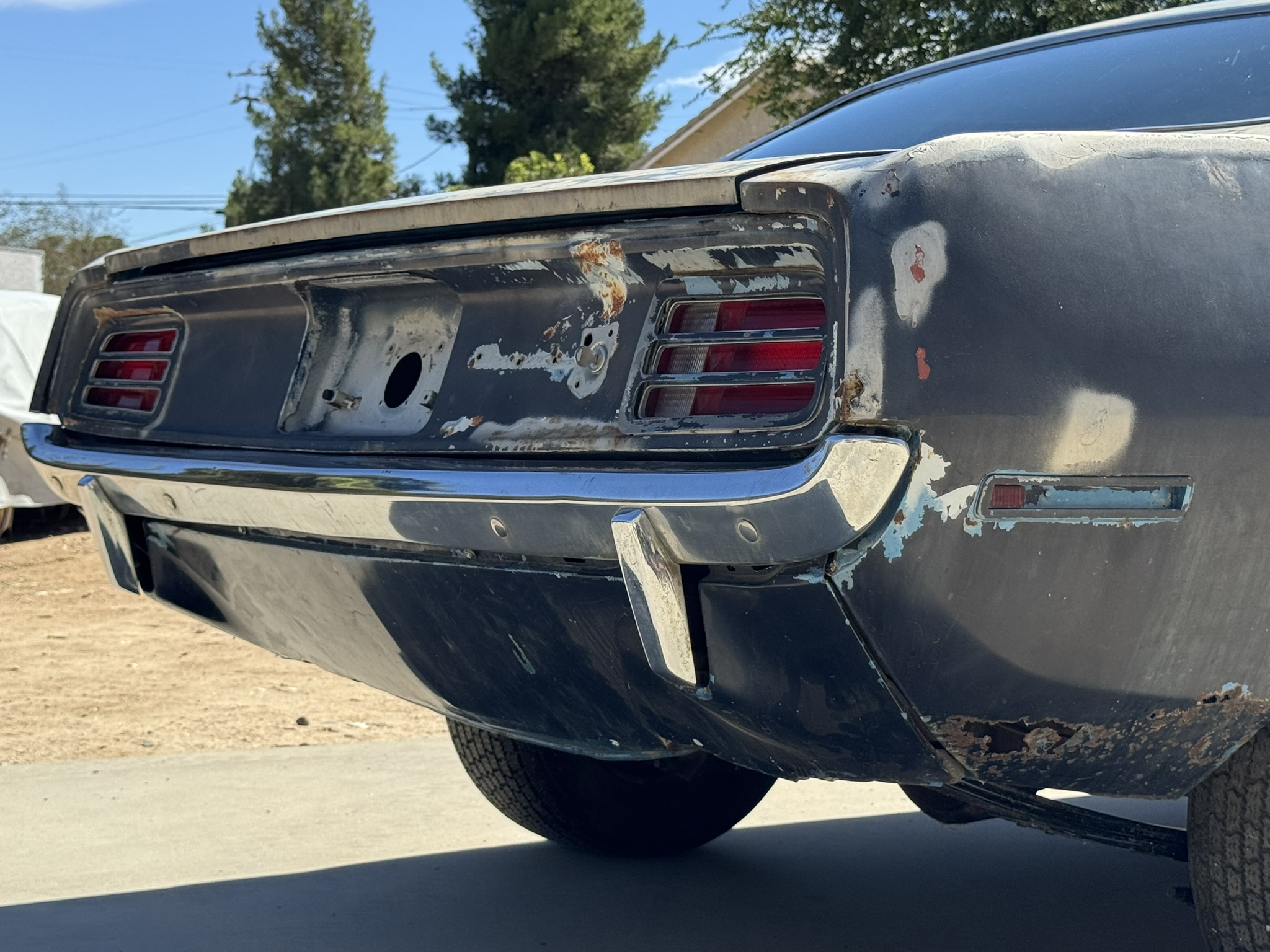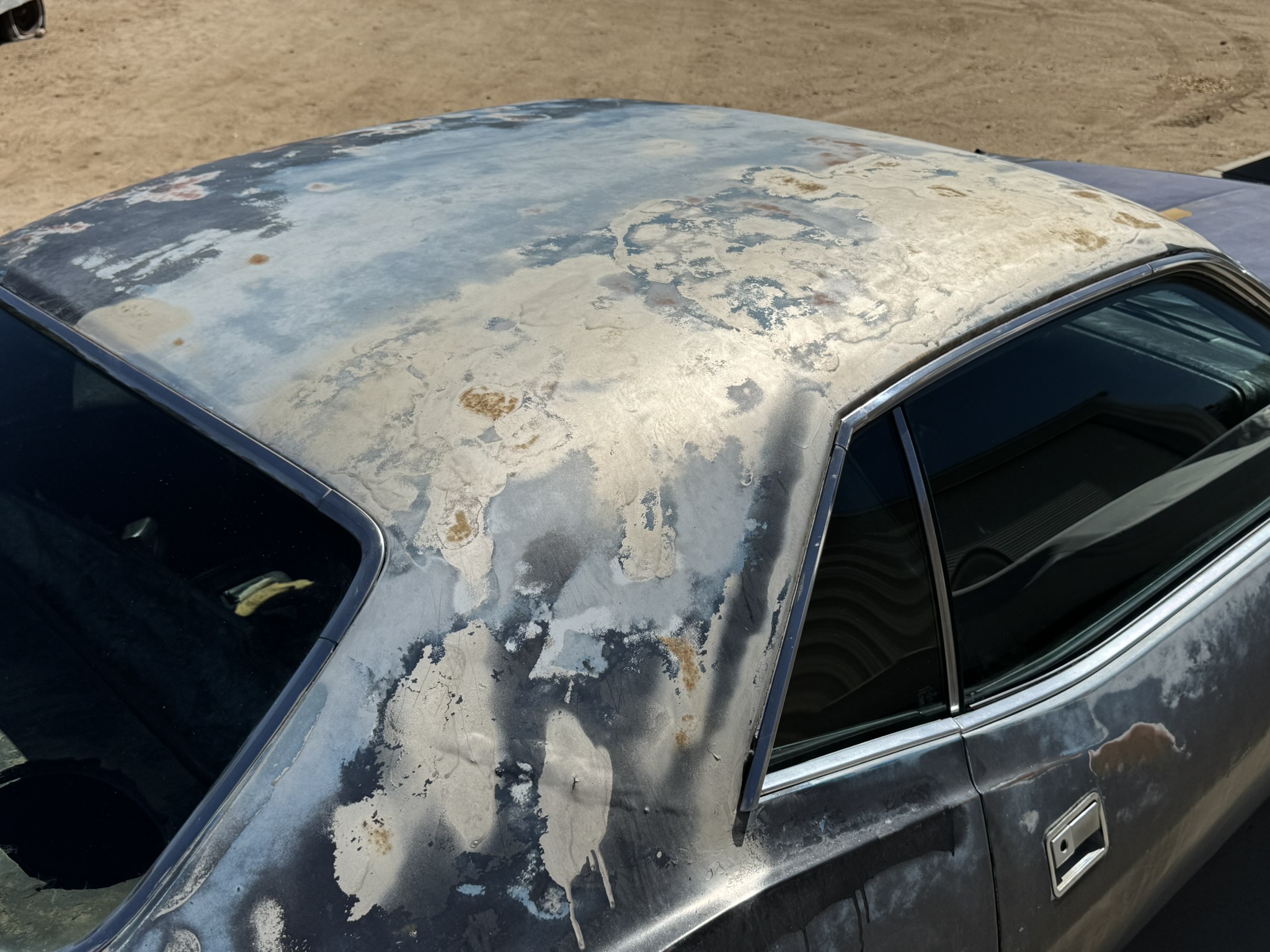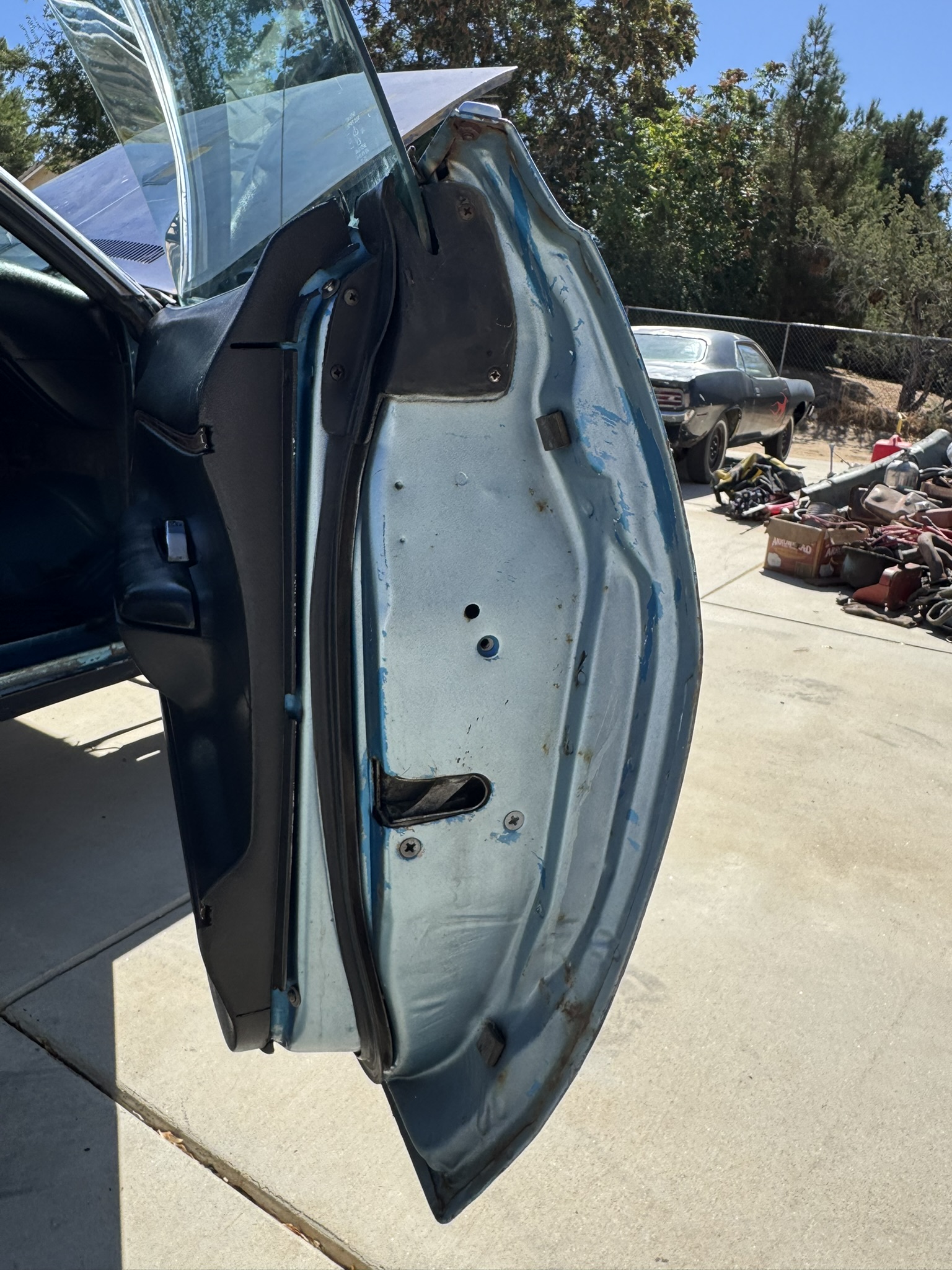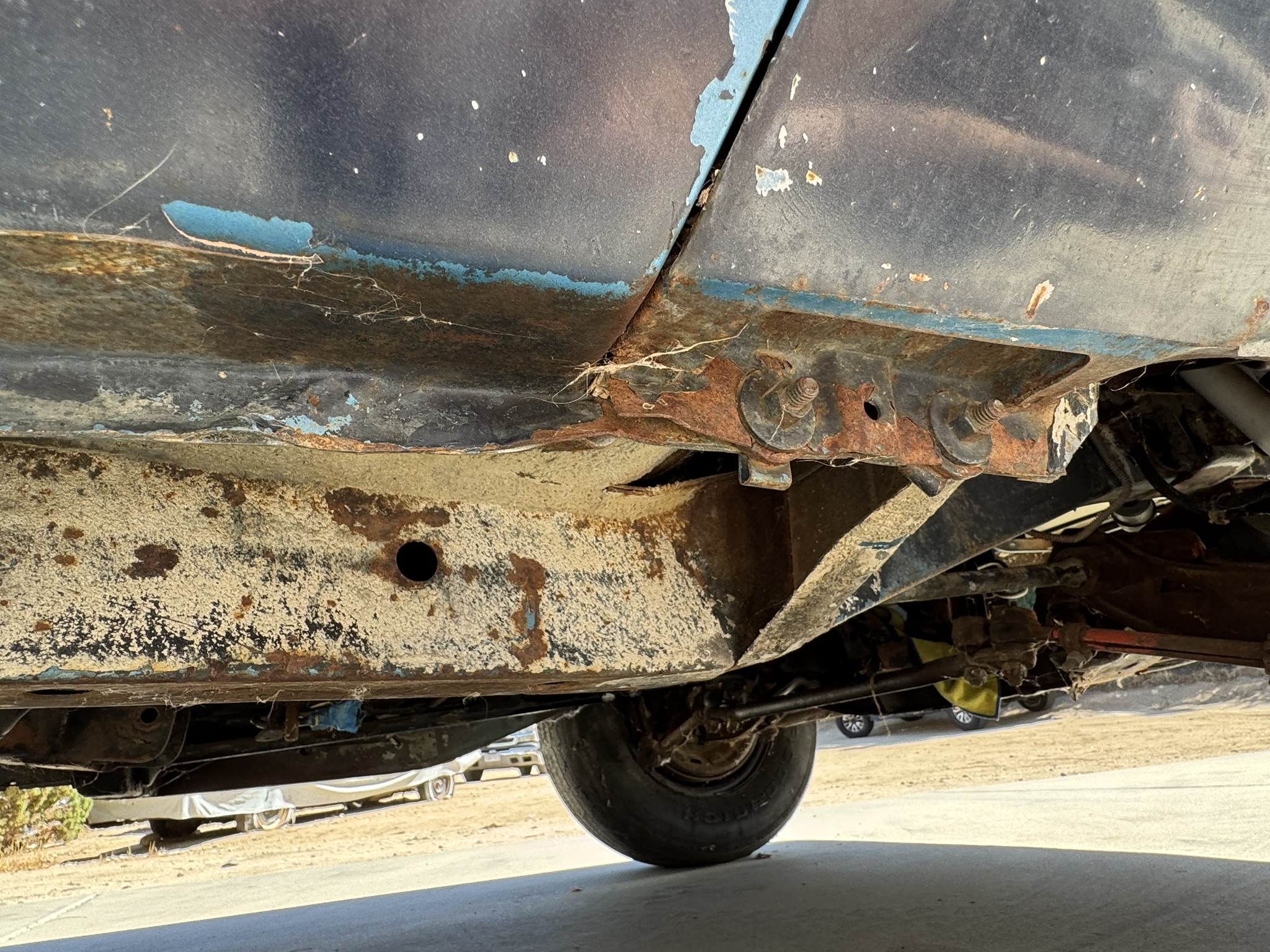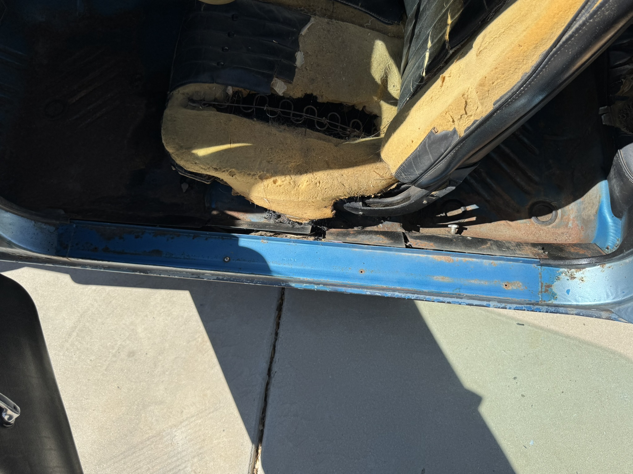 Bodywork will be focused on the passenger lower rear quarter where there is rust and the area that has a patch panel started. The rear part of the quarter can be repaired with patch panel. The factory seams on the roof need to be ground out and refilled. All new weather stripping is required. Both license plate brackets are included