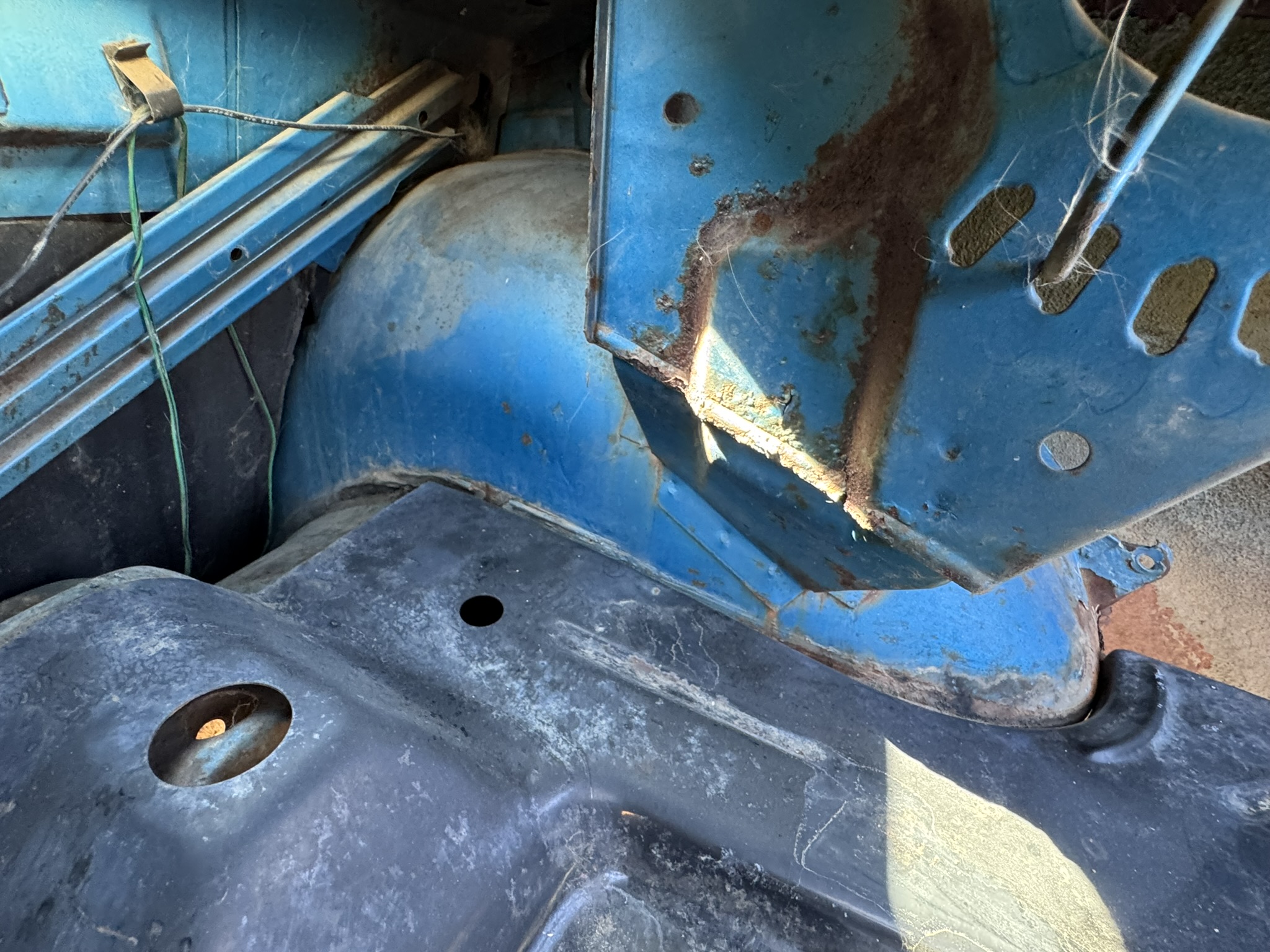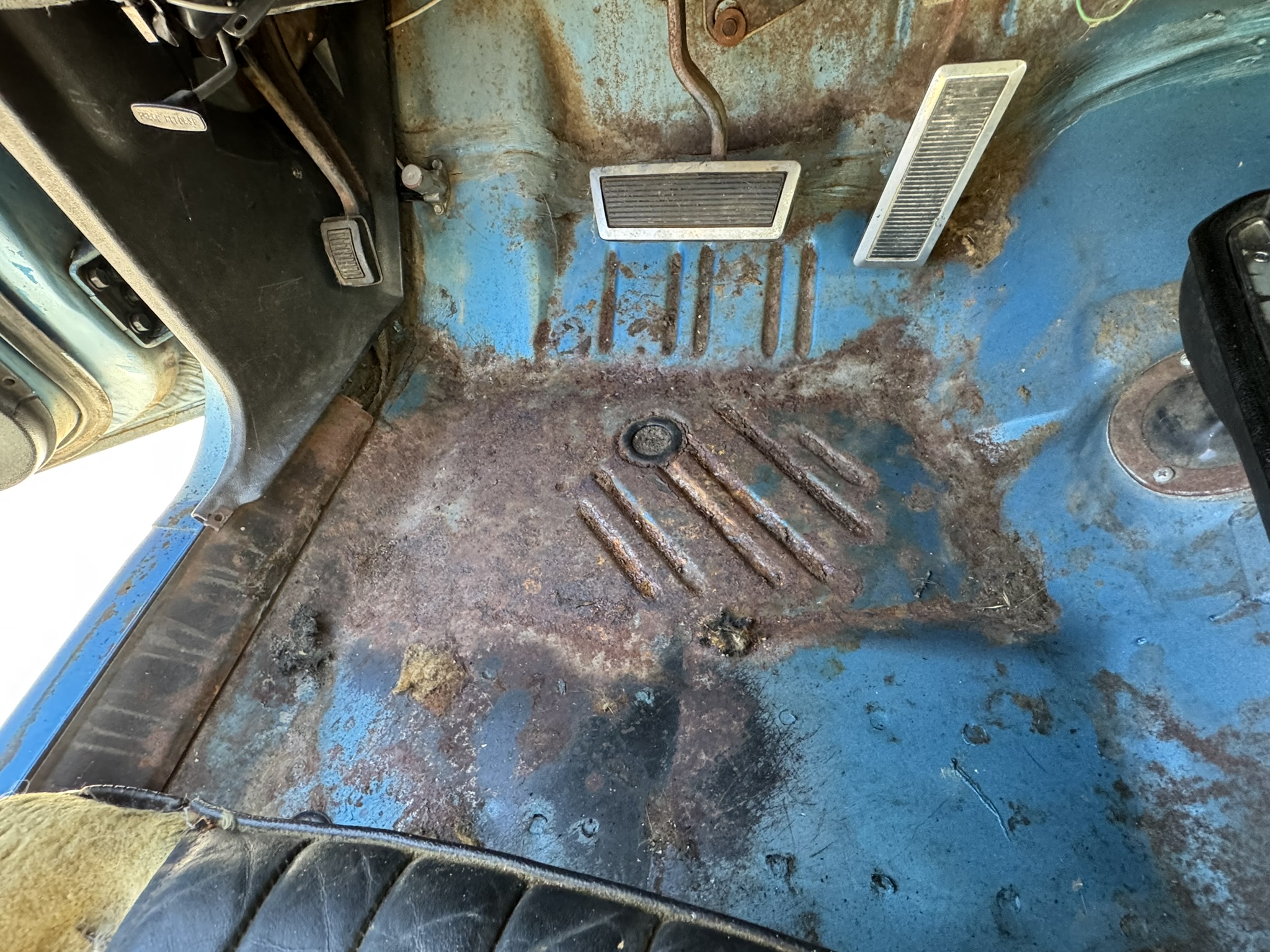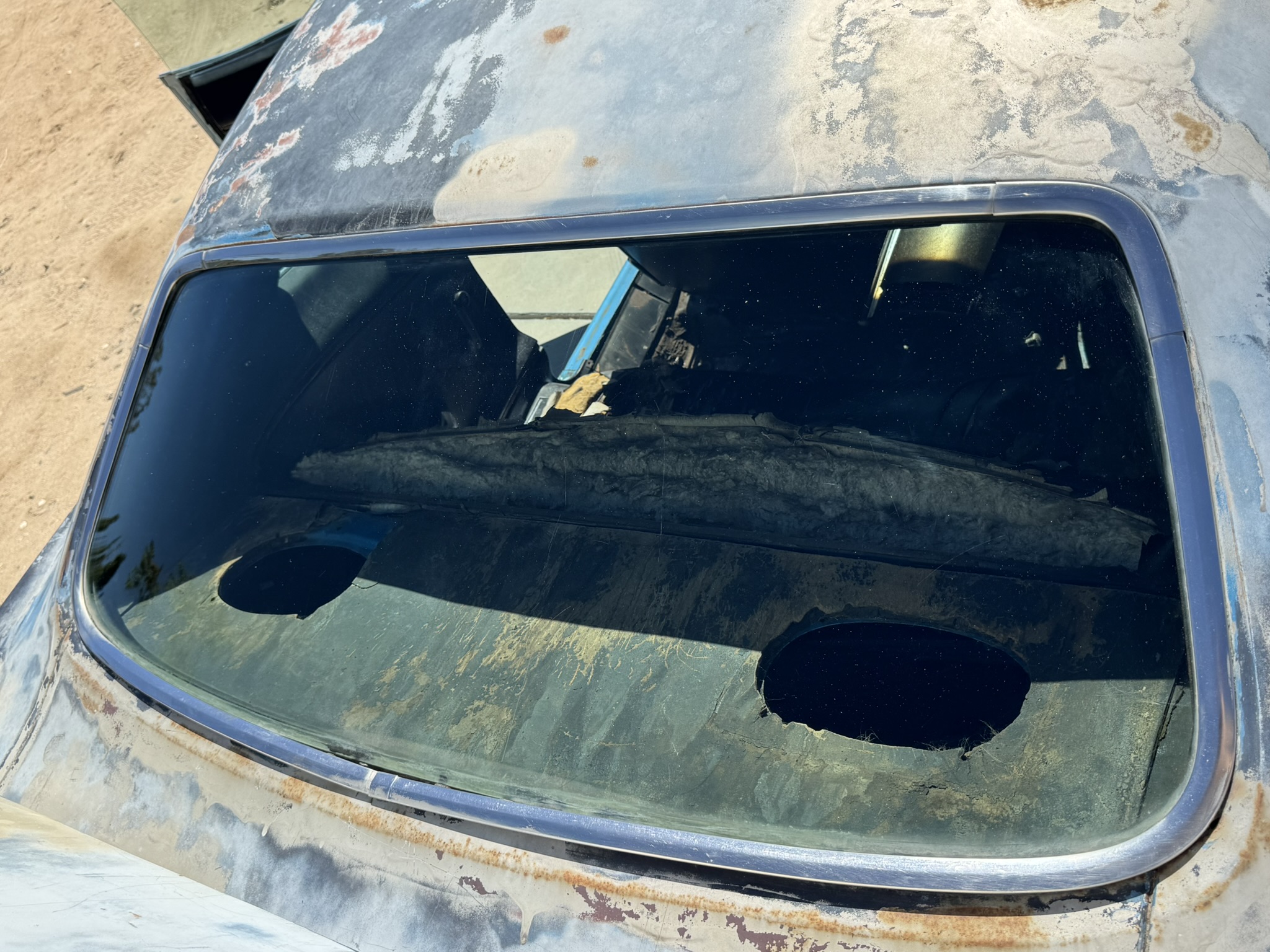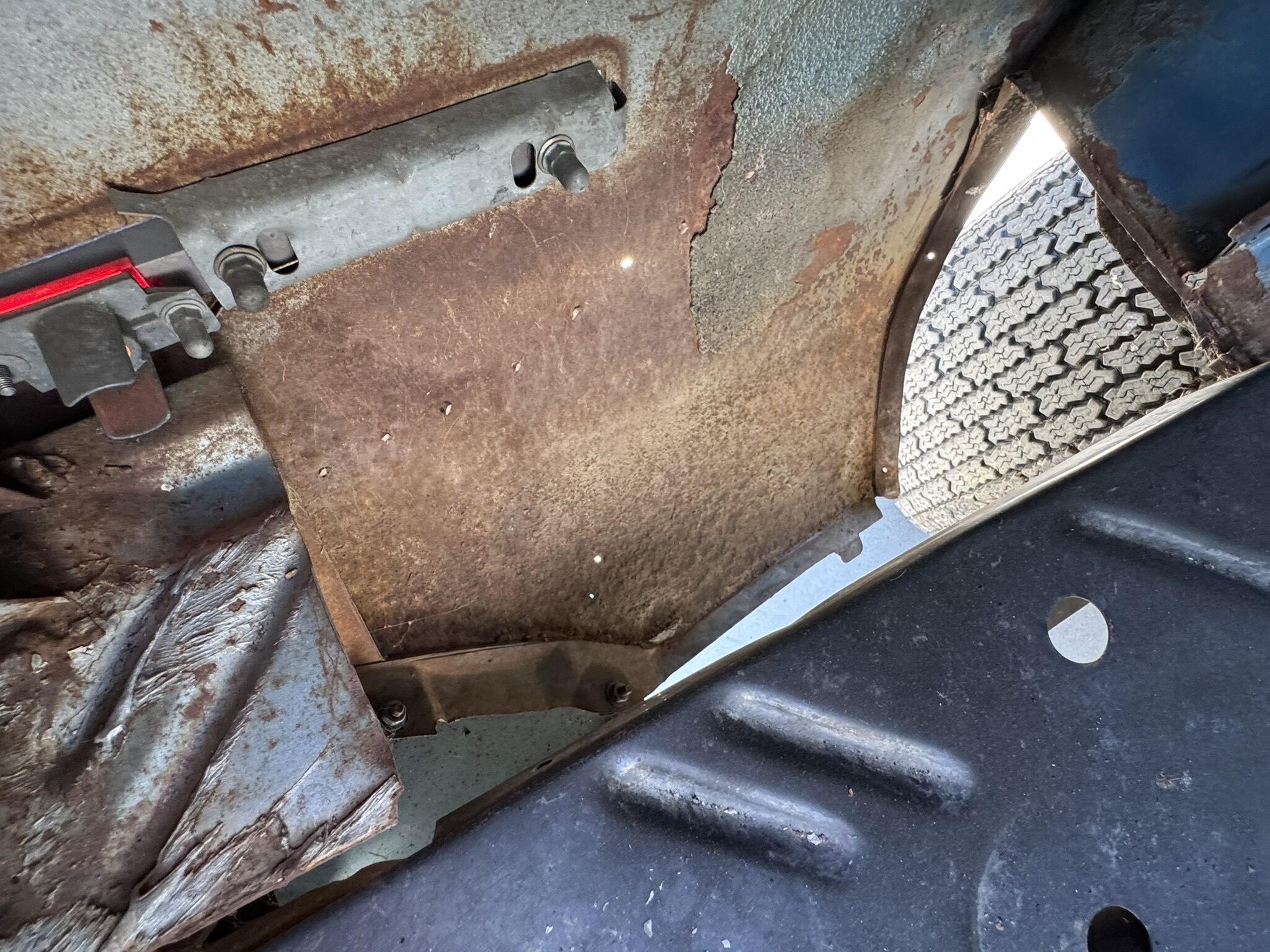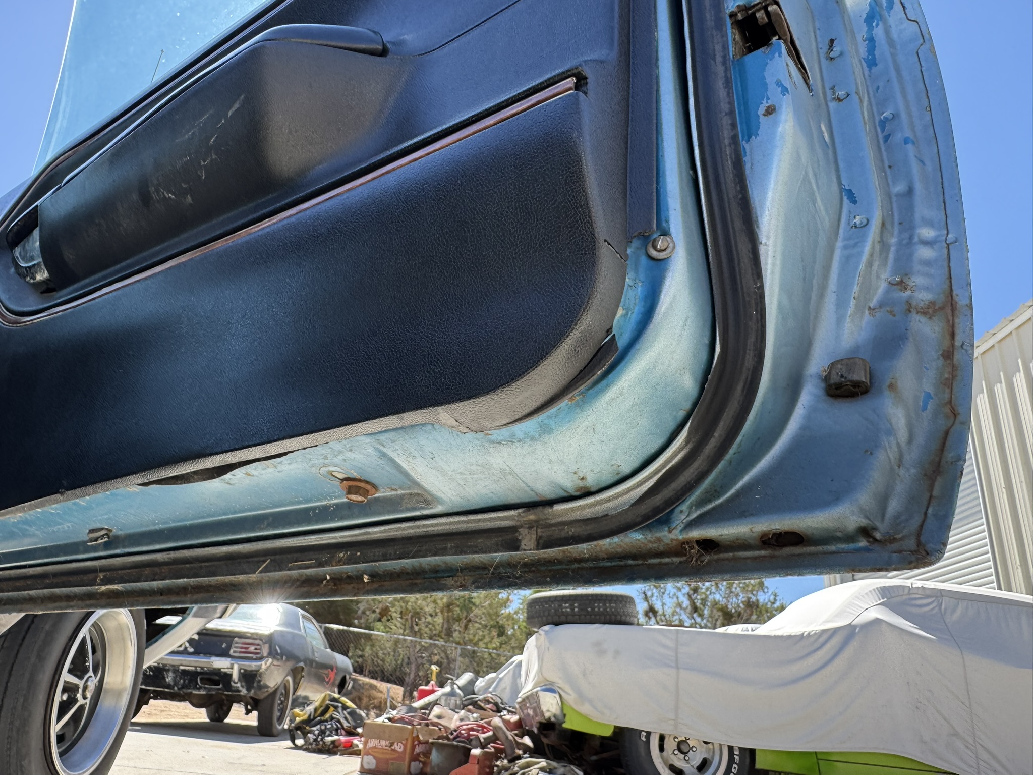 Bodywork will be focused on the passenger lower rear quarter where there is rust and the area that has a patch panel started. The rear part of the quarter can be repaired with patch panel. The factory seams on the roof need to be ground out and refilled. All new weather stripping is required. Both license plate brackets are included